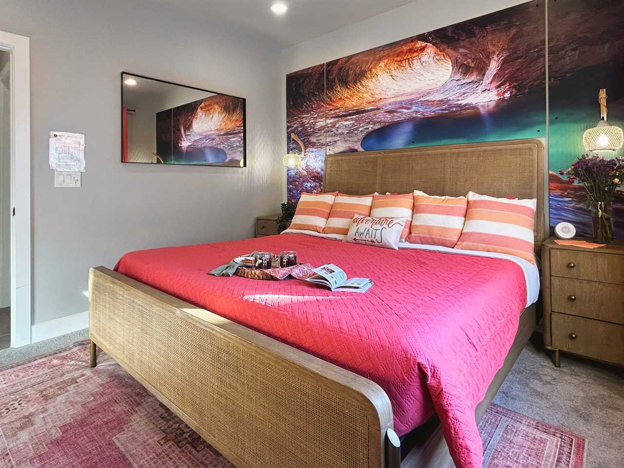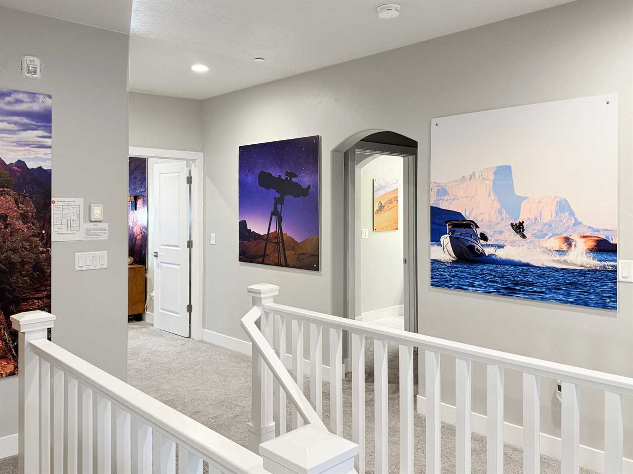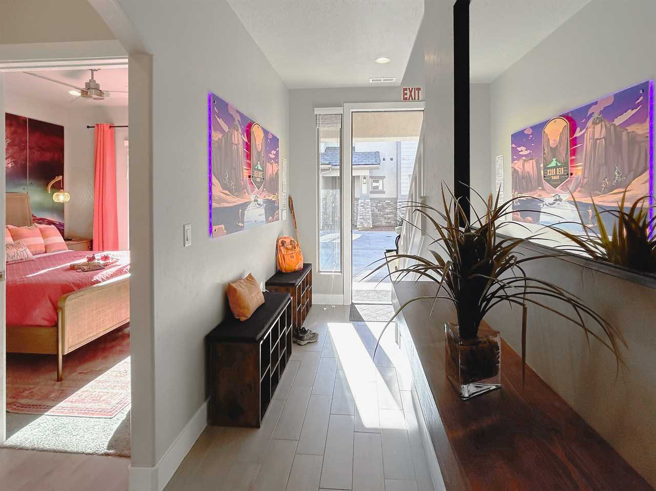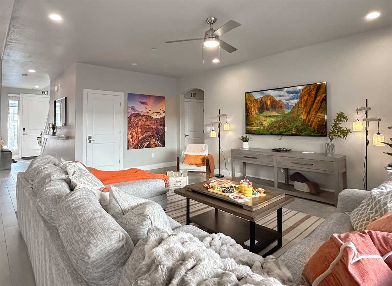 From the moment you step inside, you're greeted by custom artwork celebrating the region's stunning landscapes. The "Adventure Begins" welcome sign sets the tone for your stay, while the statement wall murals with LED-light features throughout the home bring the magnificent red rock country indoors.