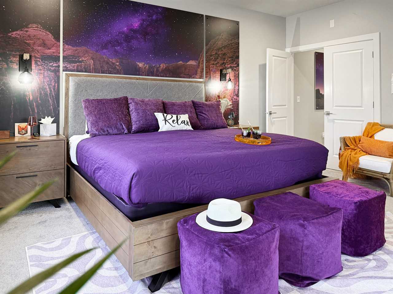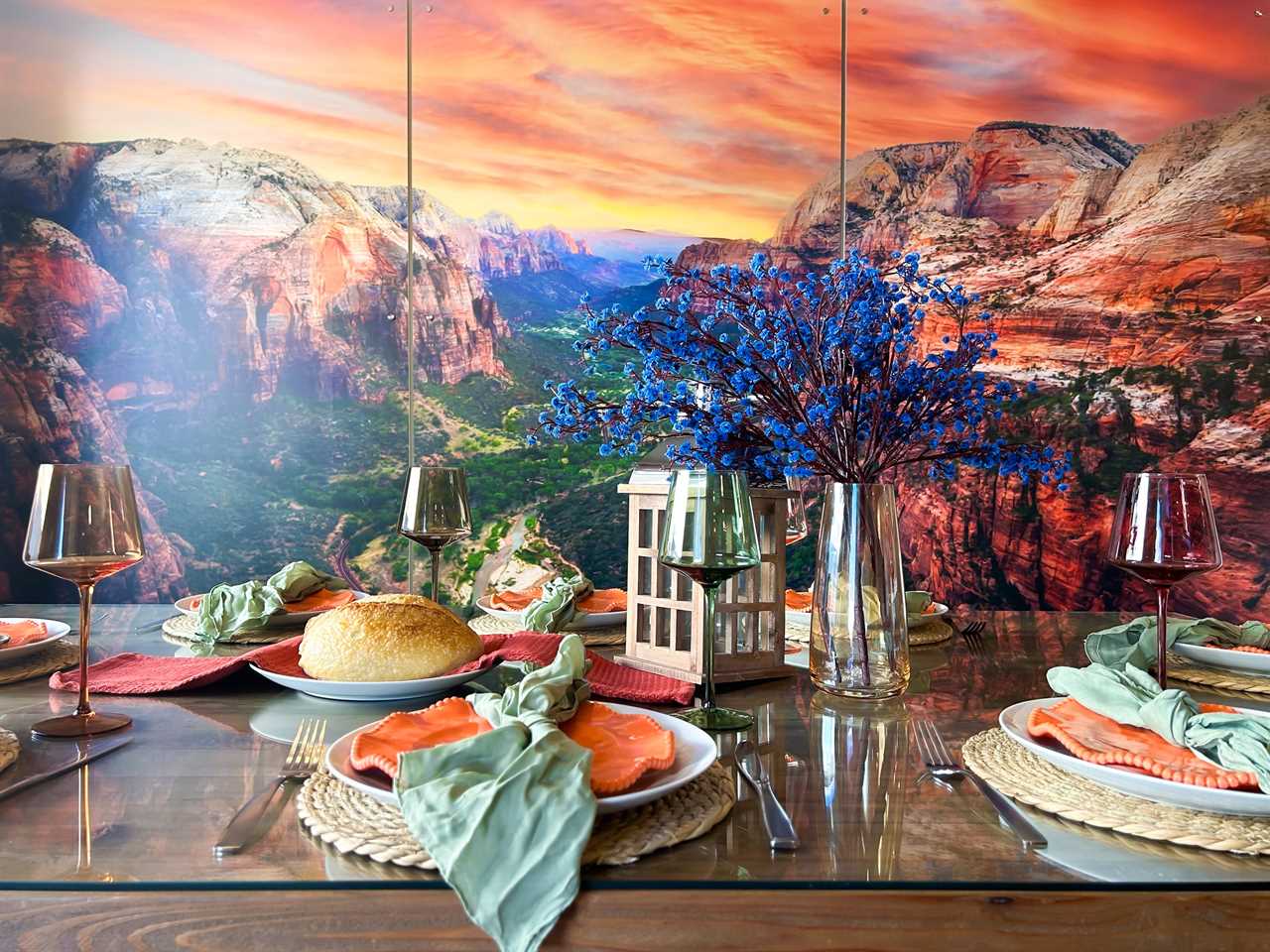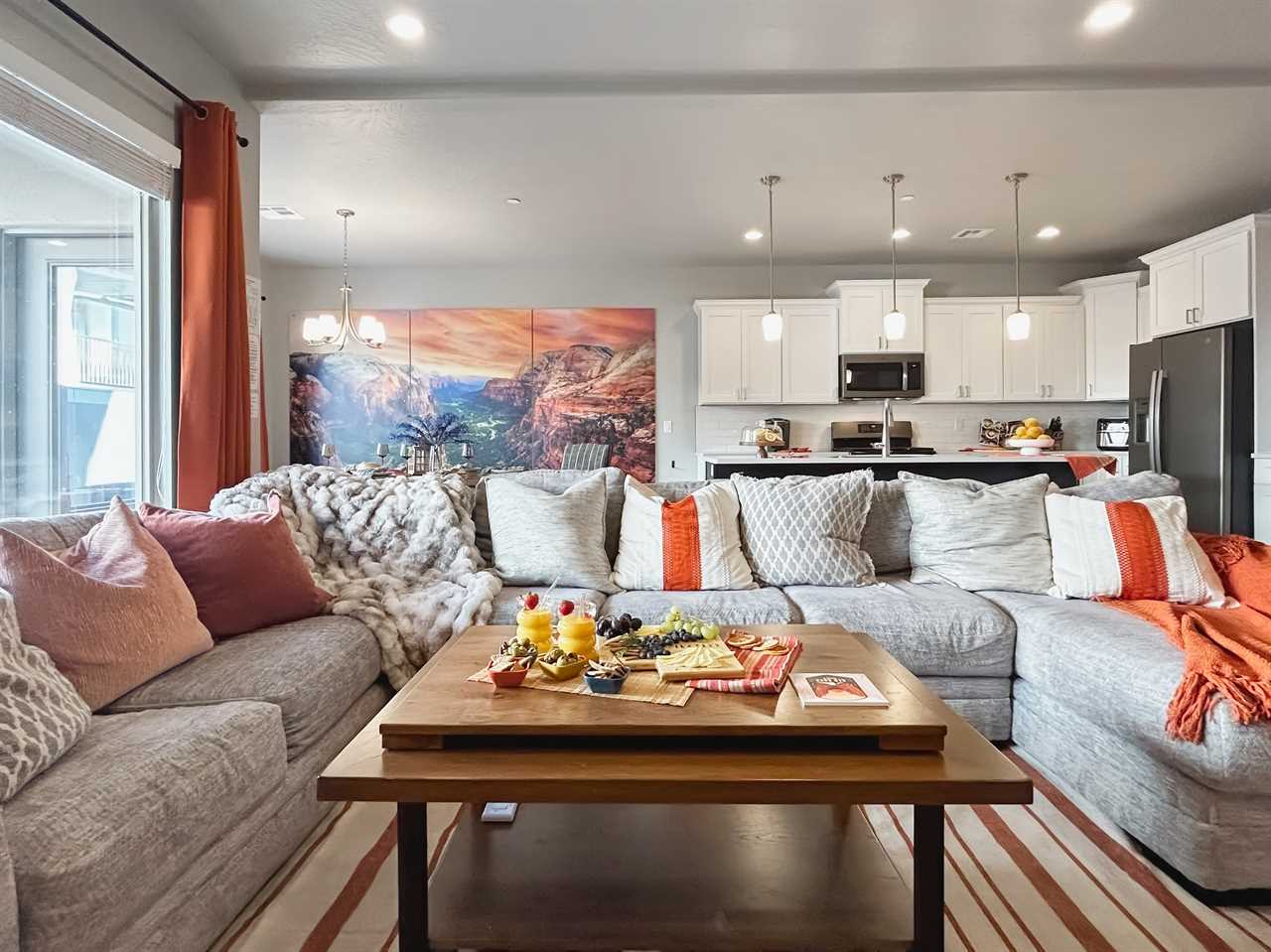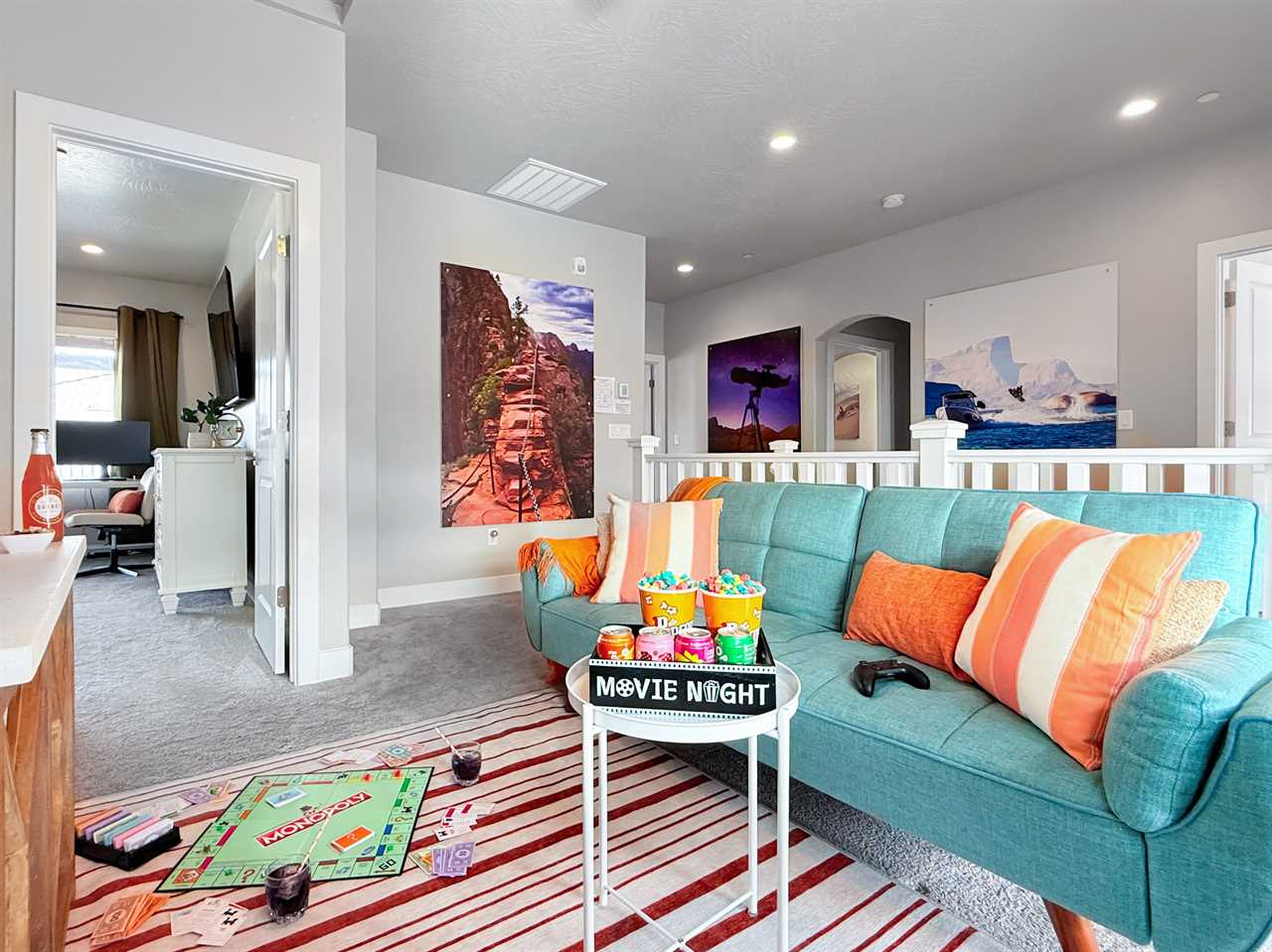 From the moment you step inside, you're greeted by custom artwork celebrating the region's stunning landscapes. The "Adventure Begins" welcome sign sets the tone for your stay, while the statement wall murals with LED-light features throughout the home bring the magnificent red rock country indoors.