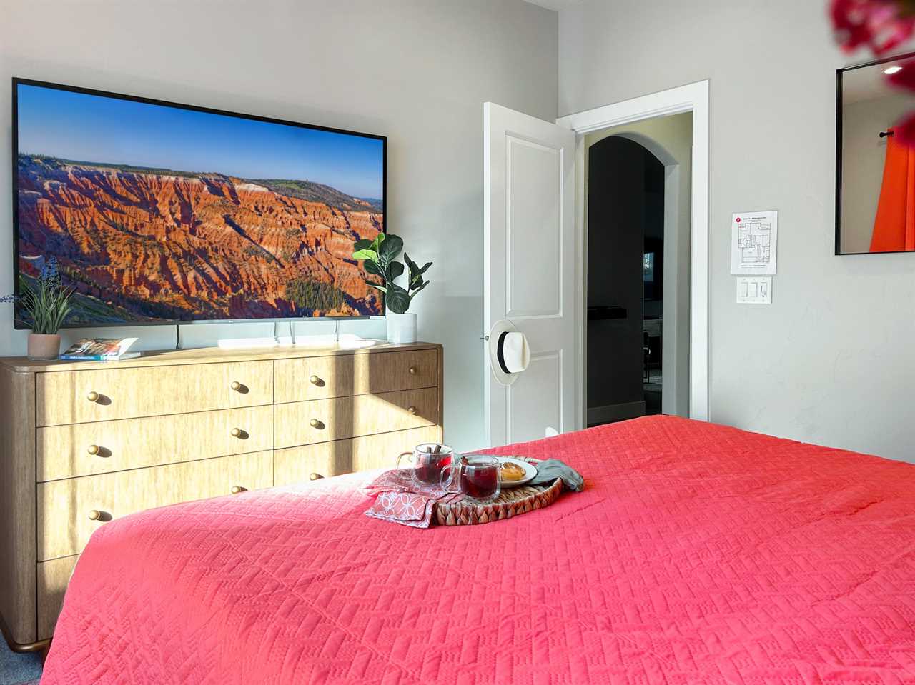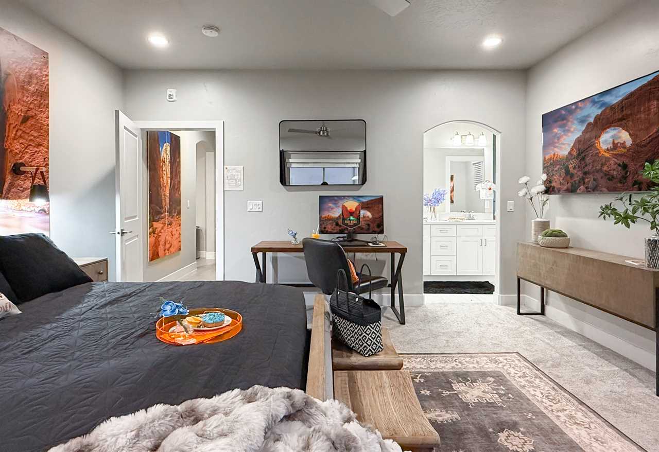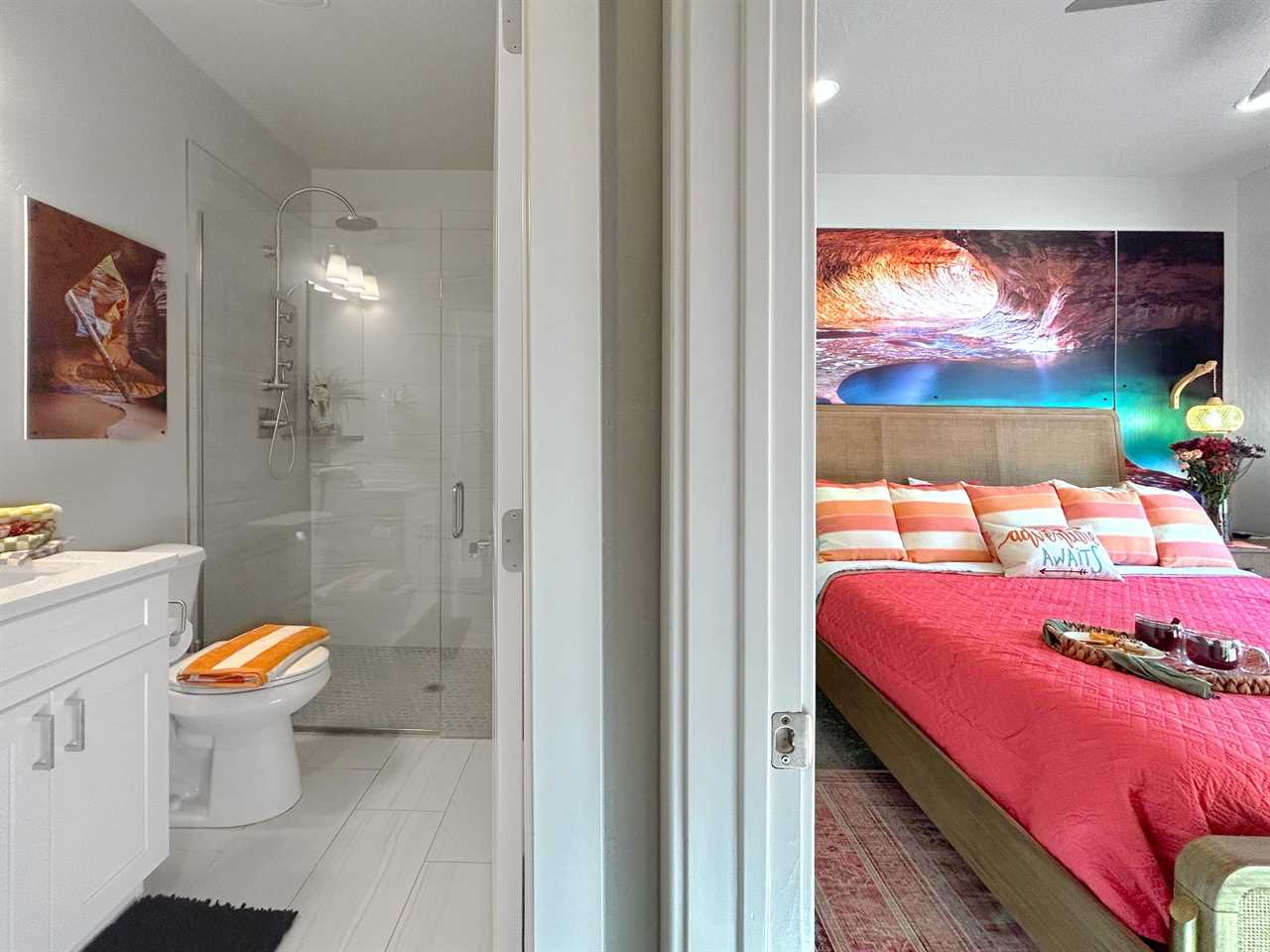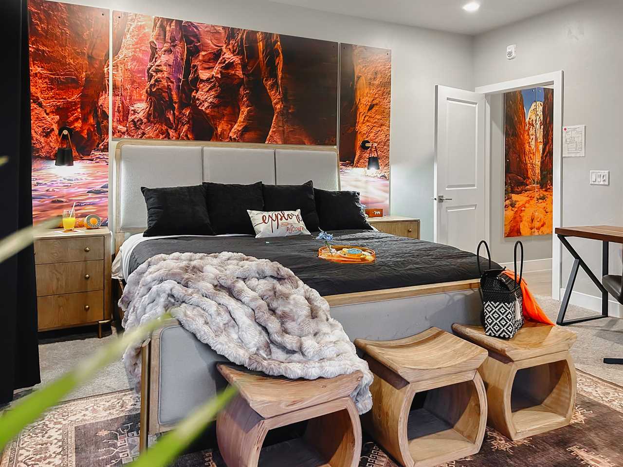 The downstairs “Zion Narrows” primary suite is right off the living room and it comes with a little office area, en-suite bathroom, and private patio access - perfect for those wanting a little moment to themselves with maybe the first cup of coffee of the day and a good book.