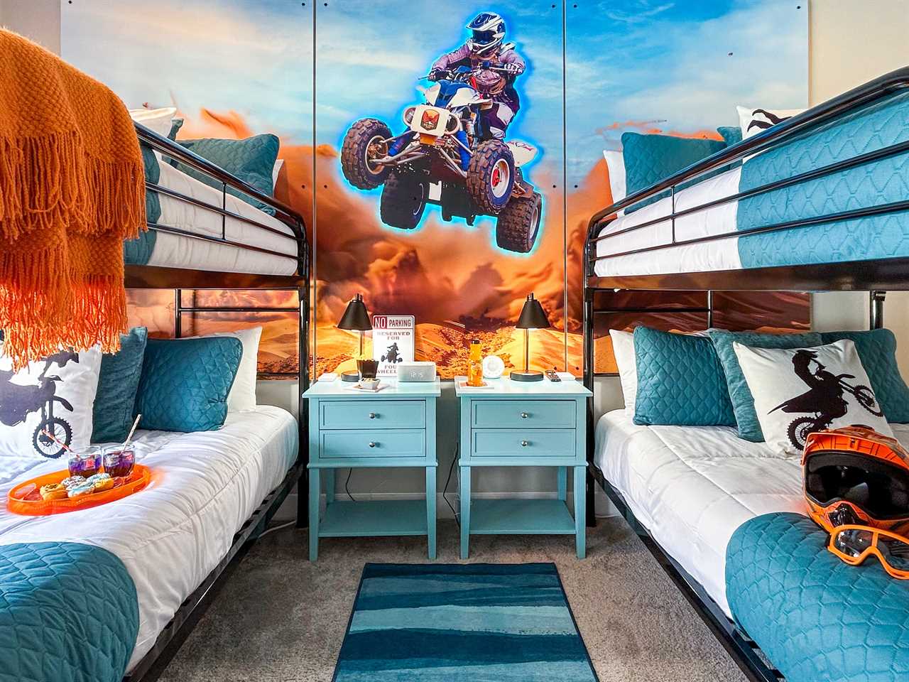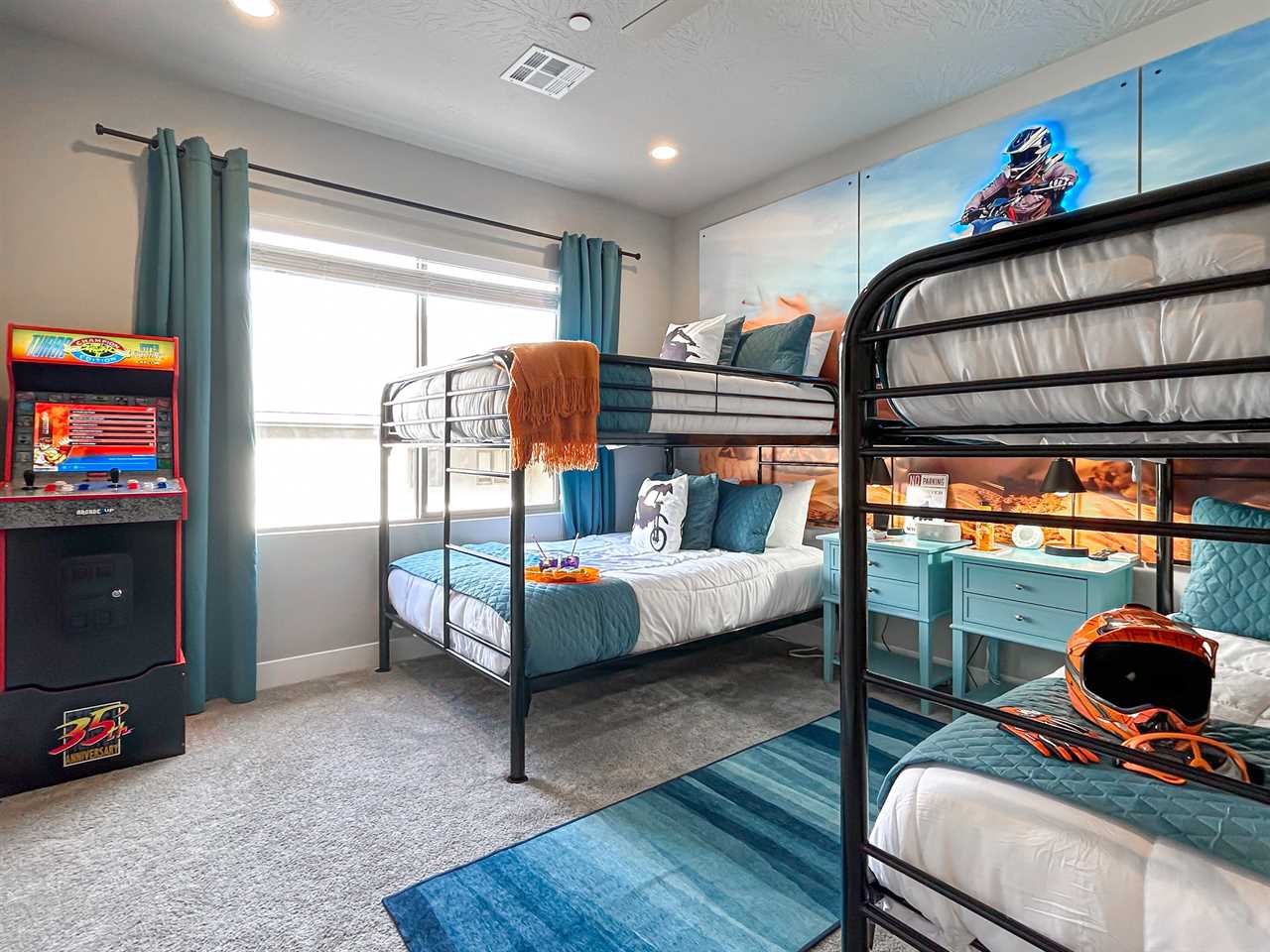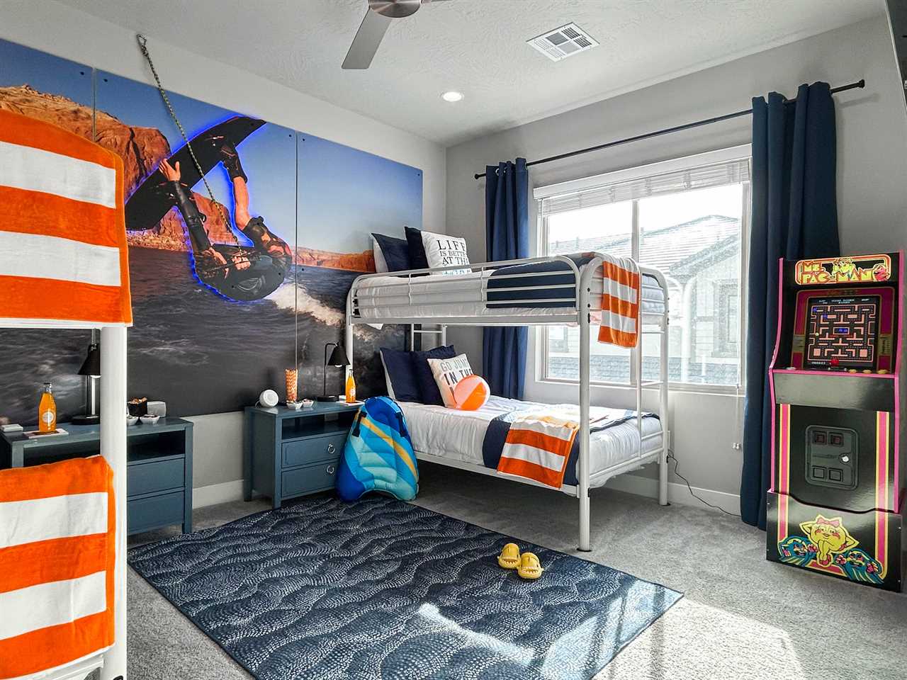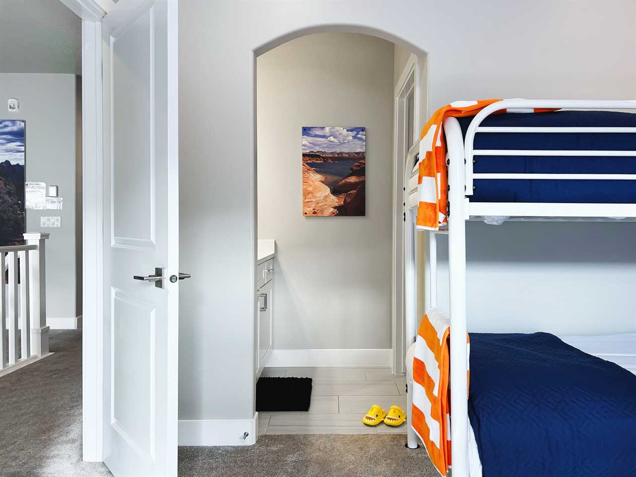 On the same hallway as Zion Night are the 2 bunk rooms, “Red Rock ATV” and “Red Rock Lake”. The ATV room has 2 double over double bunk beds and its own private vanity. The Lake room has 2 twin over twin bunk beds and its own private vanity. The rooms share a Jack and Jill bathroom. Both come with eye-catching wall art, 2 nightstands, and a standing arcade game!