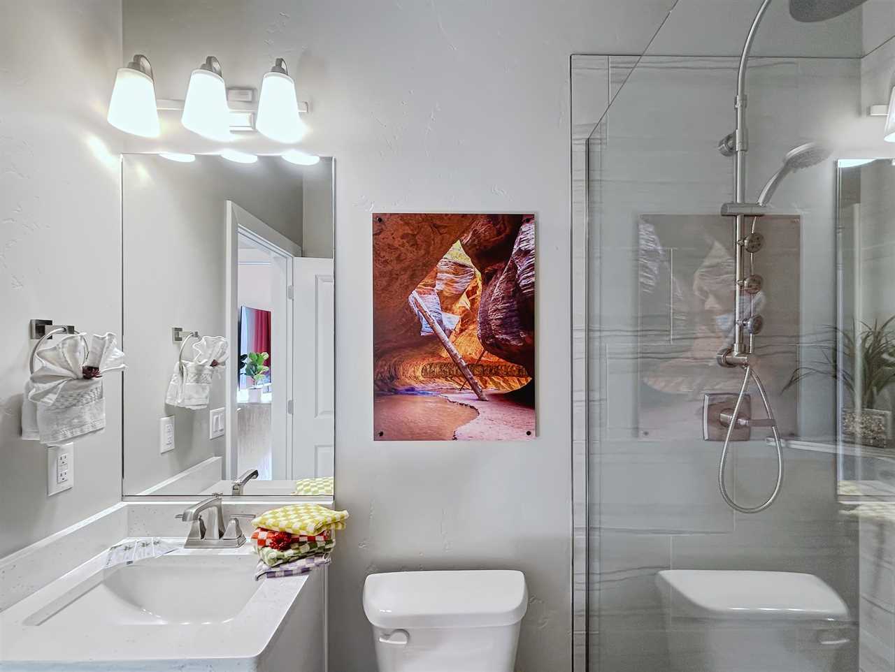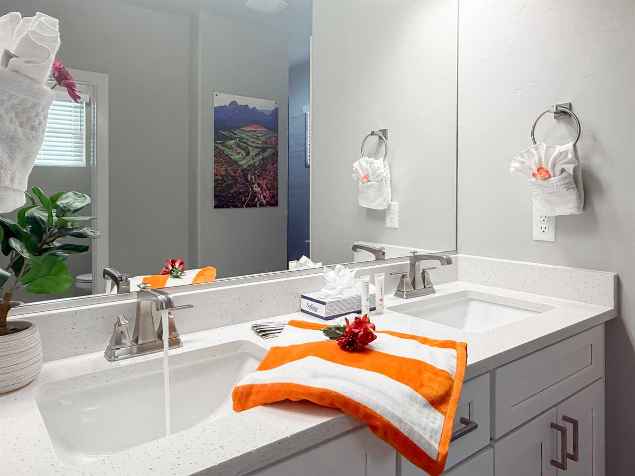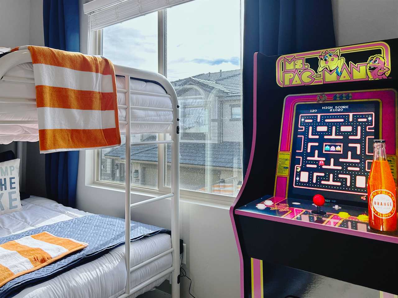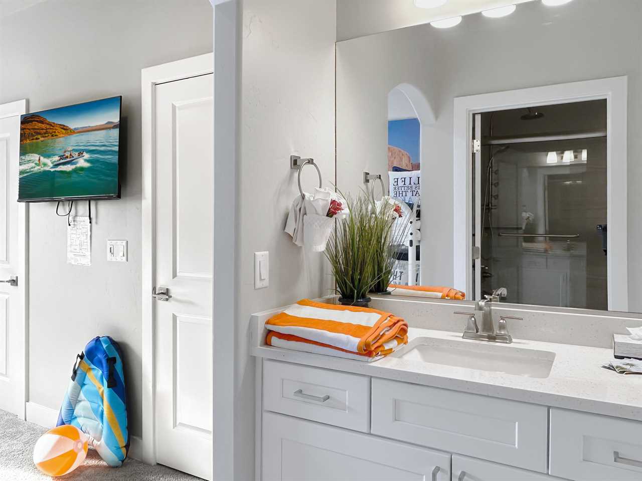 On the same hallway as Zion Night are the 2 bunk rooms, “Red Rock ATV” and “Red Rock Lake”. The ATV room has 2 double over double bunk beds and its own private vanity. The Lake room has 2 twin over twin bunk beds and its own private vanity. The rooms share a Jack and Jill bathroom. Both come with eye-catching wall art, 2 nightstands, and a standing arcade game!