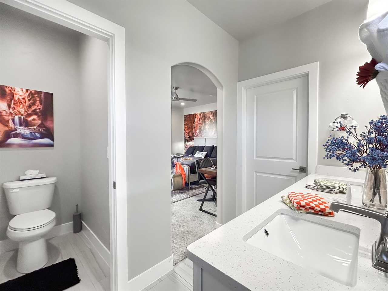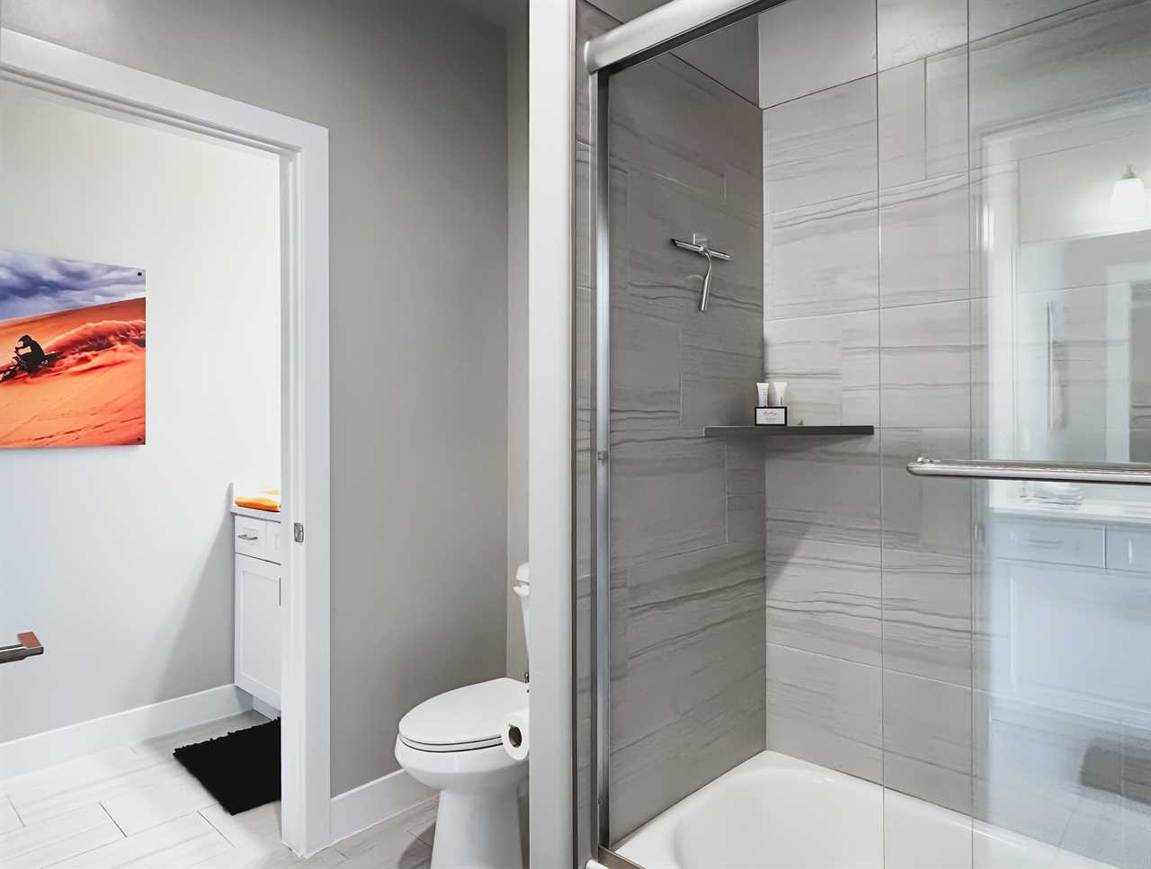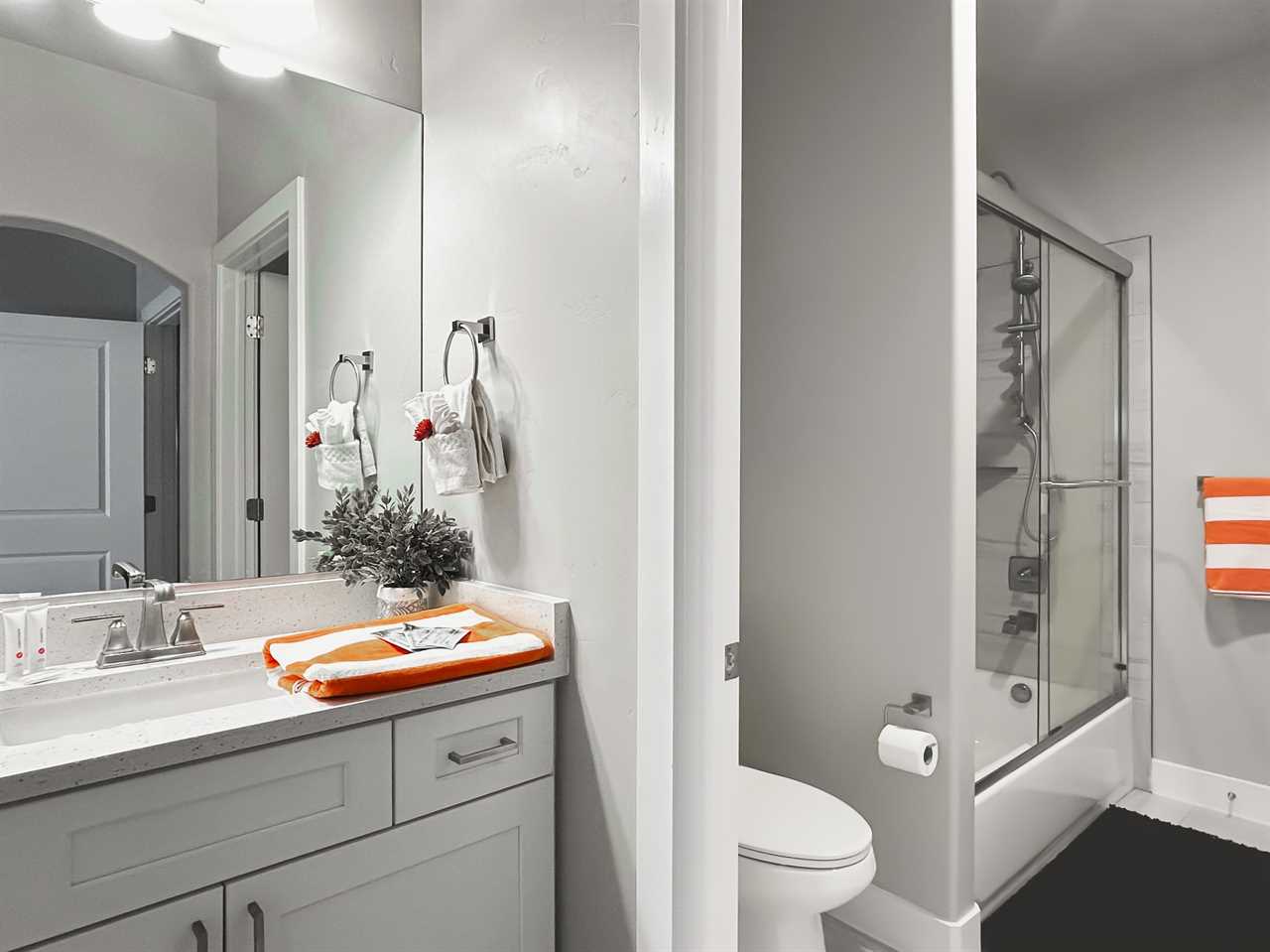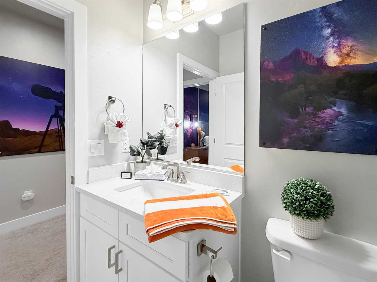 On the same hallway as Zion Night are the 2 bunk rooms, “Red Rock ATV” and “Red Rock Lake”. The ATV room has 2 double over double bunk beds and its own private vanity. The Lake room has 2 twin over twin bunk beds and its own private vanity. The rooms share a Jack and Jill bathroom. Both come with eye-catching wall art, 2 nightstands, and a standing arcade game!