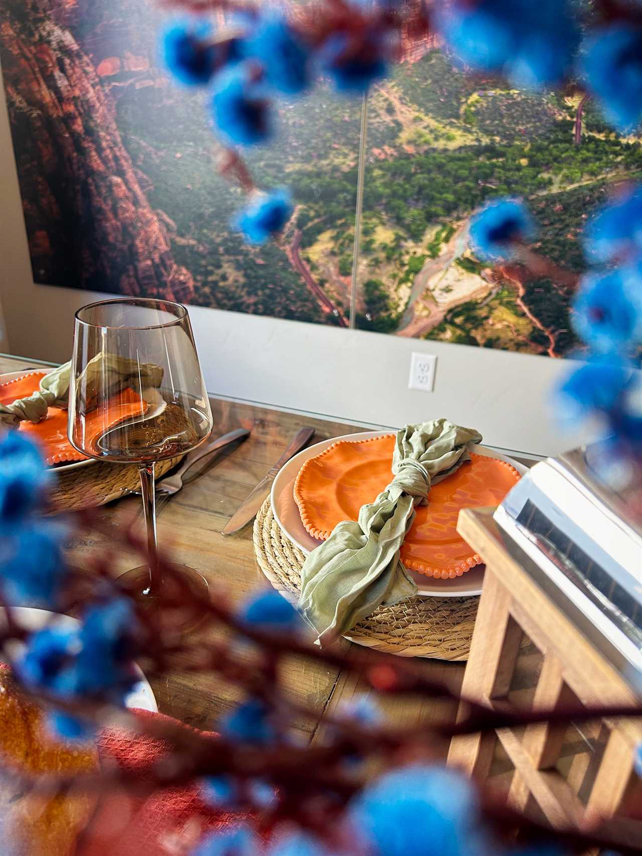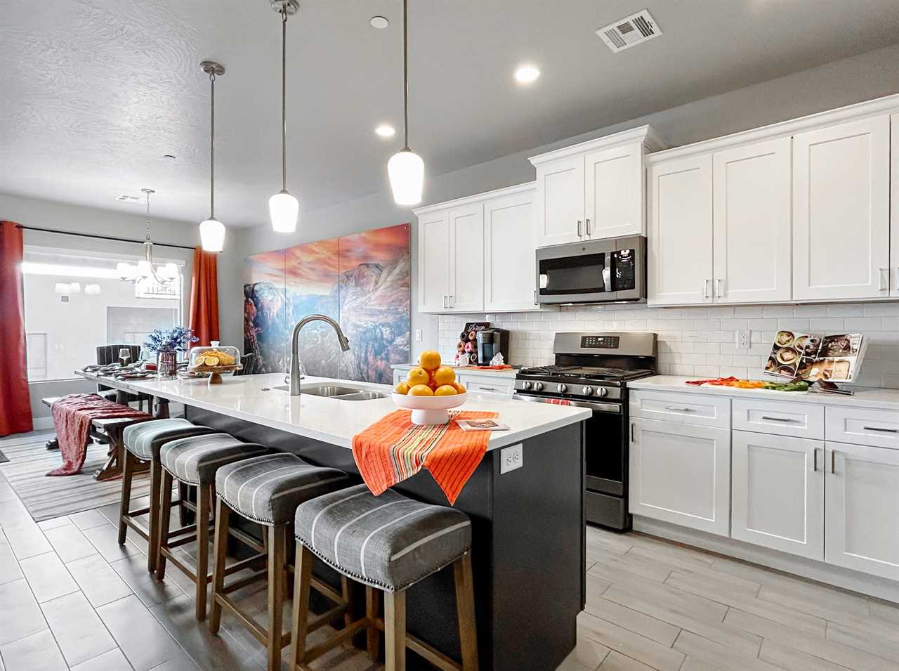 The expansive island with seating for 4 makes meal prep a social affair, while white cabinetry and quartz countertops reflect the natural light streaming through the windows. We love how the dramatic red rock artwork creates an artistic backdrop for morning coffee or evening gatherings.