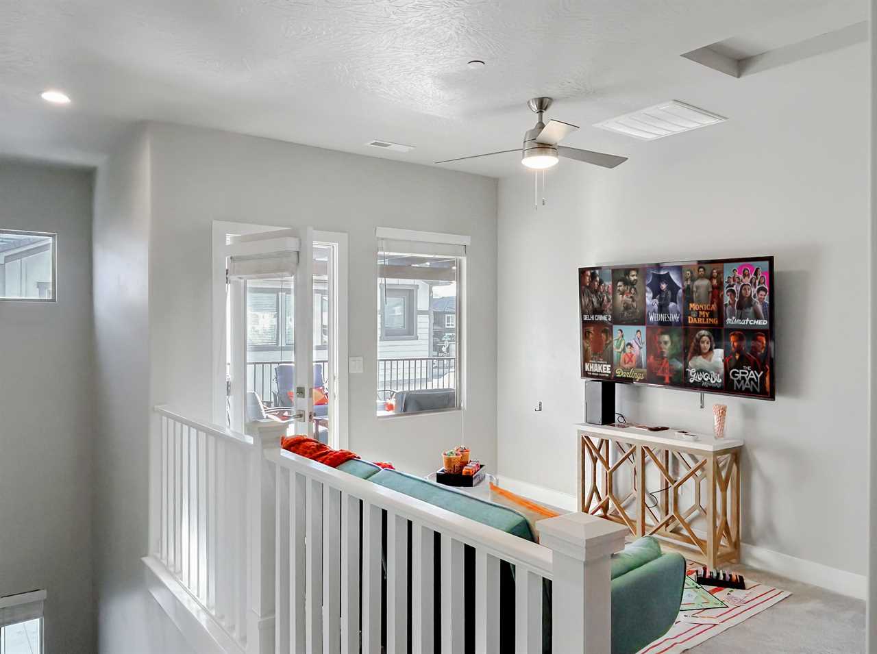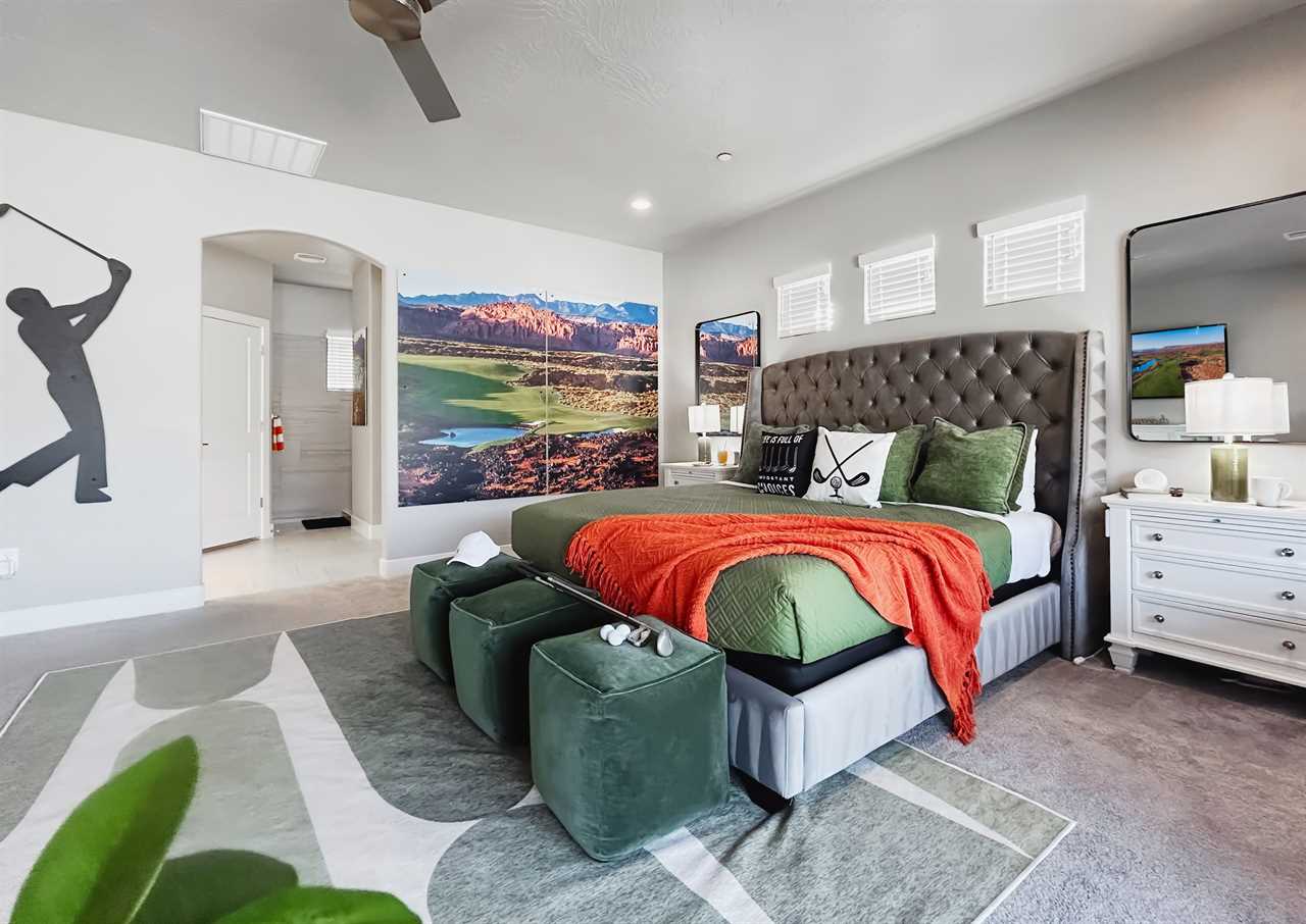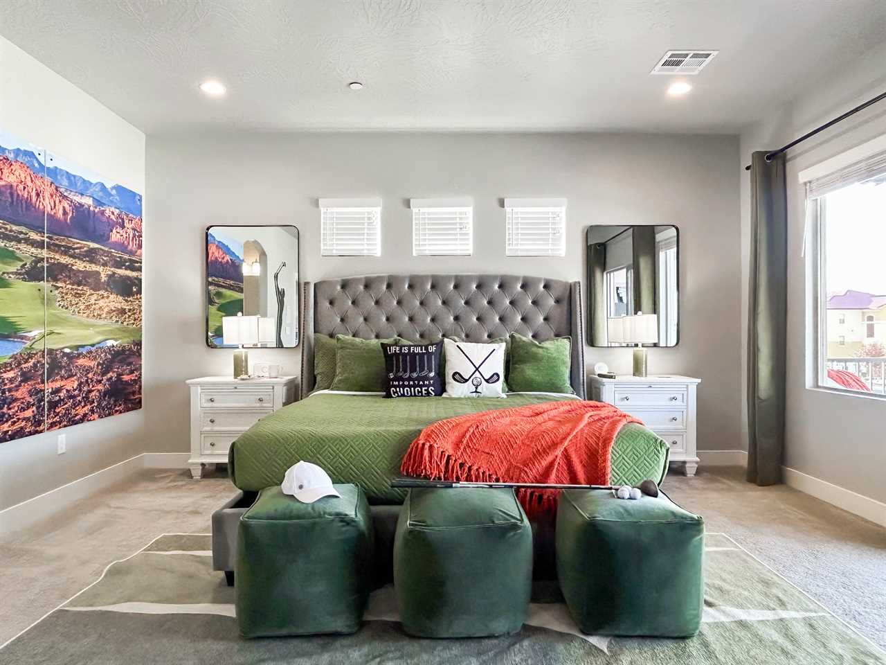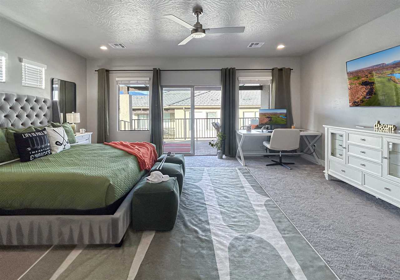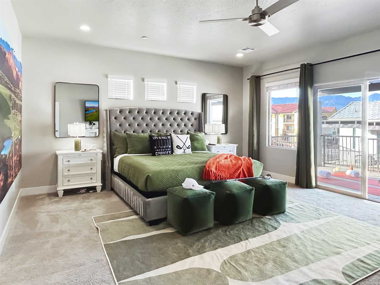 The bedrooms circle the upstairs and right off the other side of the loft is the upstairs primary Golf Suite that shares a balcony with the Zion Night bedroom. The Golf Suite has lots of floor space and a desk where you can catch up on some emails - or book tee times!