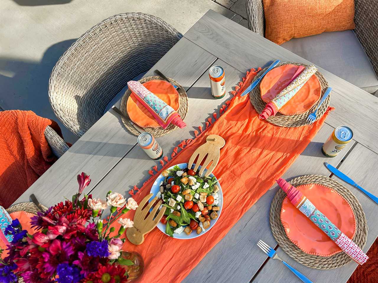 We love this space because everyone can spread out while still hanging out together and the dining area opens right up to the patio making it easy to expand dining outside.