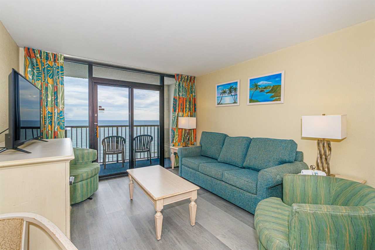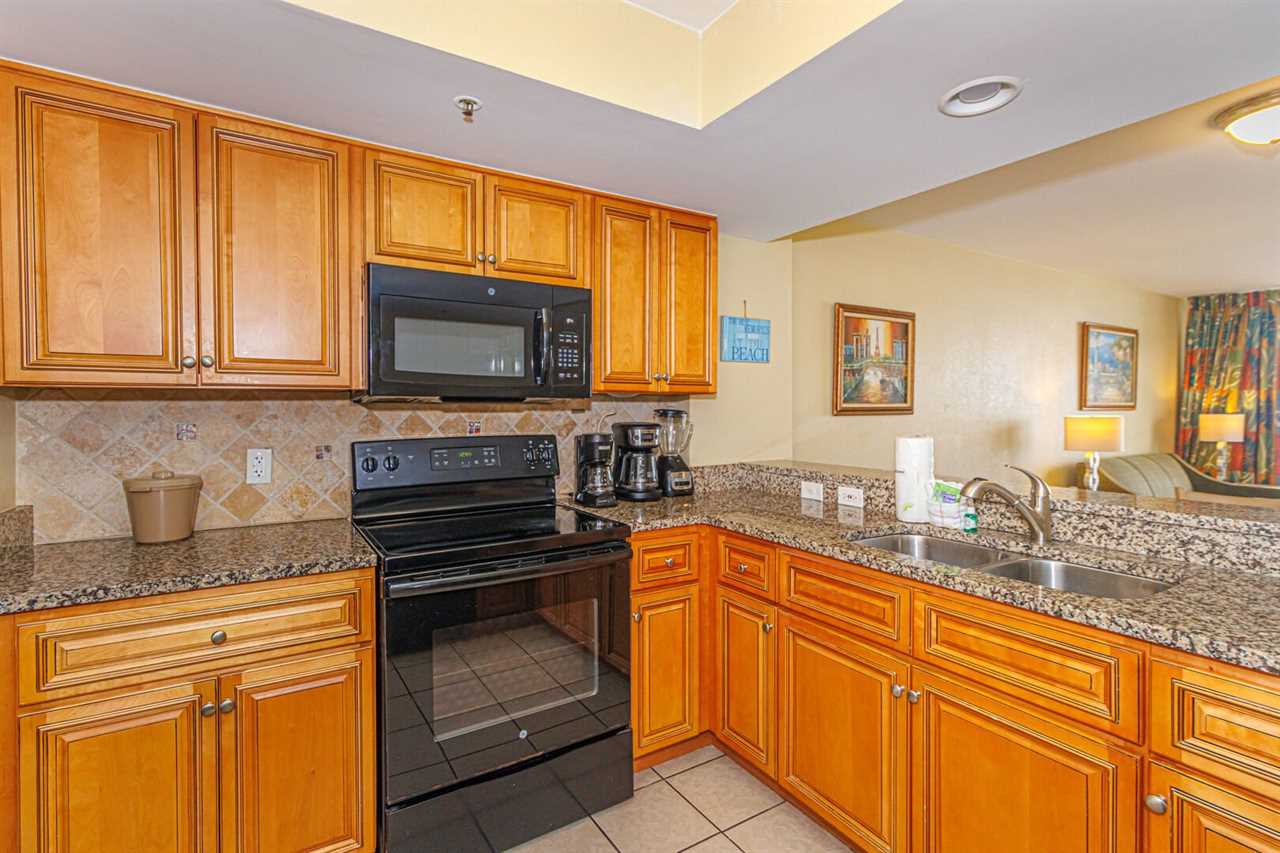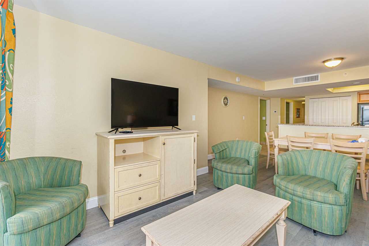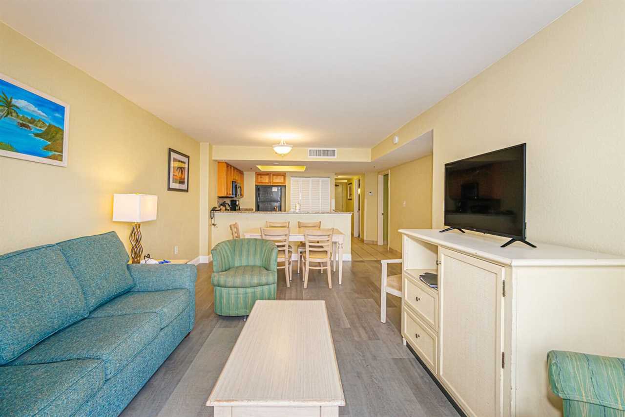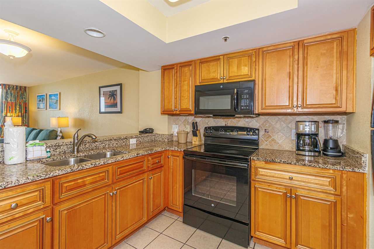 On the 1216 side, the living room is the heart of the condo, featuring a queen sleeper sofa, two accent chairs, and a flat-screen TV, all with breathtaking oceanfront views from the balcony. The kitchen is fully equipped with granite countertops, full-sized appliances, and ample cabinet space, making meal prep a breeze. The master bedroom has its own private access to the balcony and a full en-suite bathroom with a tub/shower combo. The second bedroom has a queen bed, while the third bedroom features two queens. A second bathroom with a tub/shower combo serves these rooms.
