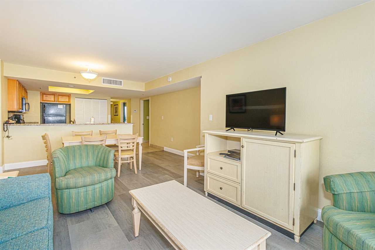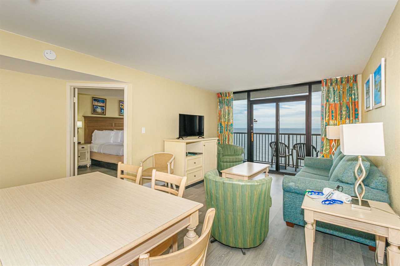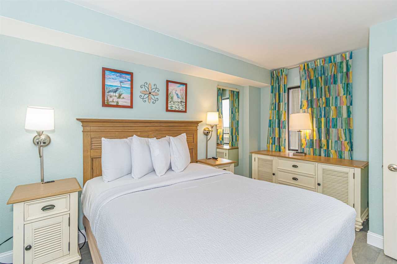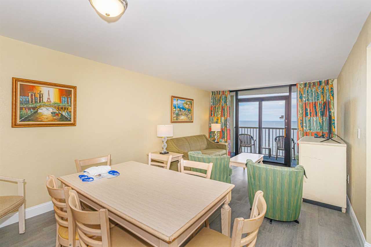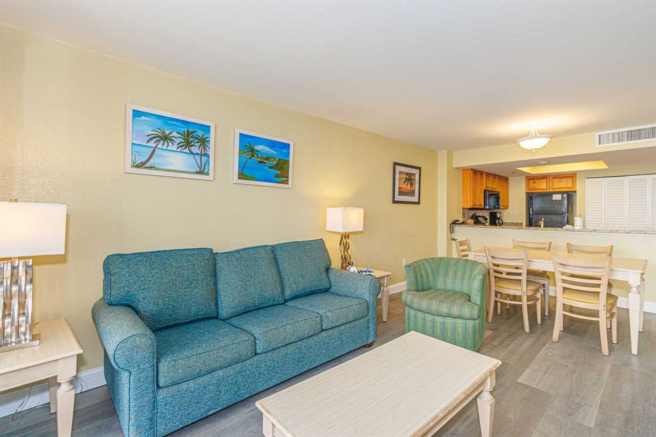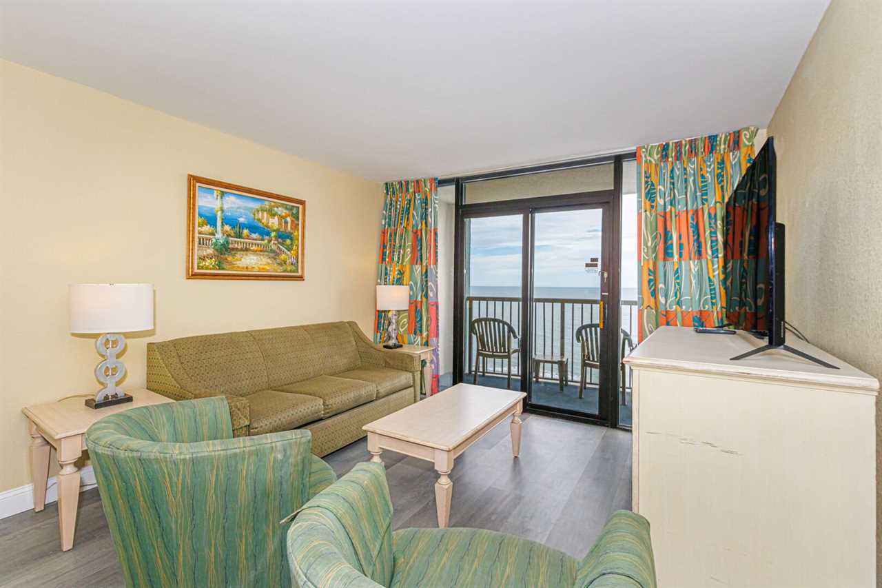 On the 1216 side, the living room is the heart of the condo, featuring a queen sleeper sofa, two accent chairs, and a flat-screen TV, all with breathtaking oceanfront views from the balcony. The kitchen is fully equipped with granite countertops, full-sized appliances, and ample cabinet space, making meal prep a breeze. The master bedroom has its own private access to the balcony and a full en-suite bathroom with a tub/shower combo. The second bedroom has a queen bed, while the third bedroom features two queens. A second bathroom with a tub/shower combo serves these rooms.