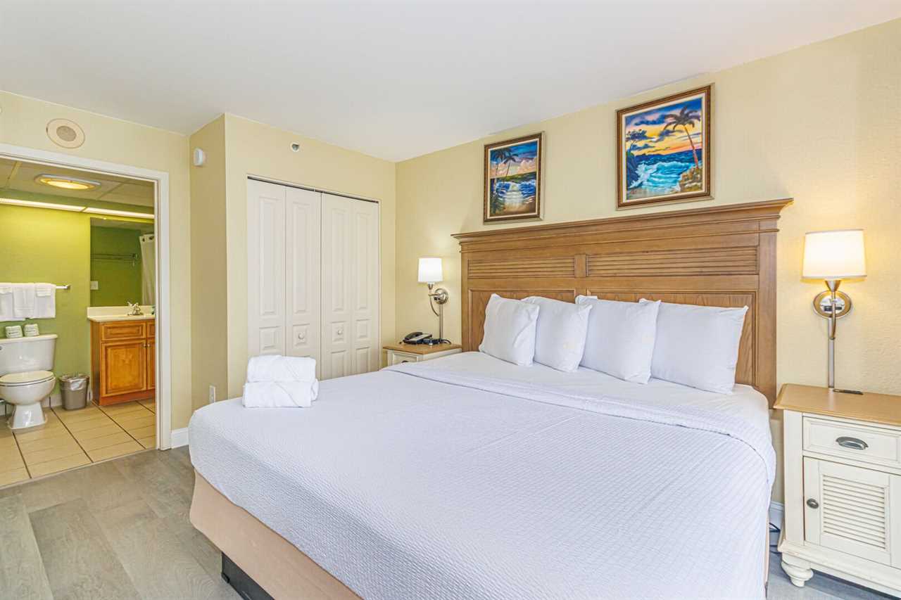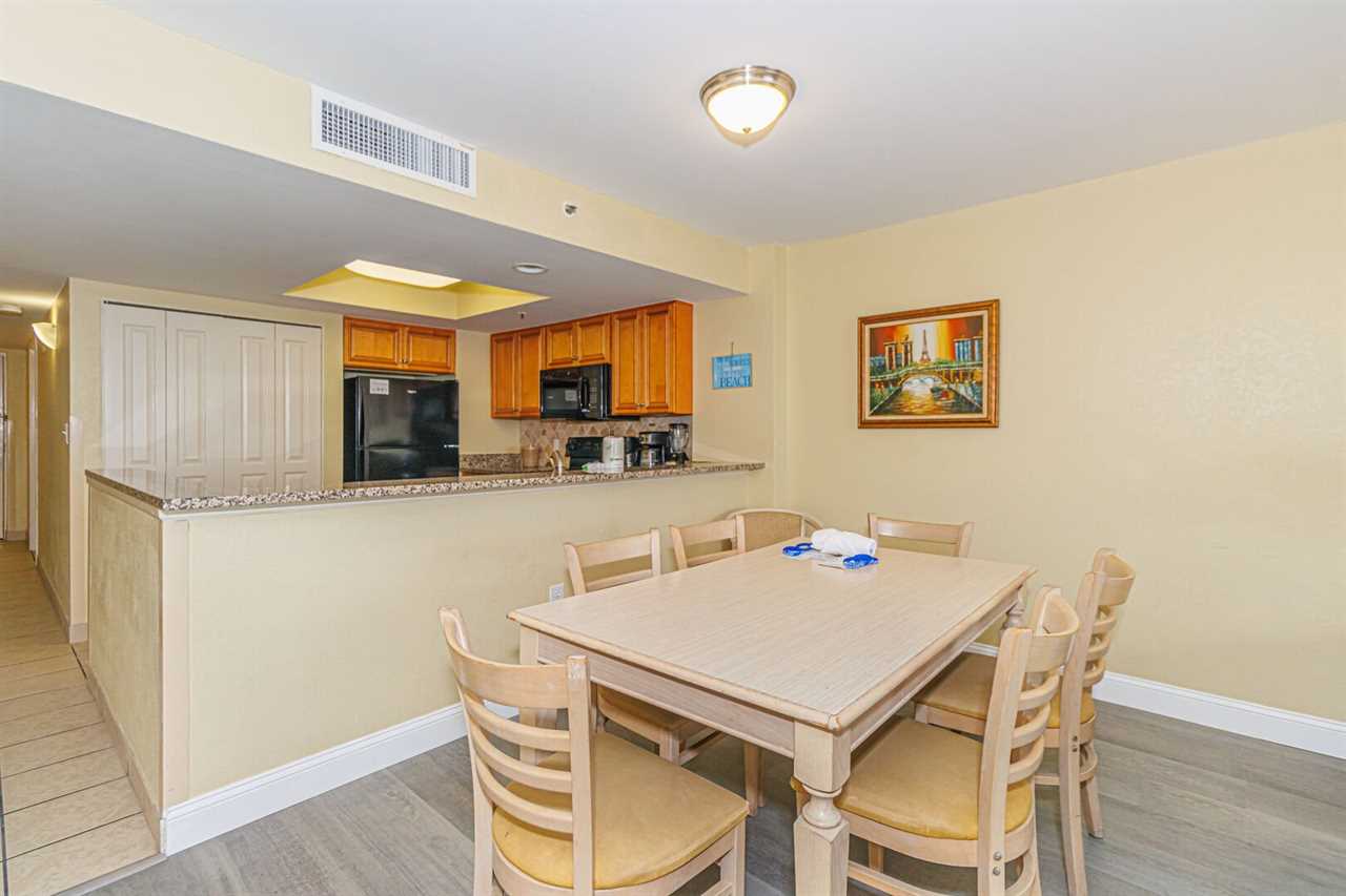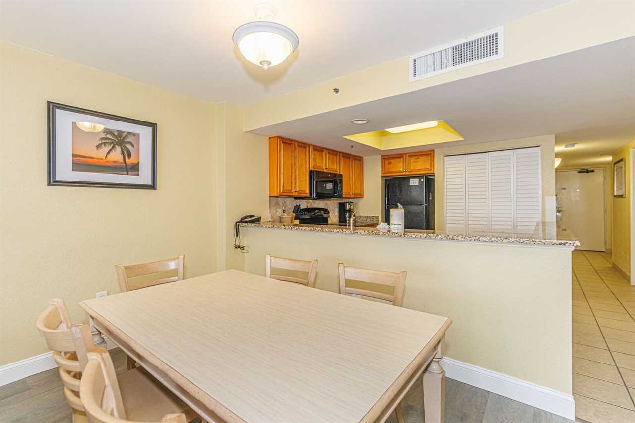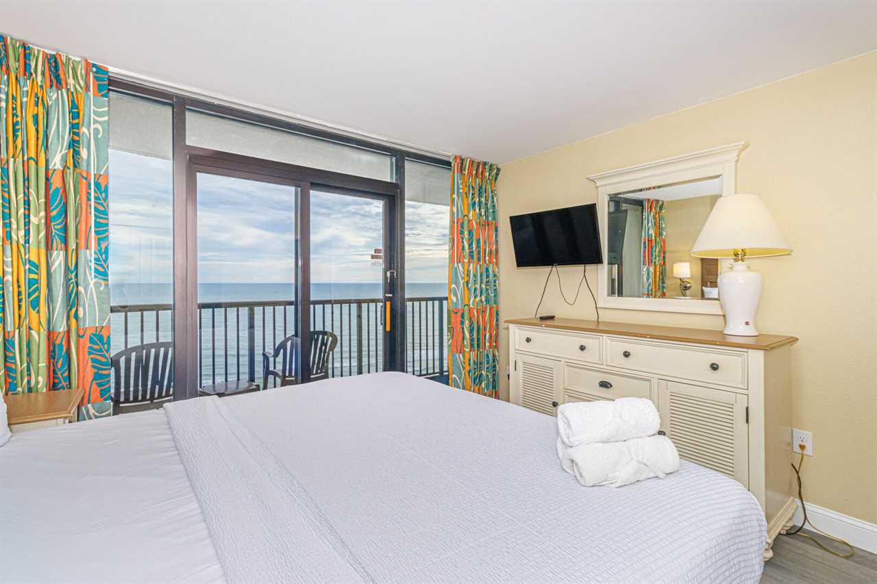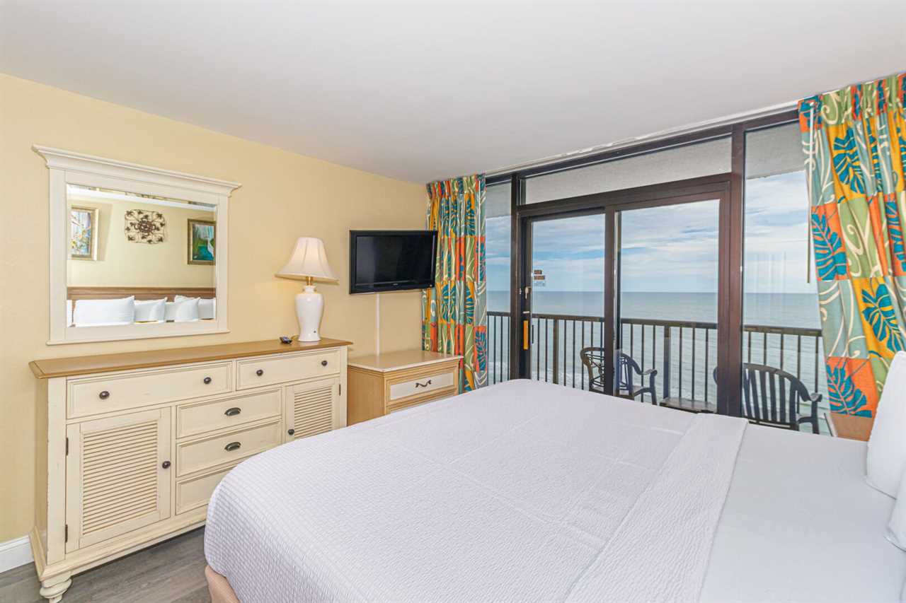 On the 1216 side, the living room is the heart of the condo, featuring a queen sleeper sofa, two accent chairs, and a flat-screen TV, all with breathtaking oceanfront views from the balcony. The kitchen is fully equipped with granite countertops, full-sized appliances, and ample cabinet space, making meal prep a breeze. The master bedroom has its own private access to the balcony and a full en-suite bathroom with a tub/shower combo. The second bedroom has a queen bed, while the third bedroom features two queens. A second bathroom with a tub/shower combo serves these rooms.