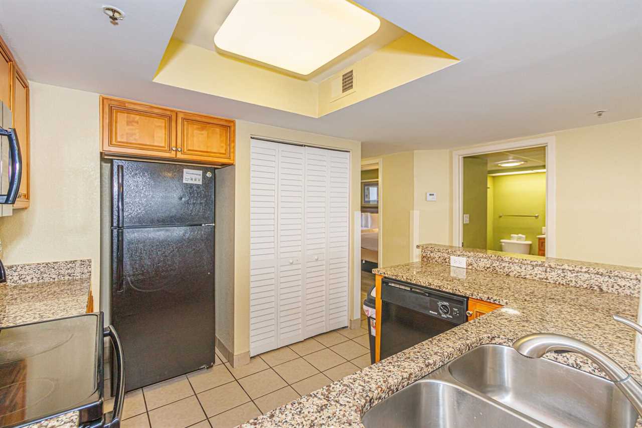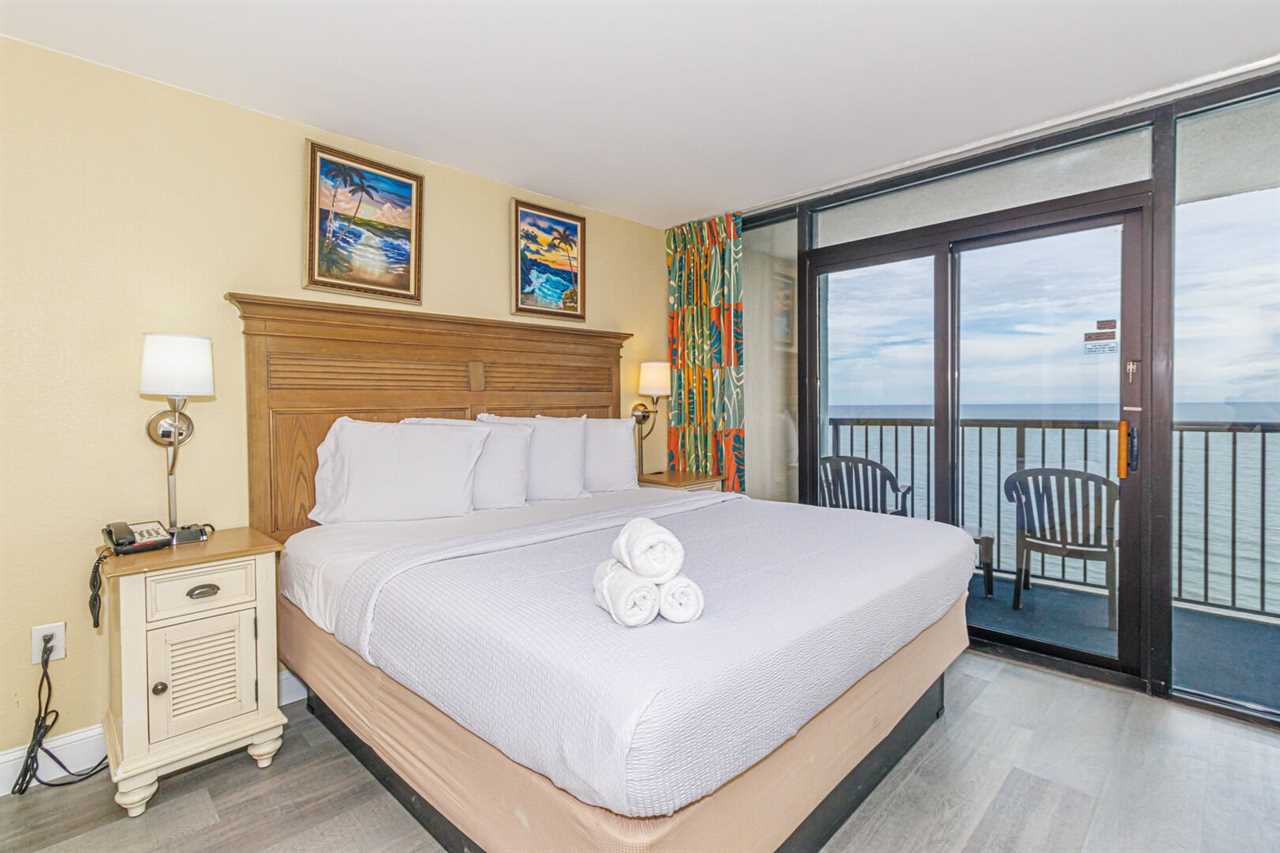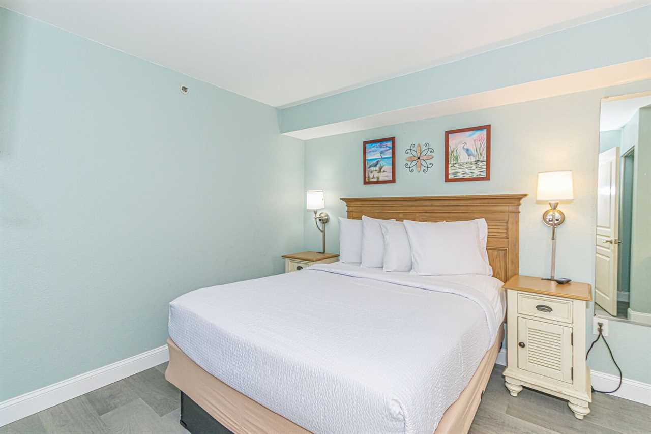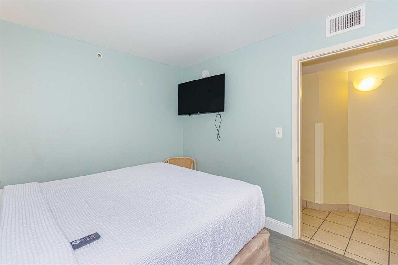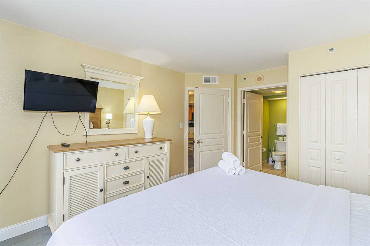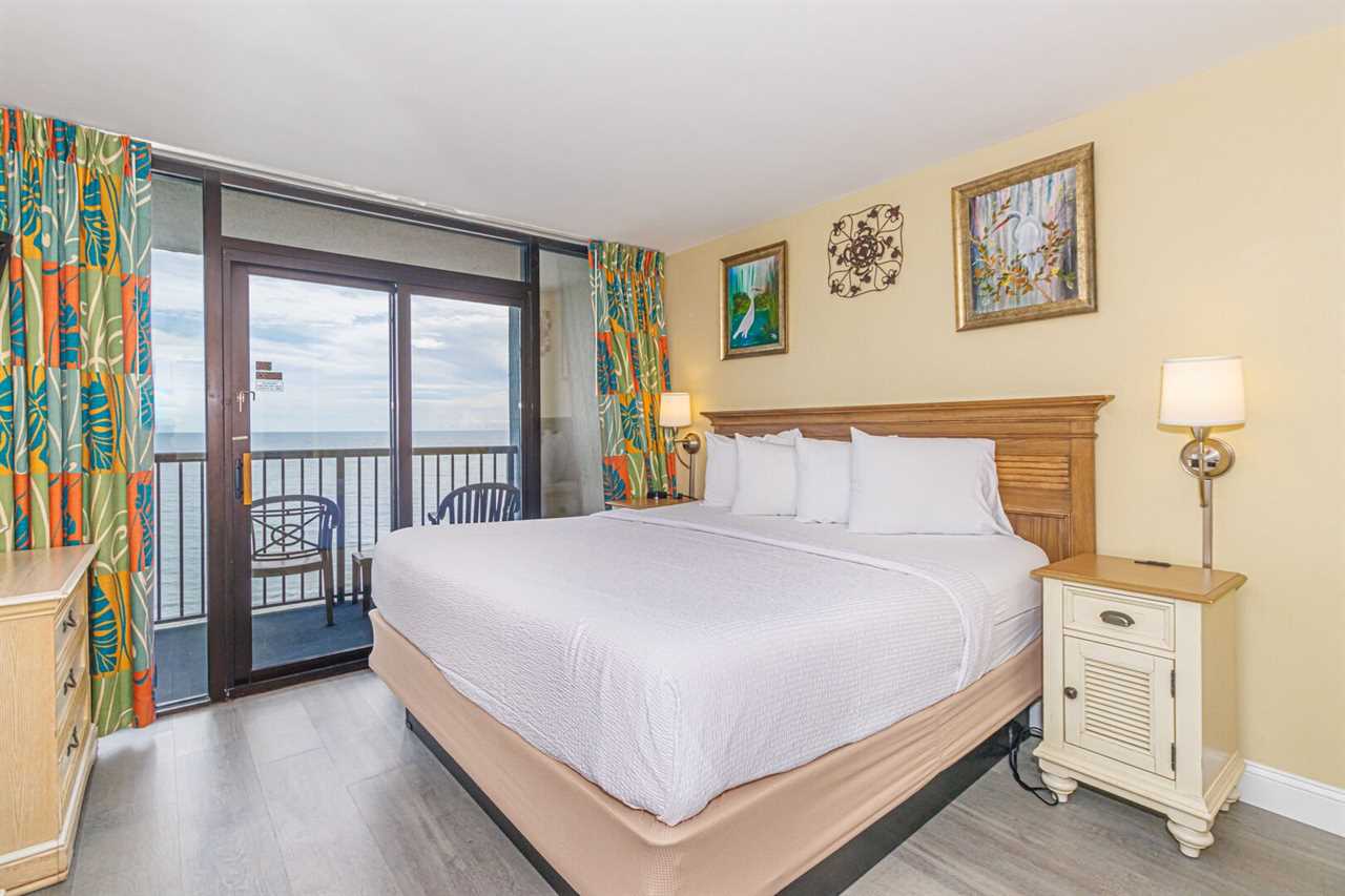 On the 1216 side, the living room is the heart of the condo, featuring a queen sleeper sofa, two accent chairs, and a flat-screen TV, all with breathtaking oceanfront views from the balcony. The kitchen is fully equipped with granite countertops, full-sized appliances, and ample cabinet space, making meal prep a breeze. The master bedroom has its own private access to the balcony and a full en-suite bathroom with a tub/shower combo. The second bedroom has a queen bed, while the third bedroom features two queens. A second bathroom with a tub/shower combo serves these rooms.