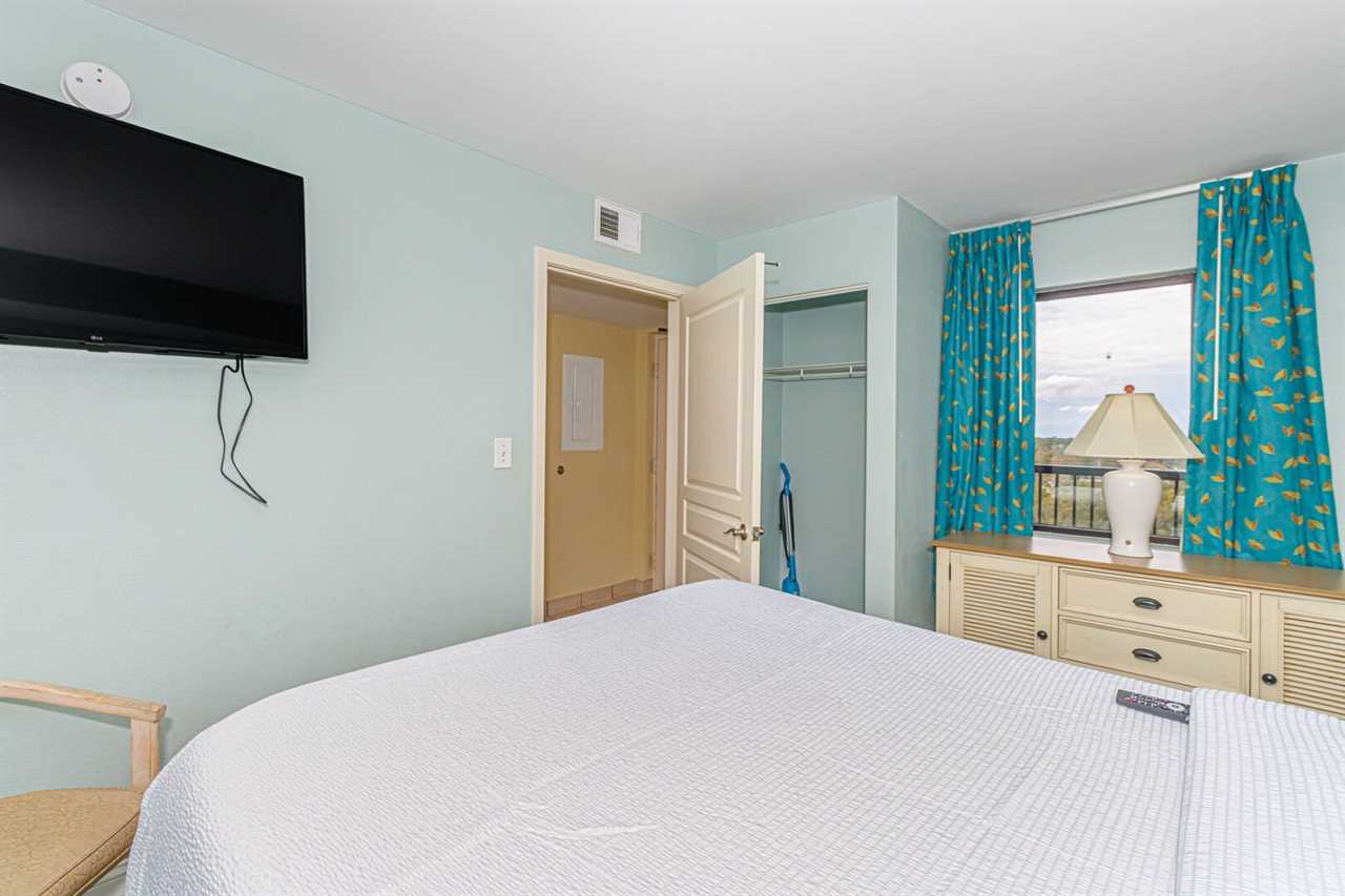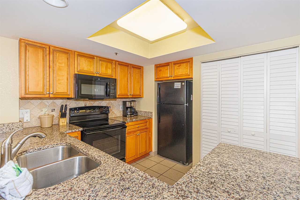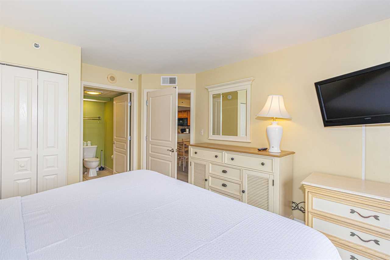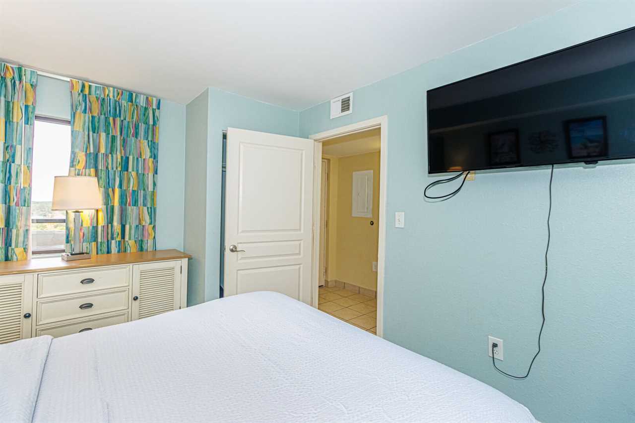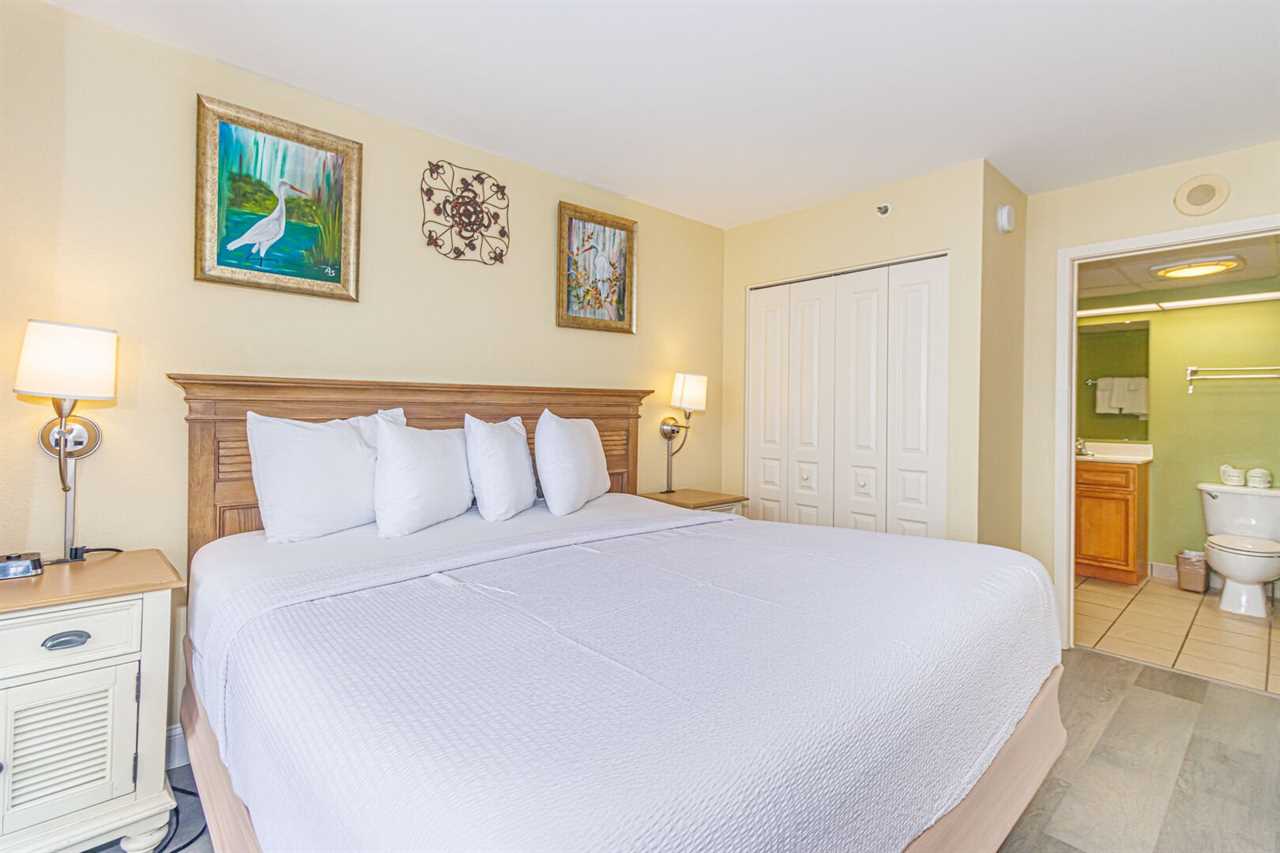 On the 1216 side, the living room is the heart of the condo, featuring a queen sleeper sofa, two accent chairs, and a flat-screen TV, all with breathtaking oceanfront views from the balcony. The kitchen is fully equipped with granite countertops, full-sized appliances, and ample cabinet space, making meal prep a breeze. The master bedroom has its own private access to the balcony and a full en-suite bathroom with a tub/shower combo. The second bedroom has a queen bed, while the third bedroom features two queens. A second bathroom with a tub/shower combo serves these rooms.