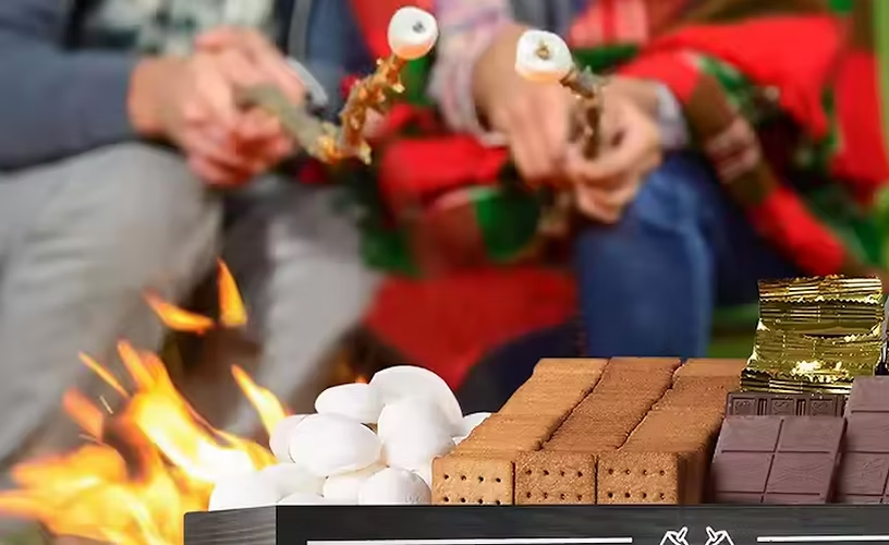 ⭑ Large stone fire pit with Adirondack chairs, ideal for toasting S'mores 🔥 🪵 🍫