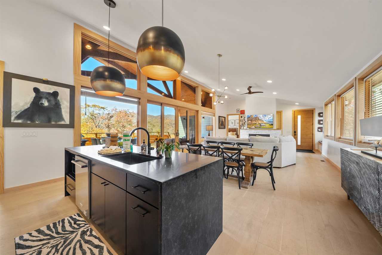Step inside to find an exquisitely crafted interior featuring natural stone accents, custom woodwork, and granite finishes that exude timeless luxury. The open-concept living space showcases high-end designer furnishings, curated decor, and panoramic views that bring the beauty of the mountains indoors.