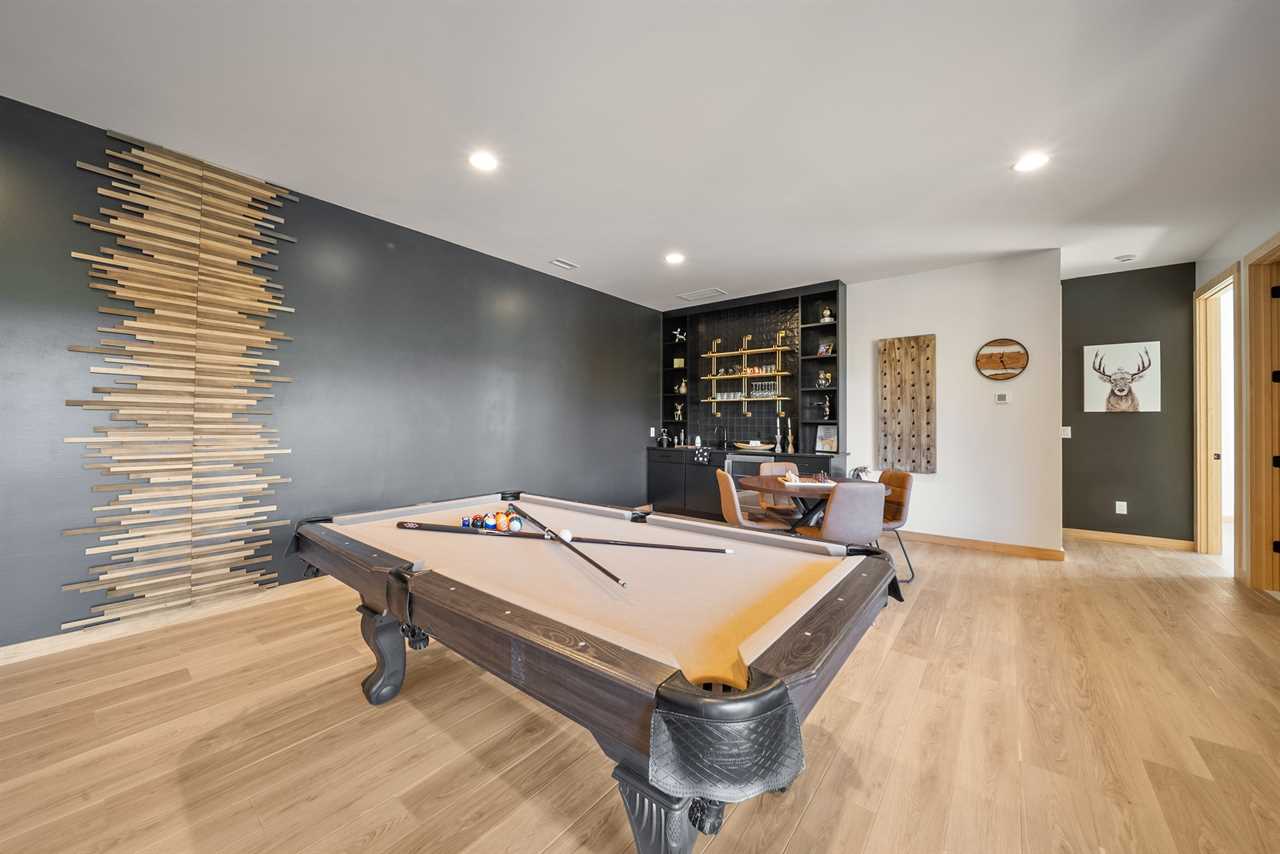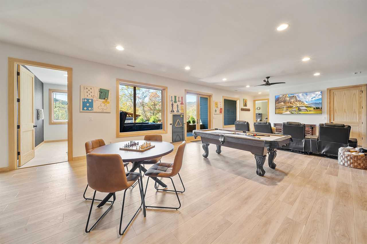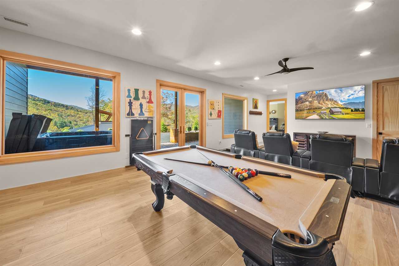 Entertainment awaits on the lower level, where a state-of-the-art theater room promises cinematic experiences in the comfort of your own private retreat. The adjoining game room features a pool table for friendly competition, along with a well-appointed wet bar, perfect for crafting cocktails or enjoying a casual evening with loved ones.