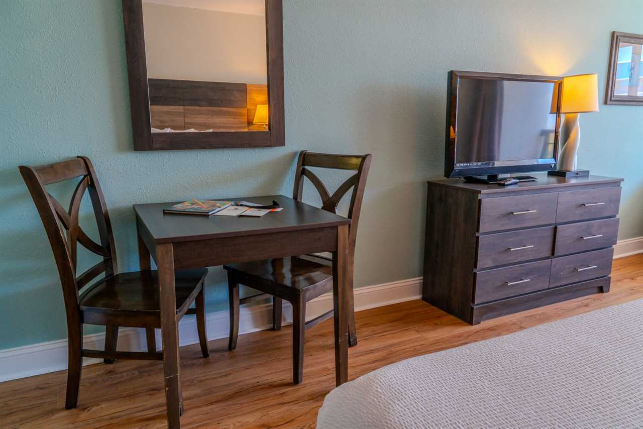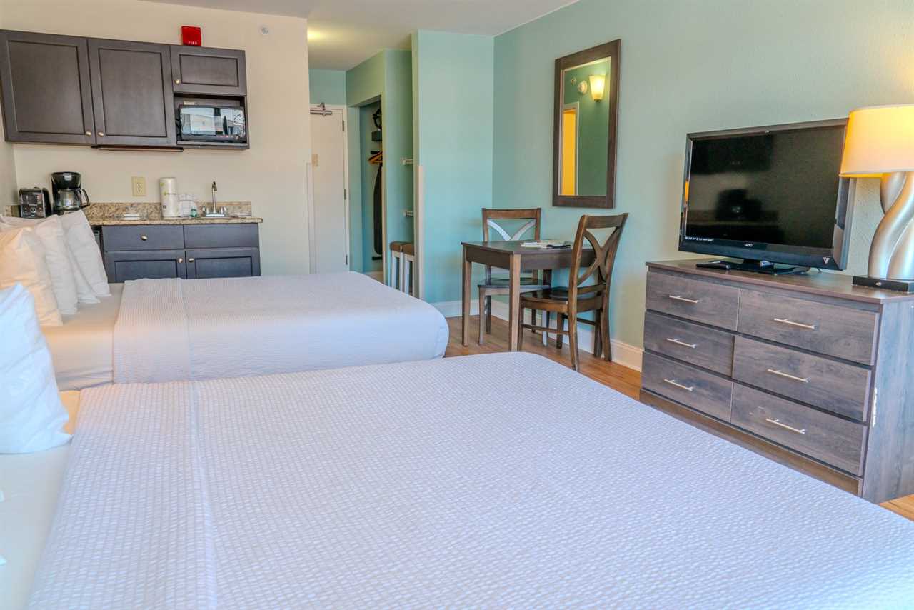 As you step inside, you'll first pass a convenient closet and the bathroom before entering the main living and sleeping area. Here, you'll find the two queen beds, separated by a nightstand with a lamp, offering both comfort and functionality. Directly across, a spacious dresser makes unpacking a breeze, while a flat-screen TV provides entertainment for when you want to relax and unwind after a day of exploring.