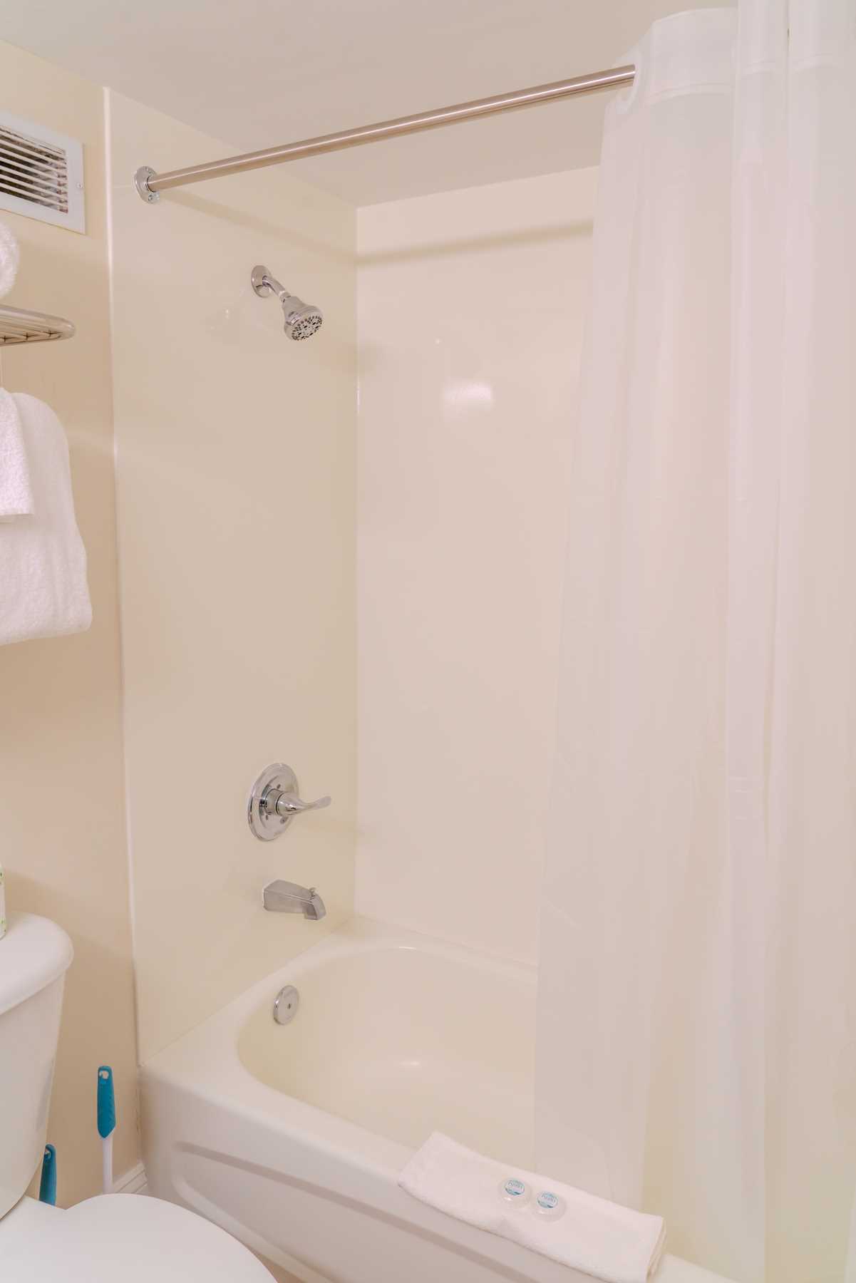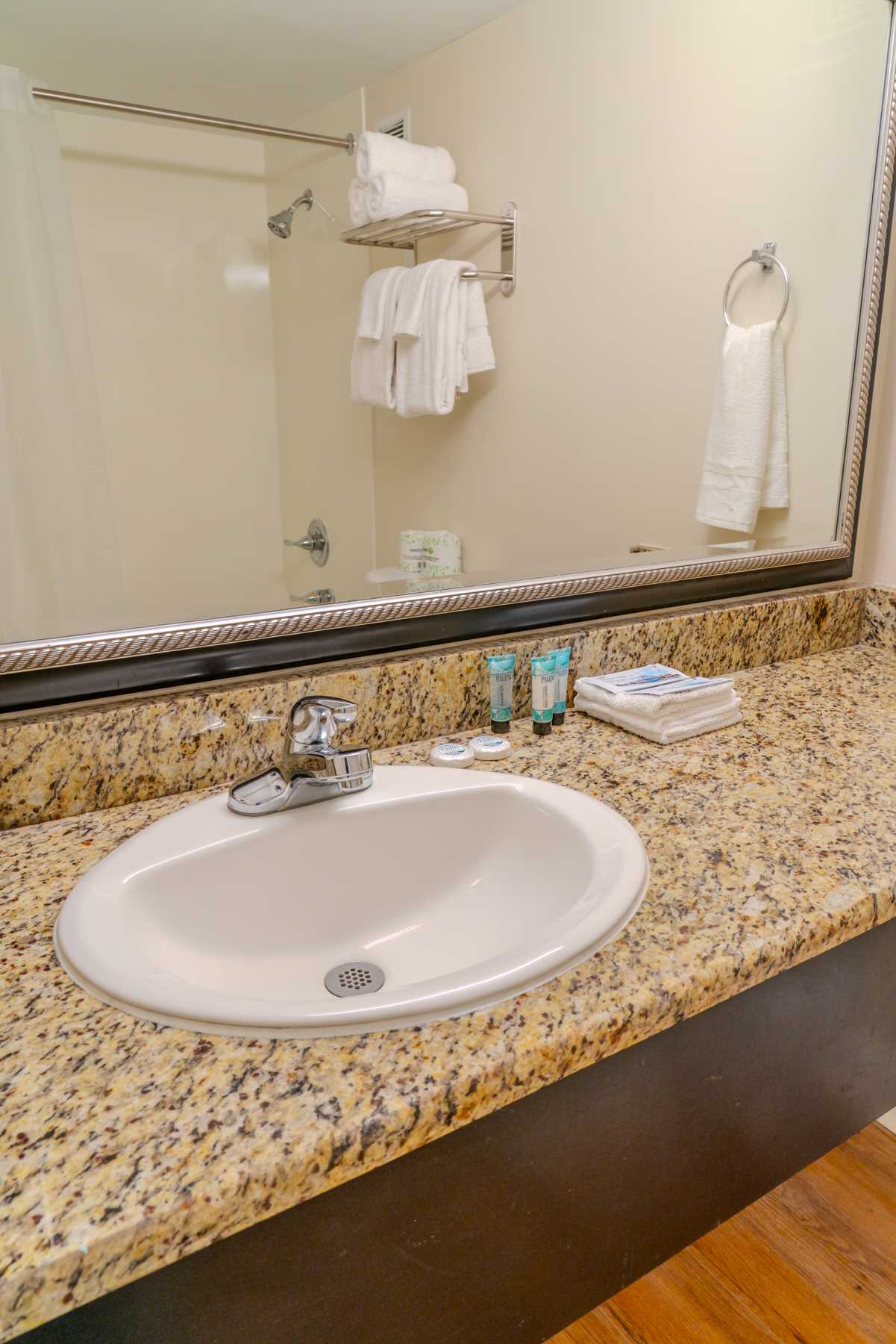 Heading back toward the front of the unit, you'll find the bathroom, complete with a spacious countertop, sink, and large mirror—perfect for prepping for a night out! A shower/tub combo and toilet complete the space. We make it easy for you to pack light, as we provide all the essentials, including bath towels, washcloths, toiletries, and bedding. For your convenience, we also supply basic starter toiletries, including toilet paper, paper towels, dish liquid, soap, shampoo, lotion, and conditioner.