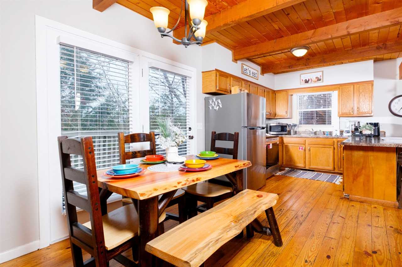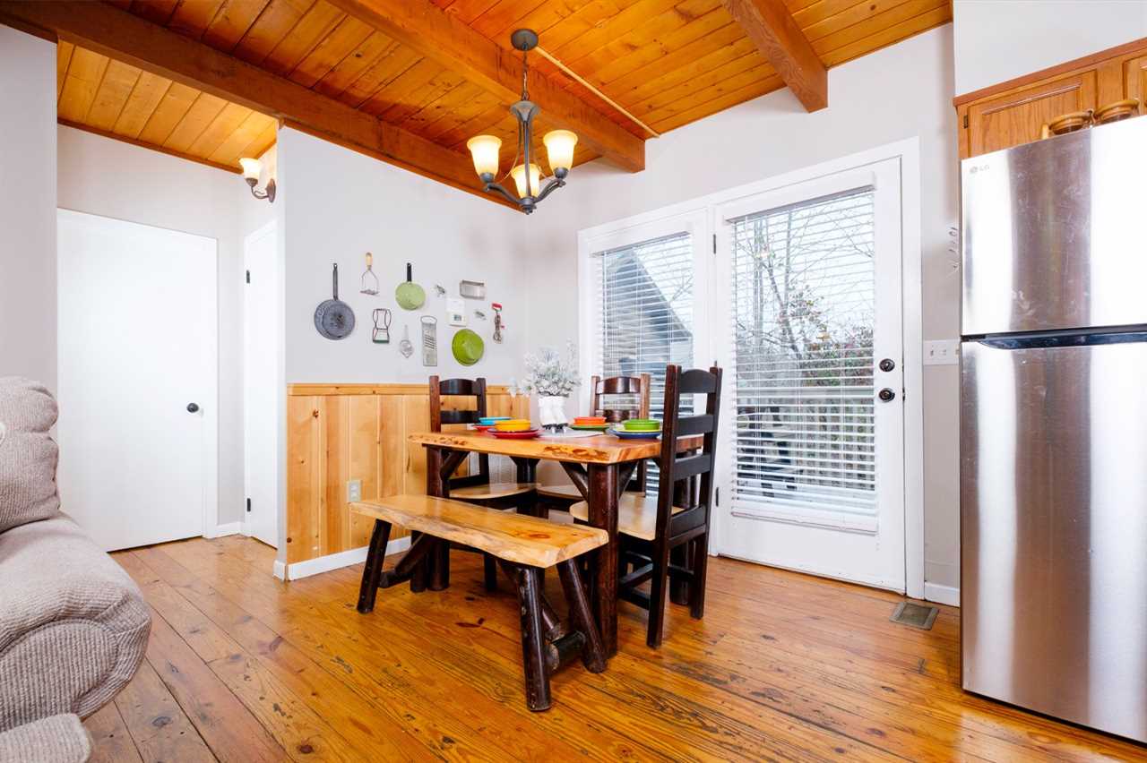 The dining area offers a cozy spot to enjoy meals together or gather for games and conversation. Its location just off the kitchen makes serving and cleanup simple.
