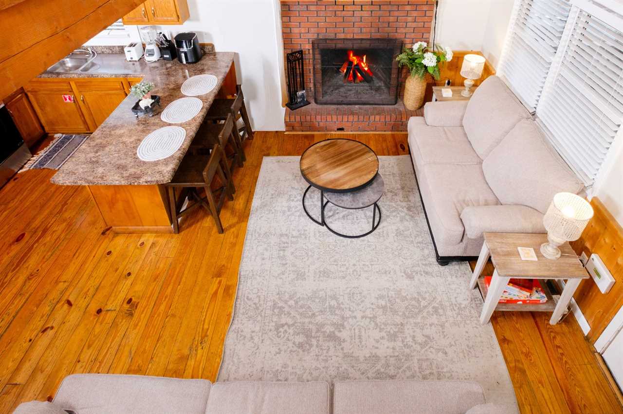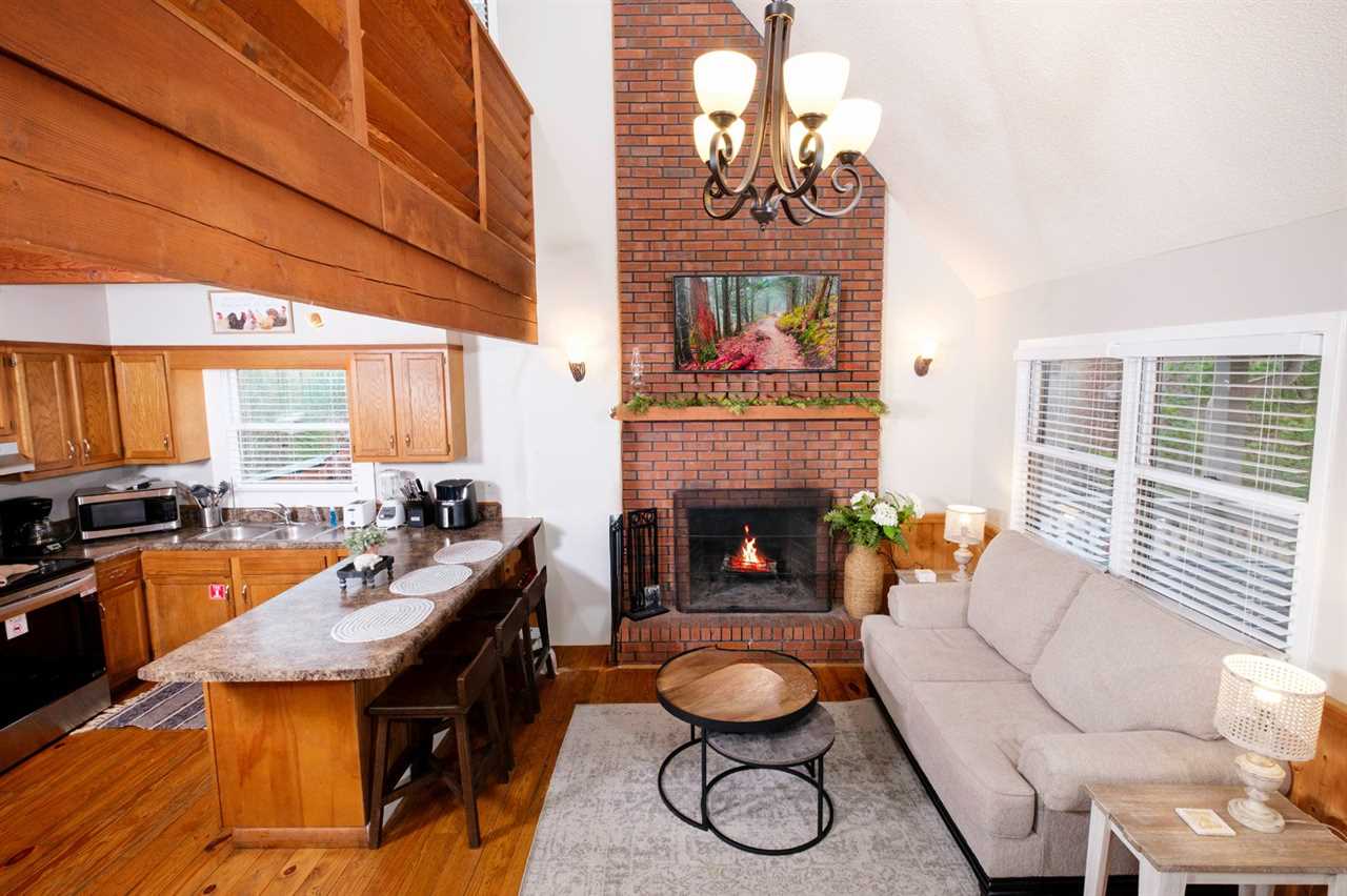 The living room is a welcoming space to gather after exploring Dollywood, shopping at The Island, or hiking in the Great Smoky Mountains National Park. With comfortable seating, a big screen TV, and a wood-burning fireplace, it's designed for relaxation and togetherness.