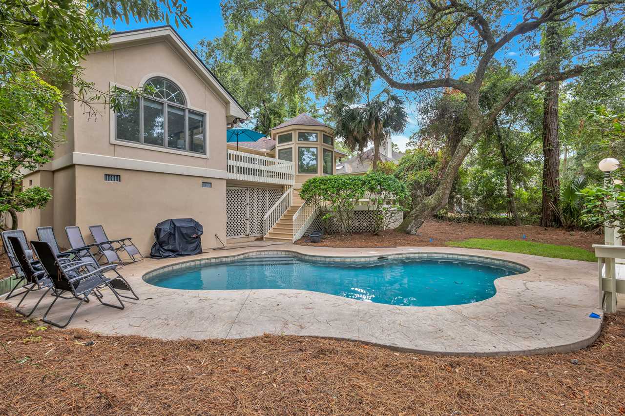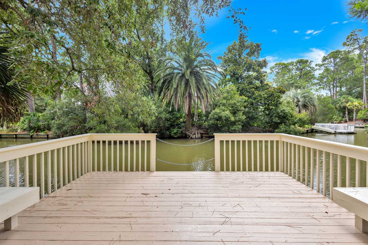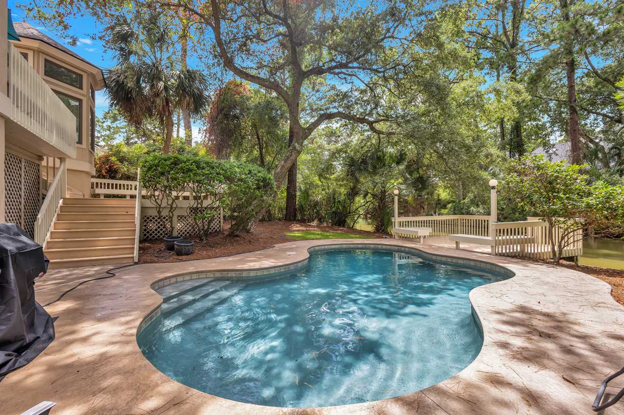 Step outside to a serene backyard oasis nestled among Lowcountry greenery, perfect for relaxation and recreation. Lounge by the pool, dine al fresco, or launch a kayak directly from the private dock into the Palmetto Dunes lagoon system.