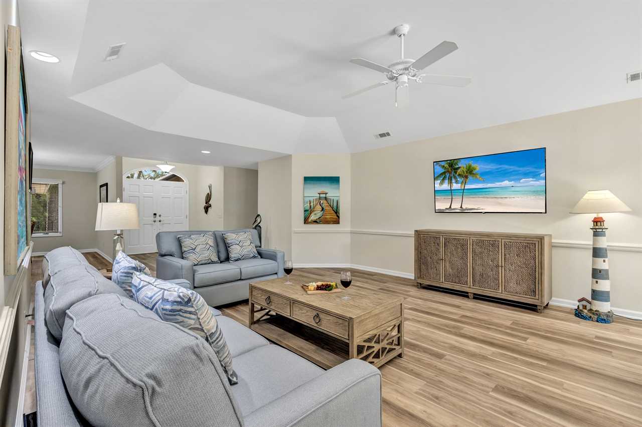 The expansive open-concept living area offers a chic yet cozy space to unwind after a day spent exploring. Large picture windows fill the home with natural light and offer stunning lagoon views, while the comfortable seating and thoughtful décor create a welcoming ambiance.