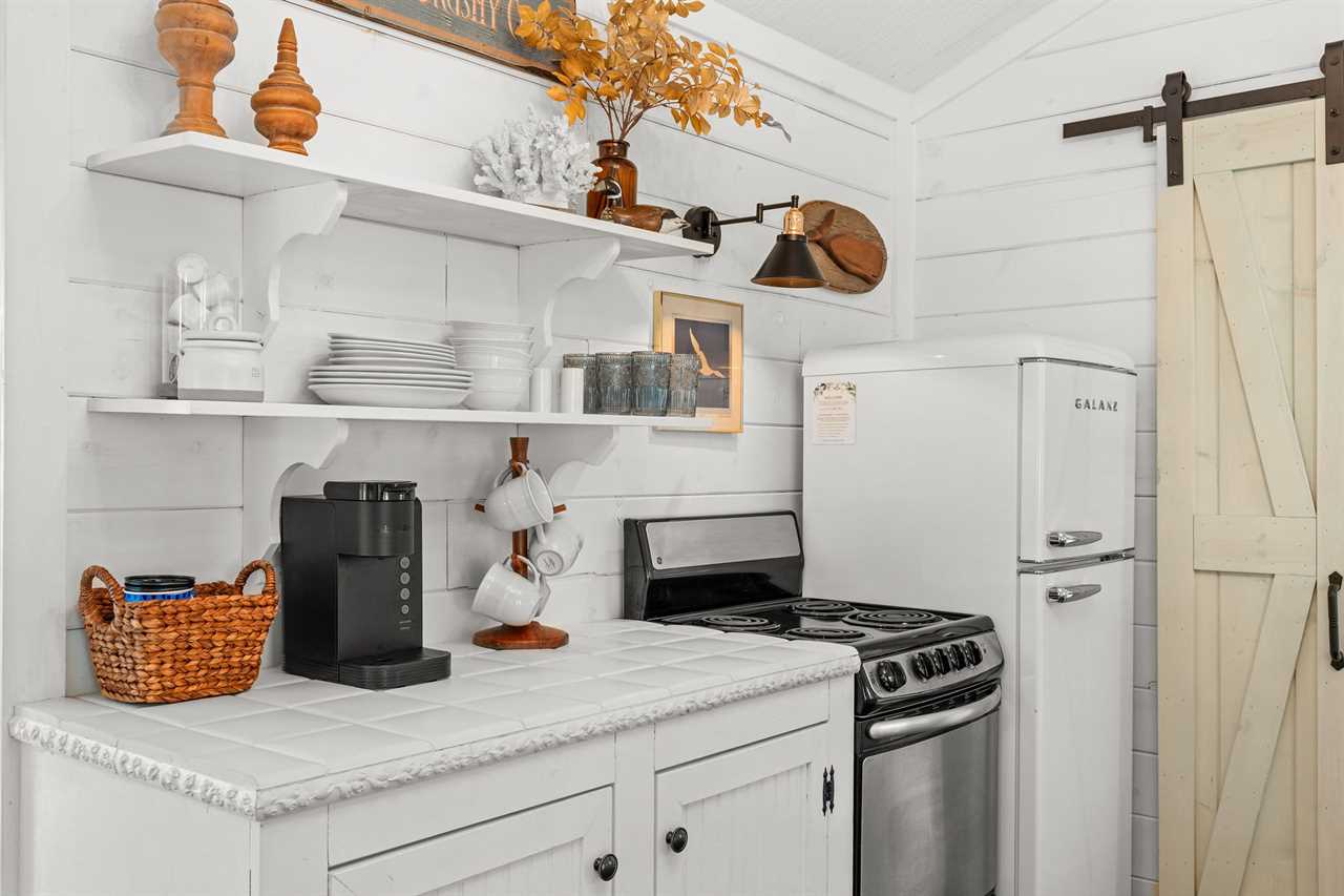 ✦ ✦ Cottage kitchen with stove, microwave, and full fridge
