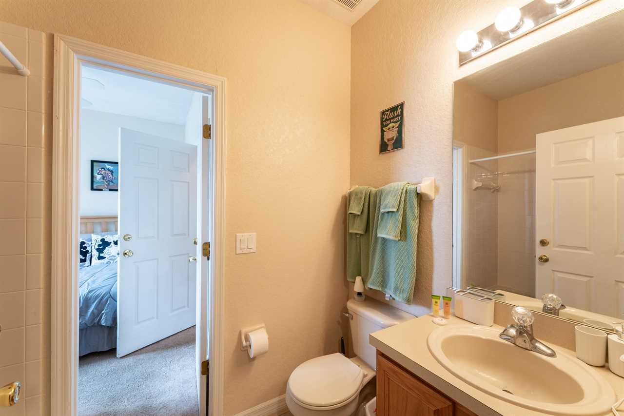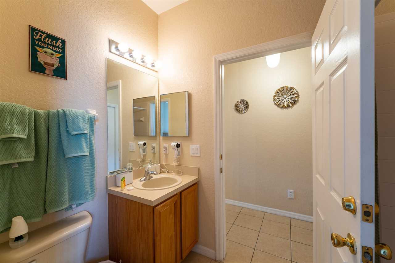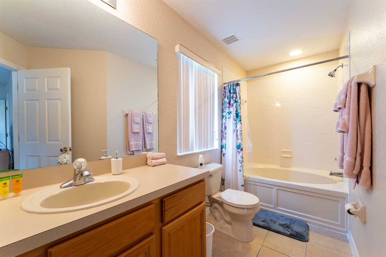 Shared downstairs bathroom with shower/tub combo and single sink vanity