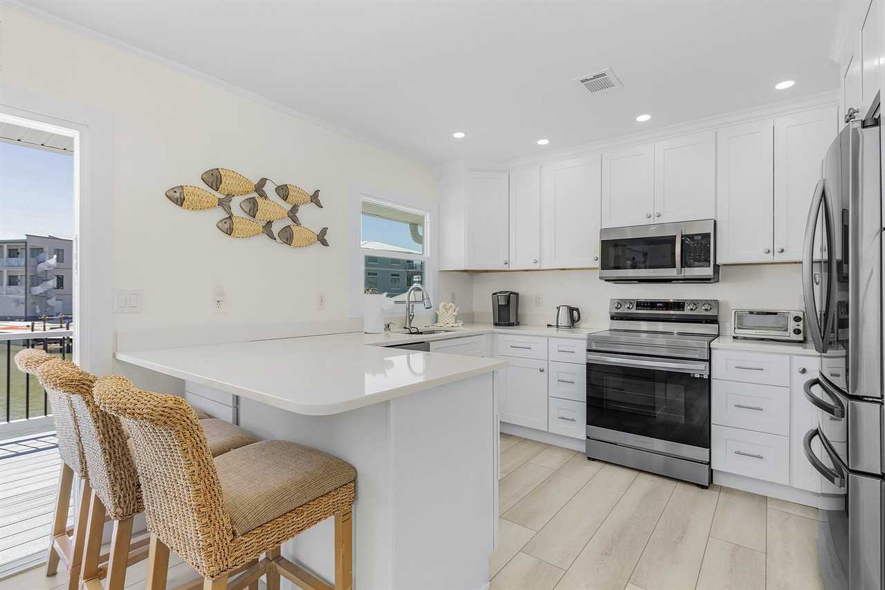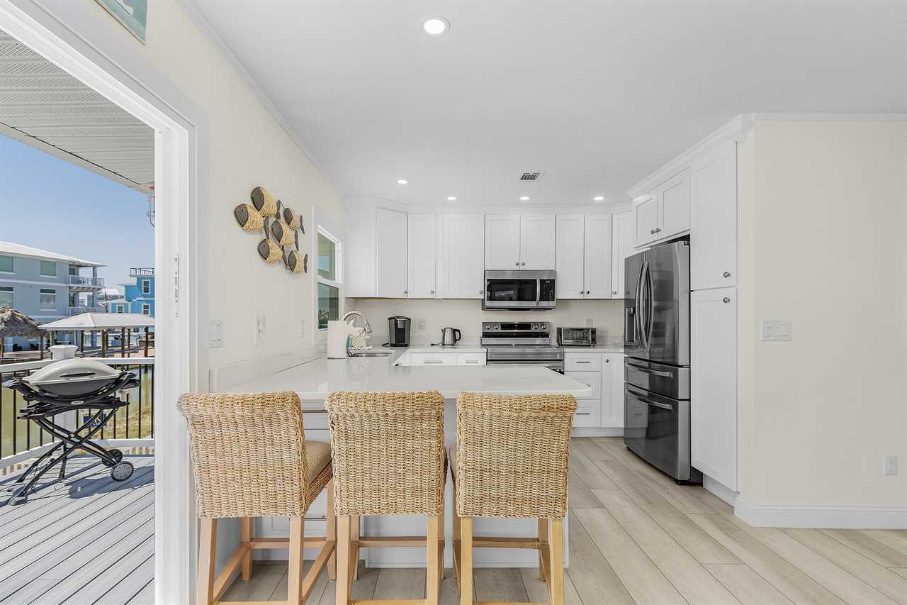 The inviting living area is designed for comfort, equipped with a television for your entertainment. The well-appointed kitchen boasts modern appliances, including a refrigerator, microwave, stove, dishwasher, Keurig coffee maker, and toaster oven. With all the necessary dishes and utensils, you'll have everything needed to prepare your favorite meals. Enjoy dining together at the indoor table or take your meals outside to the decked area, where you can soak in the breathtaking water views. A charcoal grill is conveniently located on the deck near the outdoor seating, perfect for cookouts.