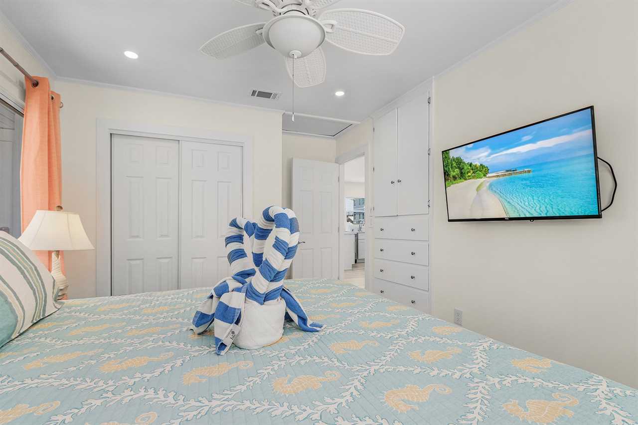Step inside this cozy retreat, which comfortably accommodates up to six guests. The primary bedroom features a luxurious king-sized bed, while the guest bedroom is furnished with a comfortable queen bed. For additional sleeping arrangements, a sleeper sofa is available in the living room, making it ideal for families or groups of friends. Built-in custom dressers in the bedrooms and spacious closets provide ample storage for your belongings.