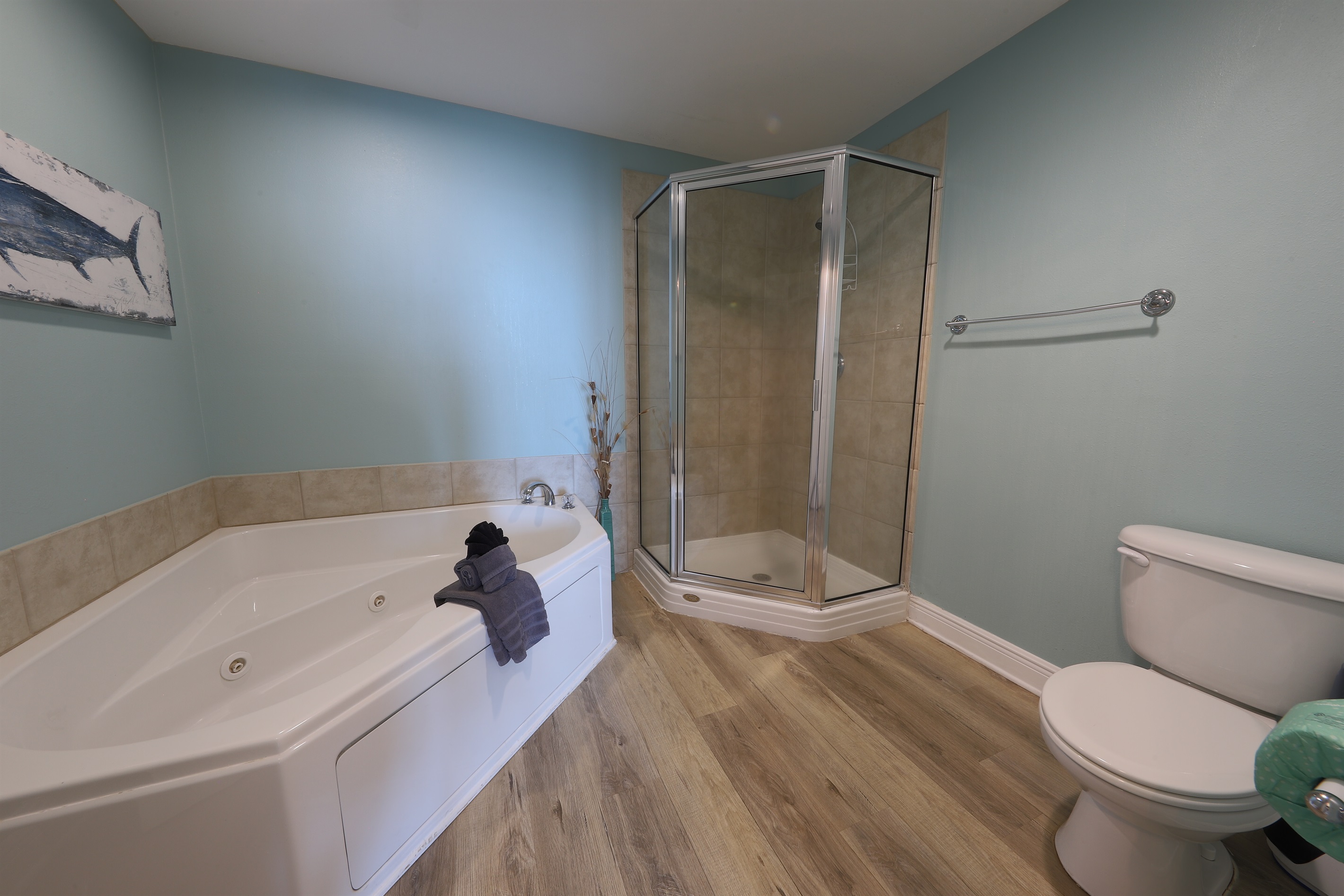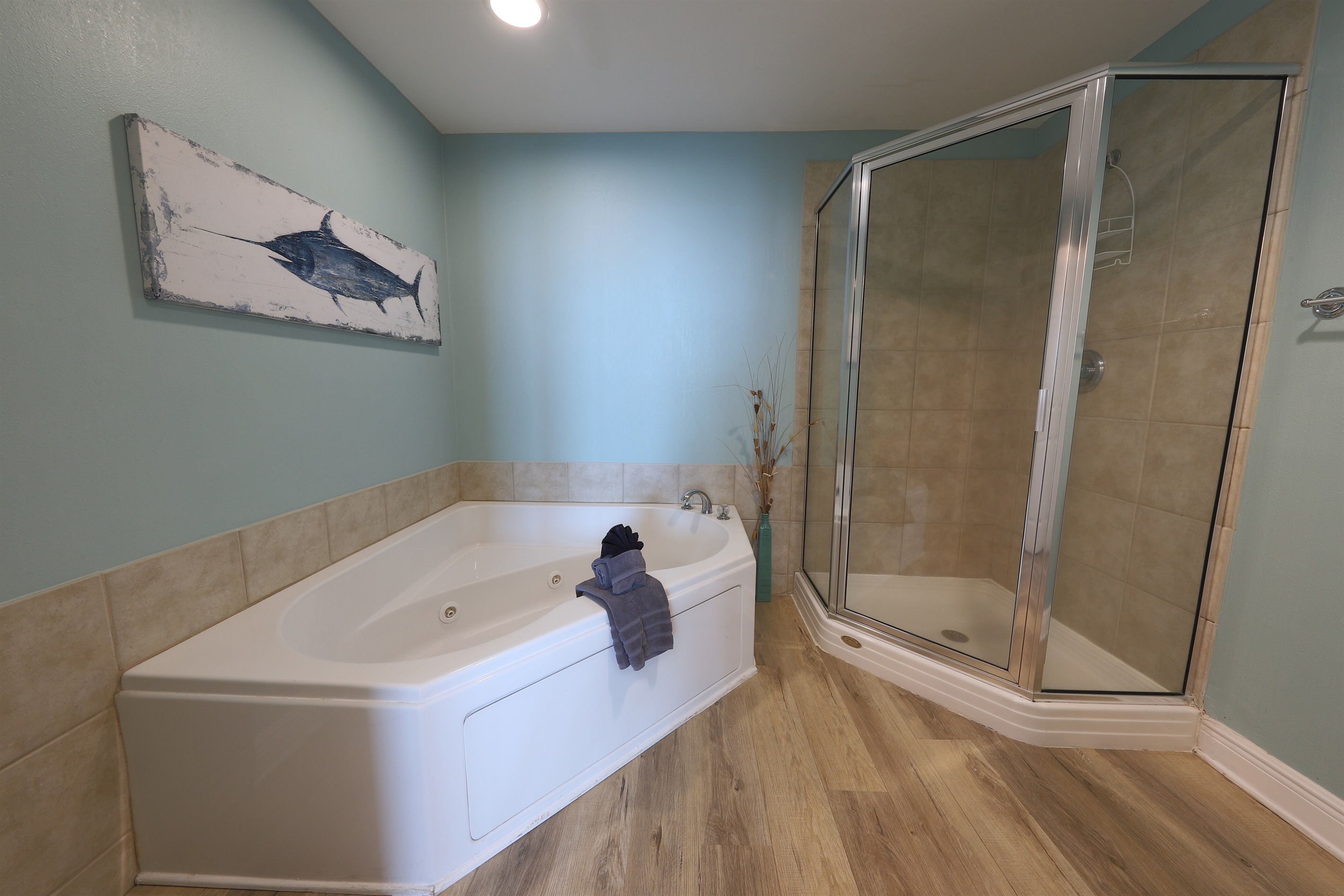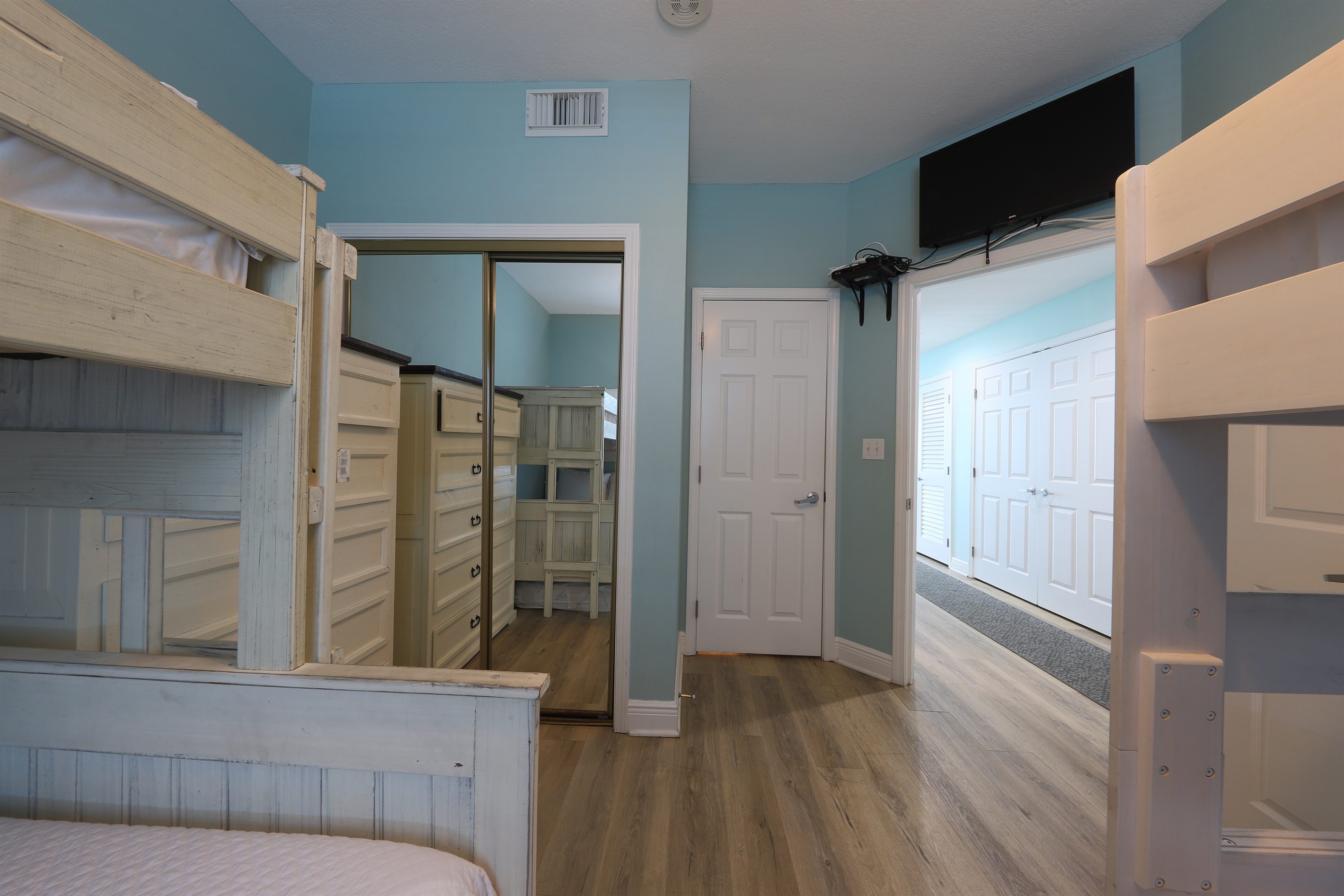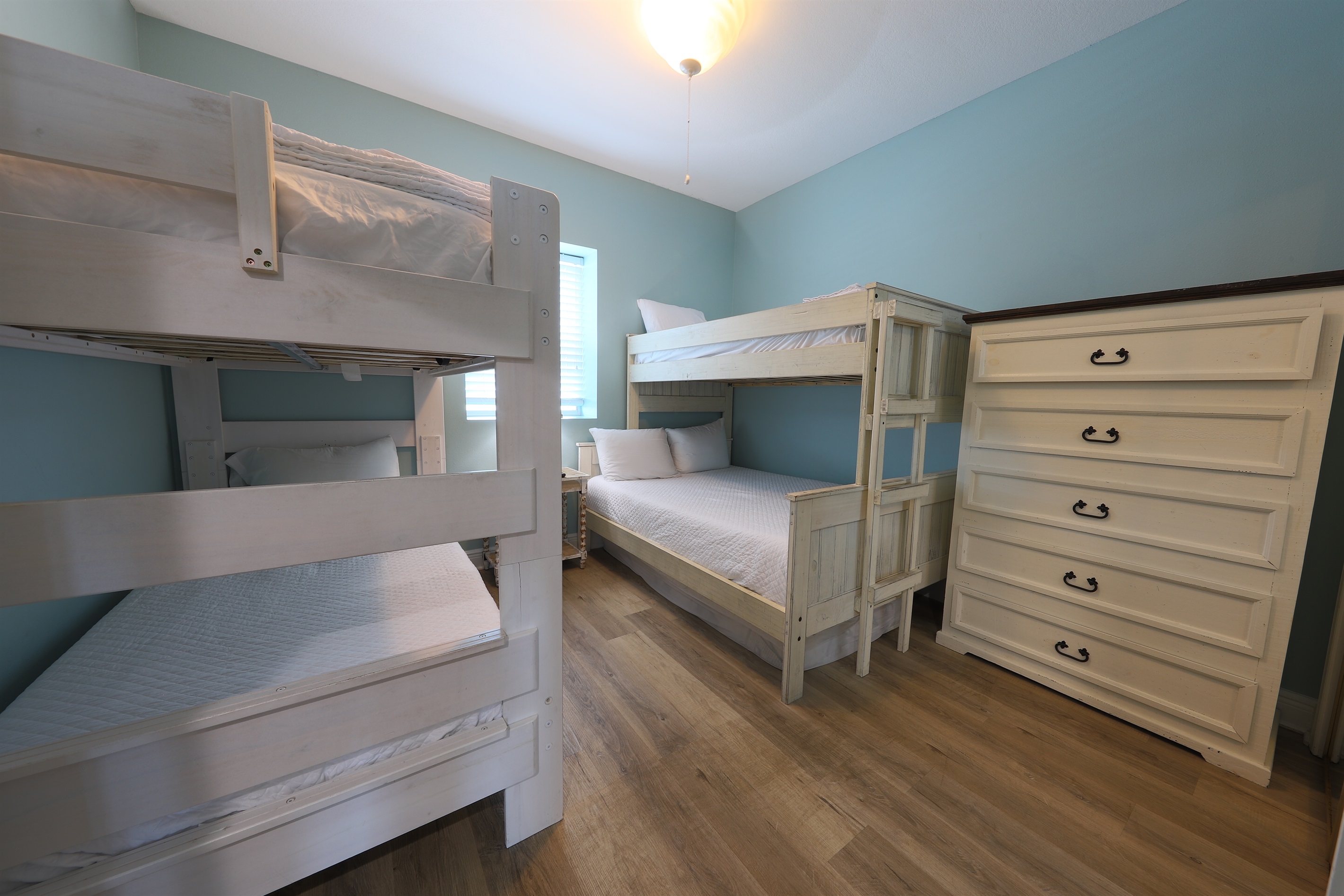 The King master suite offers private balcony access, a large ensuite bathroom with a soaker tub, separate shower, and dual vanities. The second bedroom features a Queen bed and its own private bath with a tub/shower combo. The third bedroom is perfect for the kids or a group with both a twin bunk and a twin-over-full bunk, plus a private ensuite bath.