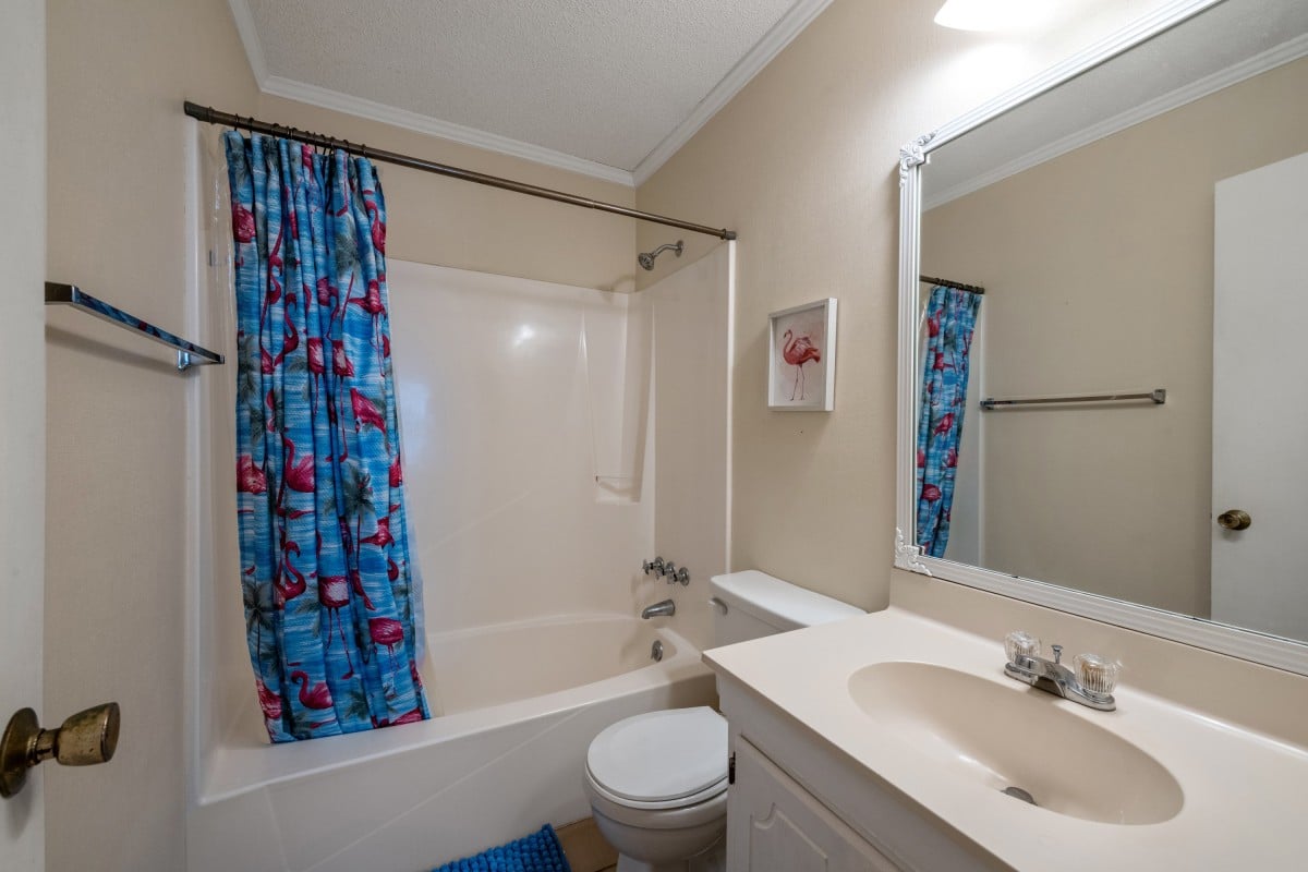 The second bathroom is conveniently located off the hallway and includes a shower and tub combination, a vanity with storage, a toilet, and a large mirror.