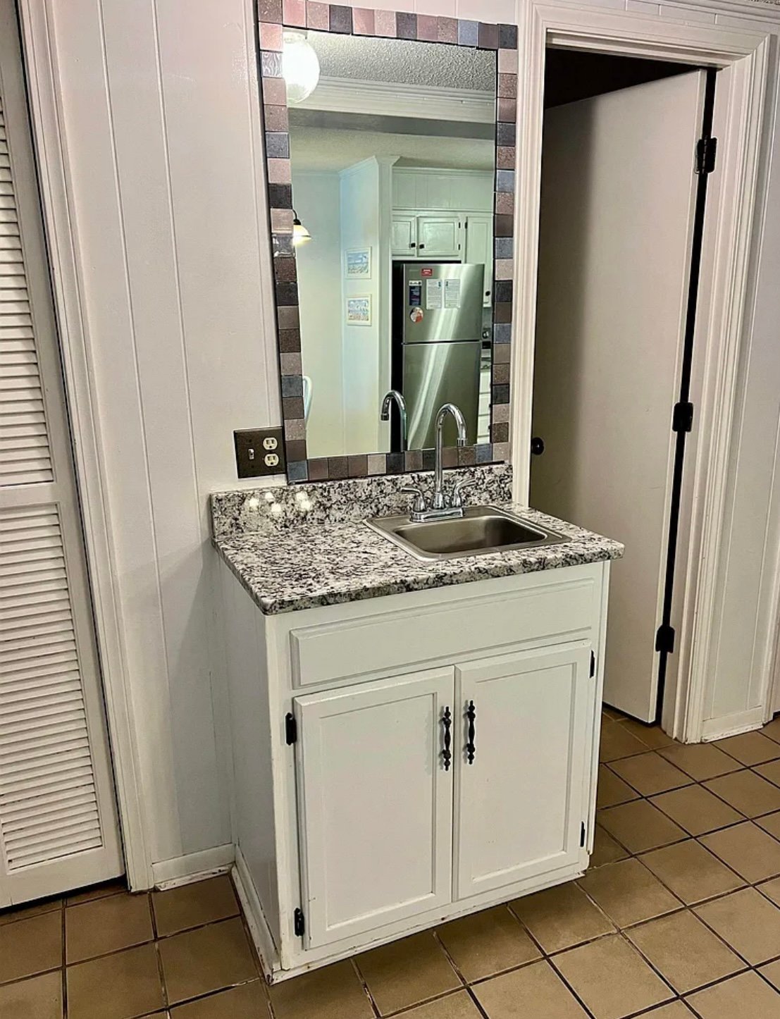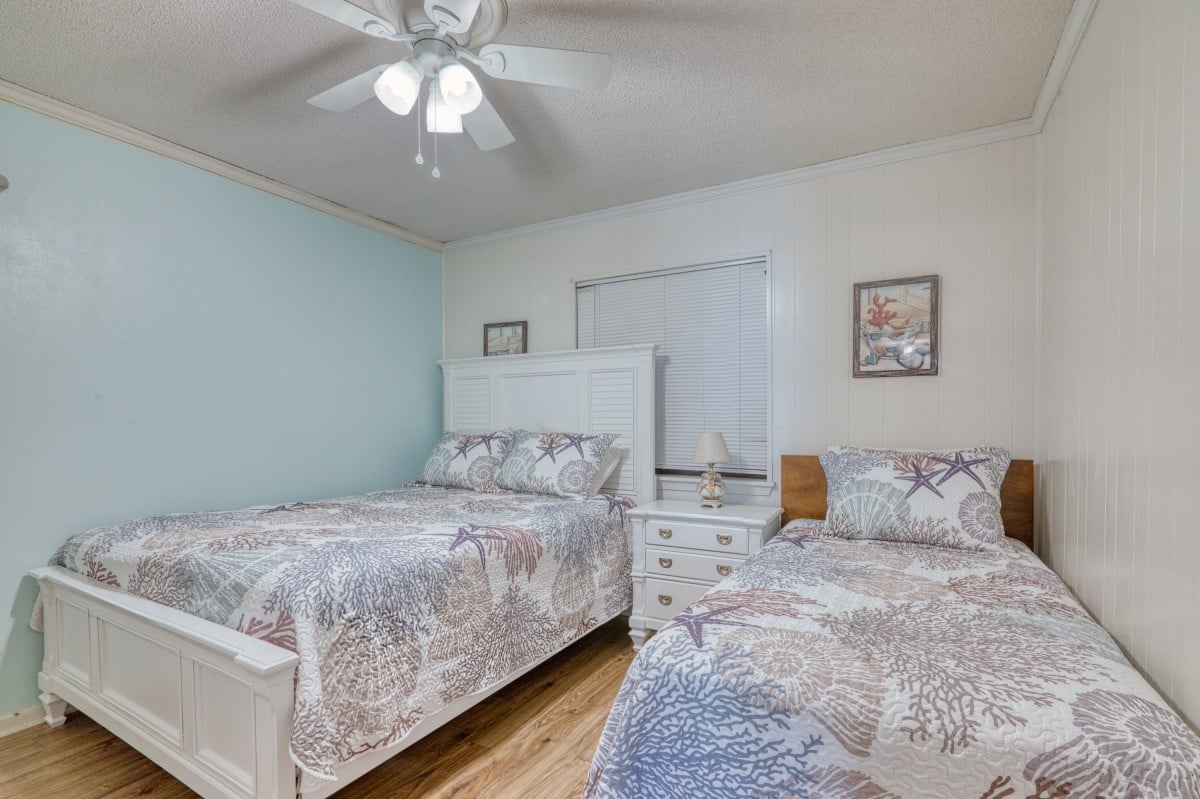 The second bedroom is located down the hall and includes both a full-size bed and a twin bed, making it a great setup for kids or friends. A nightstand sits between the beds, and a window brightens the room with natural light. This room also includes a ceiling fan and a private closet, giving you space to fully unpack and settle in.