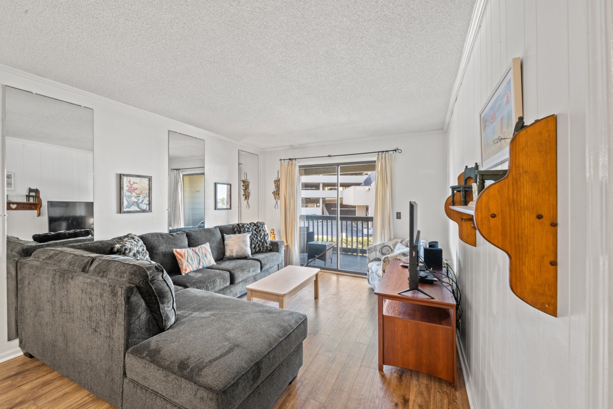 Just past the kitchen, there's a dining area with seating for four. The open-concept layout flows directly into the living room, where a spacious sectional sofa provides plenty of seating for everyone. Positioned in front of a large flat-screen TV, it's the perfect spot to unwind after a day at the beach. Step out onto the private balcony and enjoy a cup of coffee or a glass of wine while taking in the beautiful ocean views.