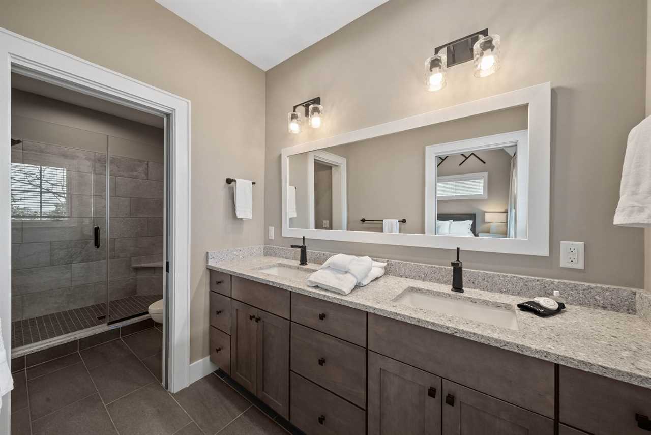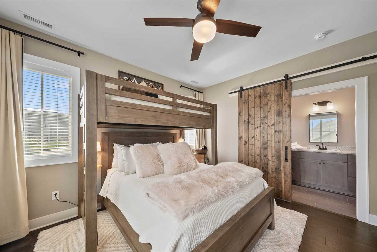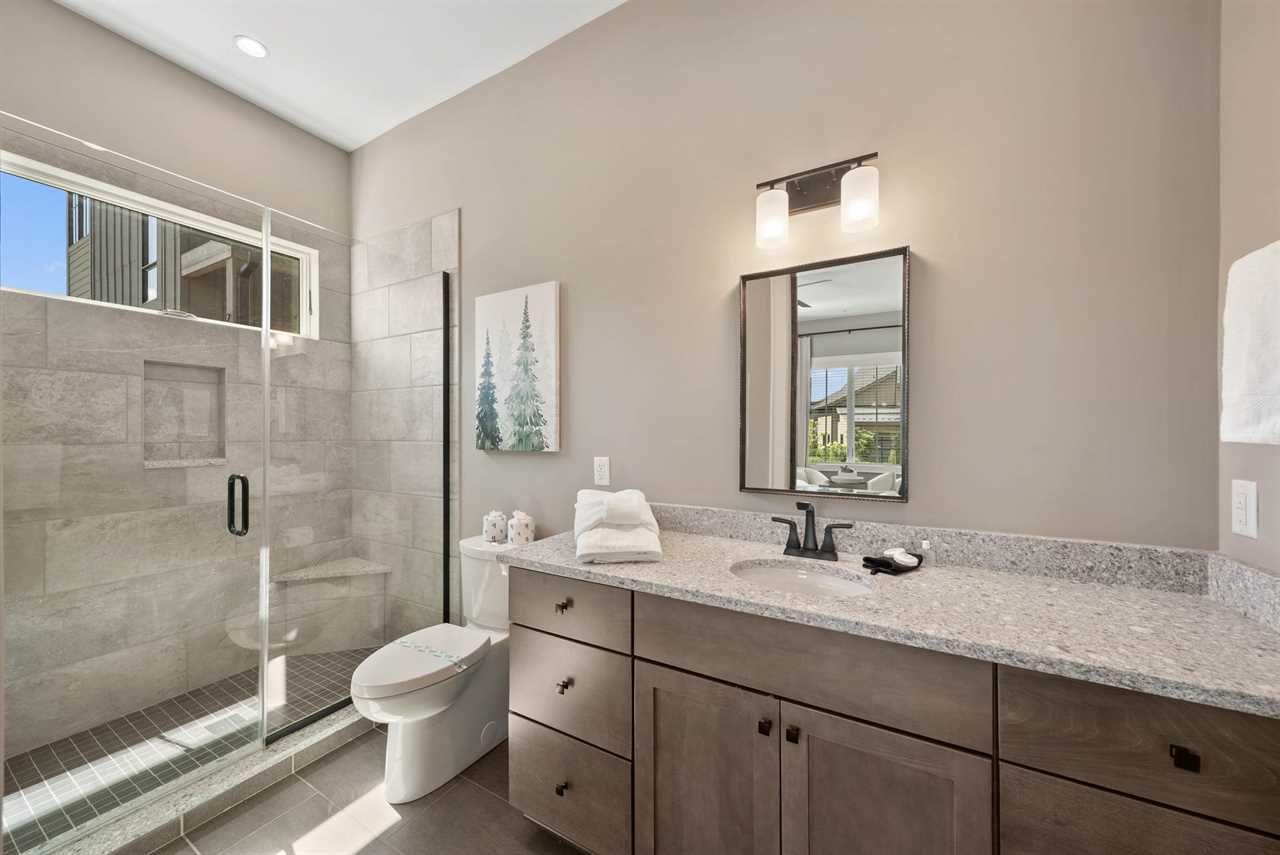 - Upper-Level Bunk Room: Queen bed with twin bunk overhead, ensuite bath, TV, and cozy bean bag chairs.