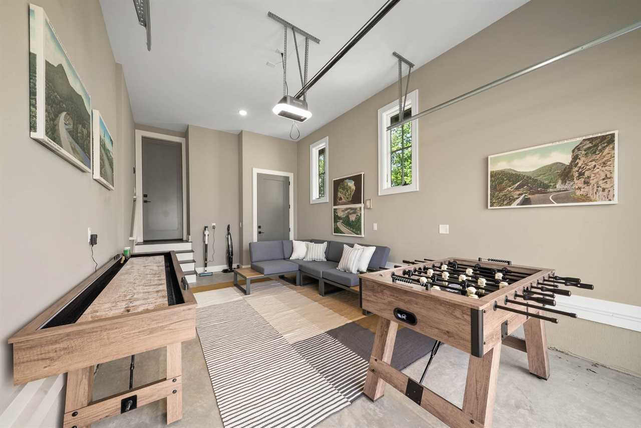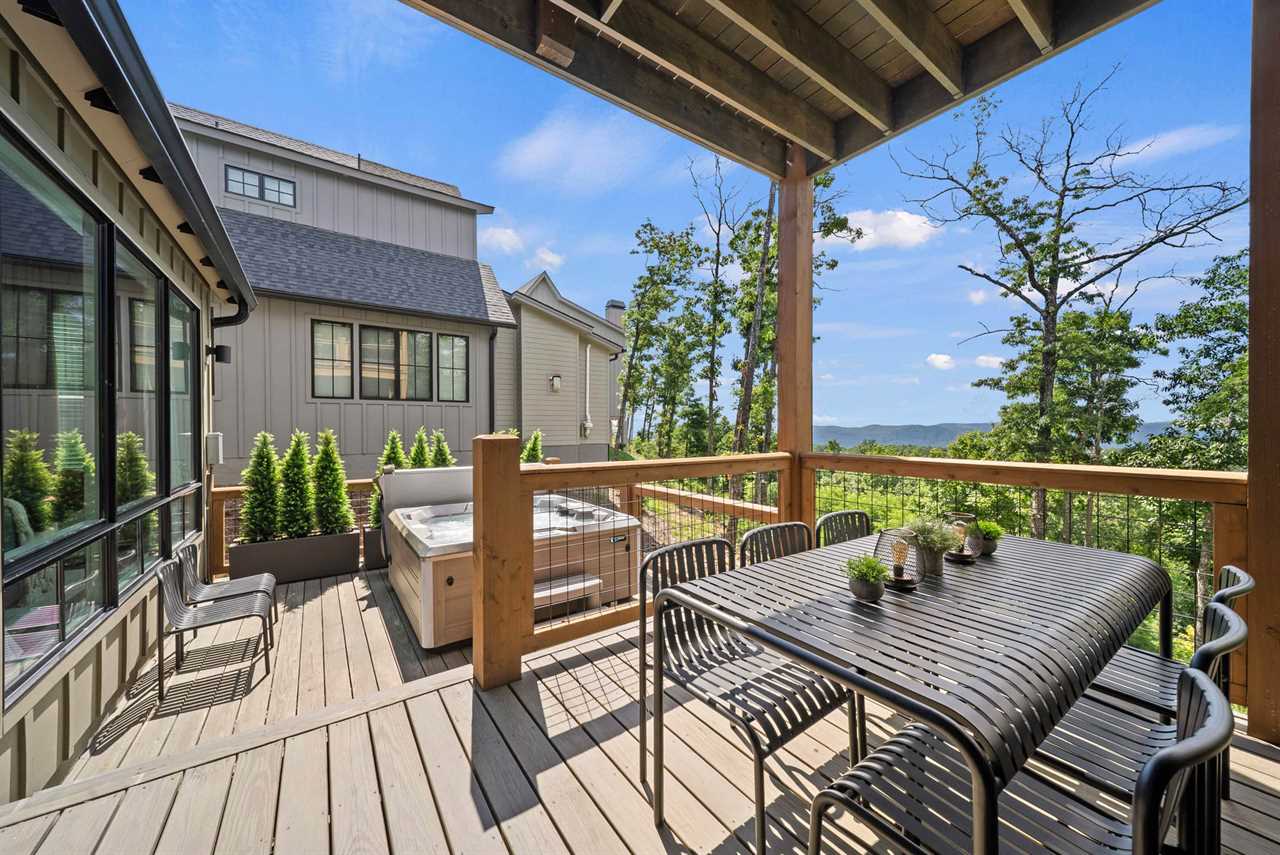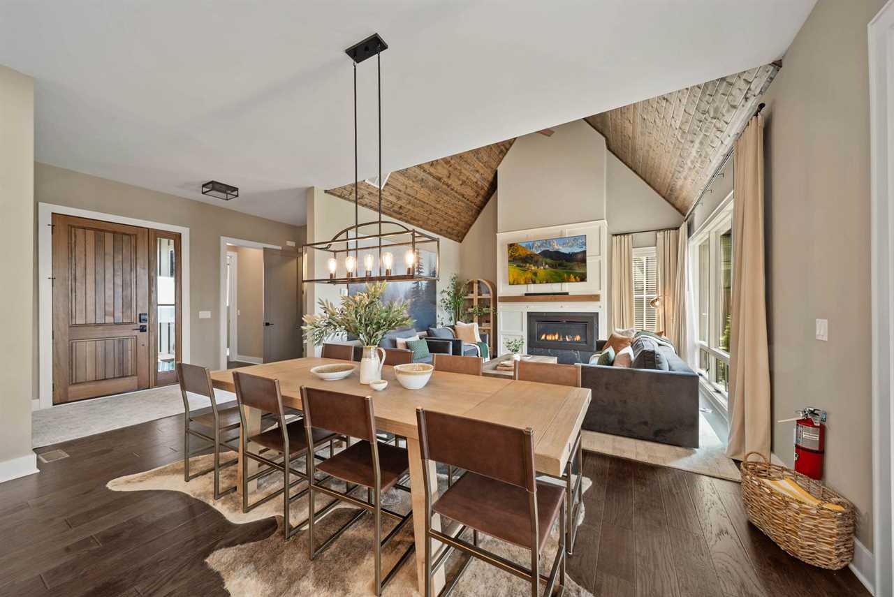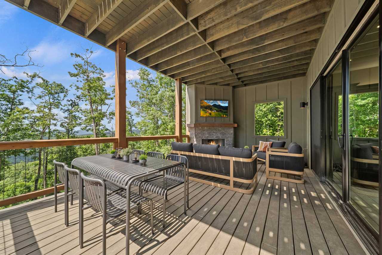 Step inside to a sunlit open floor plan, where the great room invites you to unwind with plush seating arranged around a gas fireplace and large TV. Stunning wall art and high-end finishes create a refined yet welcoming ambiance. The adjoining gourmet kitchen, with its premium appliances and generous counter space, makes cooking and entertaining a delight. A spacious dining area completes the main living space, ideal for sharing meals and memories with family and friends. Floor-to-ceiling windows open onto the main deck, where an inviting outdoor living area awaits. Gather around the stacked stone wood-burning fireplace, sink into the comfortable seating, or enjoy al fresco meals at the outdoor dining table—all set against sweeping mountain vistas. Just a few steps below, the hot tub deck offers a private spot to soak and take in the view. Entertainment continues in the garage game room, where guests of all ages can enjoy rounds of foosball or shuffleboard in a stylish, comfortable setting.