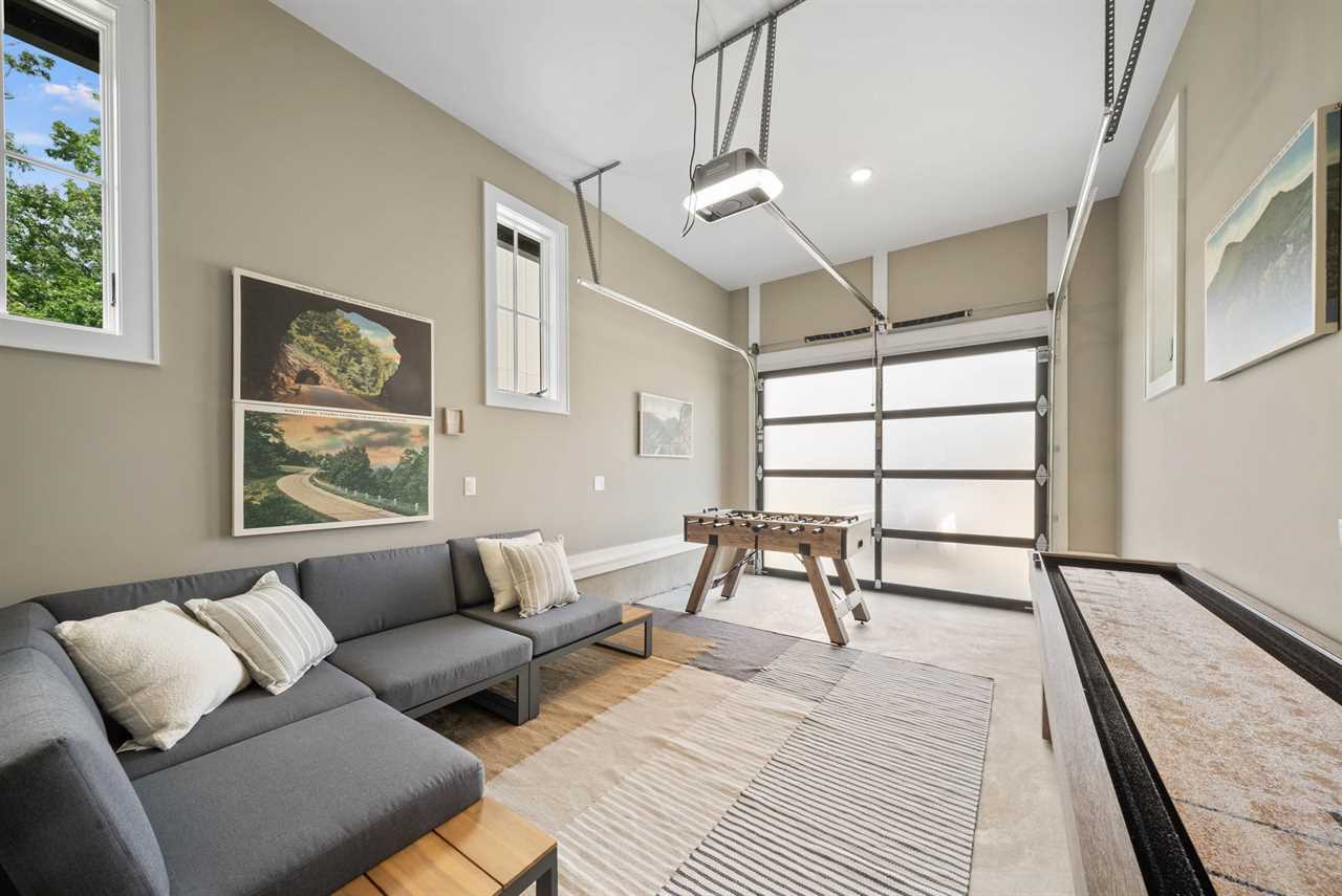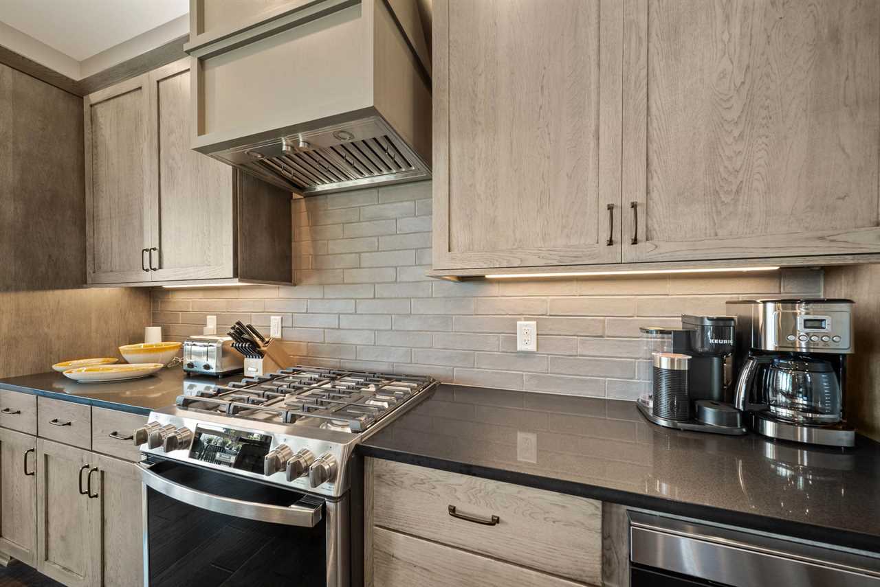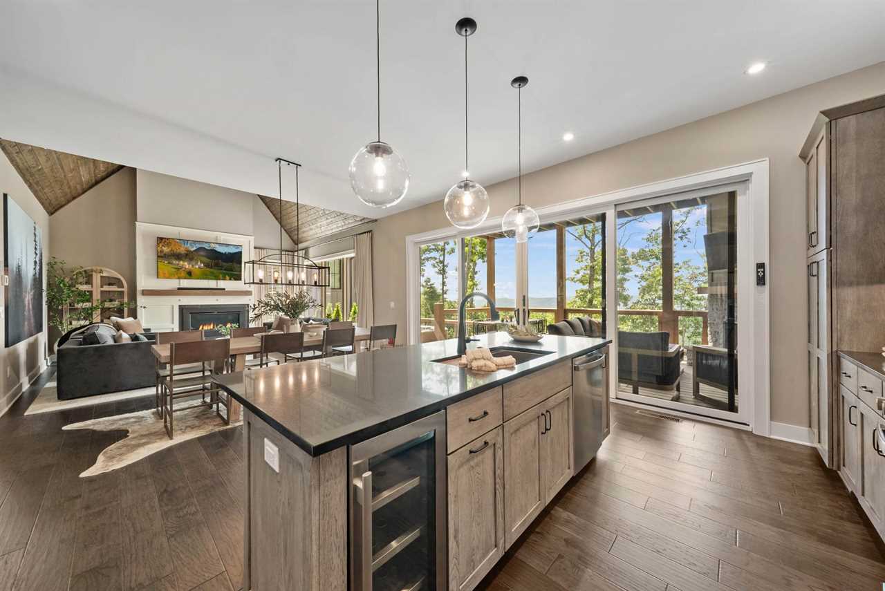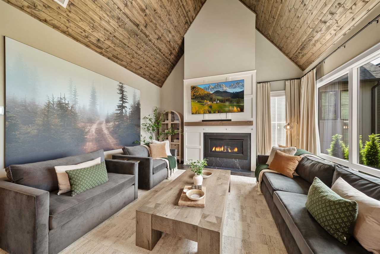 Step inside to a sunlit open floor plan, where the great room invites you to unwind with plush seating arranged around a gas fireplace and large TV. Stunning wall art and high-end finishes create a refined yet welcoming ambiance. The adjoining gourmet kitchen, with its premium appliances and generous counter space, makes cooking and entertaining a delight. A spacious dining area completes the main living space, ideal for sharing meals and memories with family and friends. Floor-to-ceiling windows open onto the main deck, where an inviting outdoor living area awaits. Gather around the stacked stone wood-burning fireplace, sink into the comfortable seating, or enjoy al fresco meals at the outdoor dining table—all set against sweeping mountain vistas. Just a few steps below, the hot tub deck offers a private spot to soak and take in the view. Entertainment continues in the garage game room, where guests of all ages can enjoy rounds of foosball or shuffleboard in a stylish, comfortable setting.