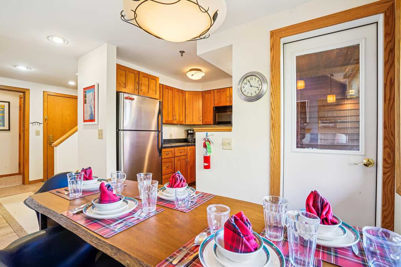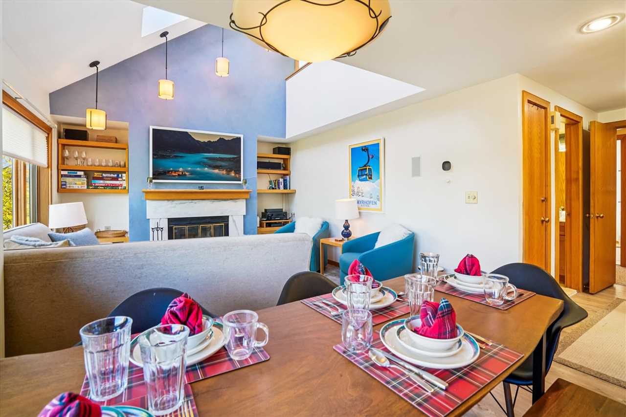 The open living area features a wood-burning fireplace, creating the perfect spot to unwind after a day on the slopes. The full kitchen is equipped with everything you need to prepare meals, and the dining area provides plenty of space for everyone to gather and enjoy.