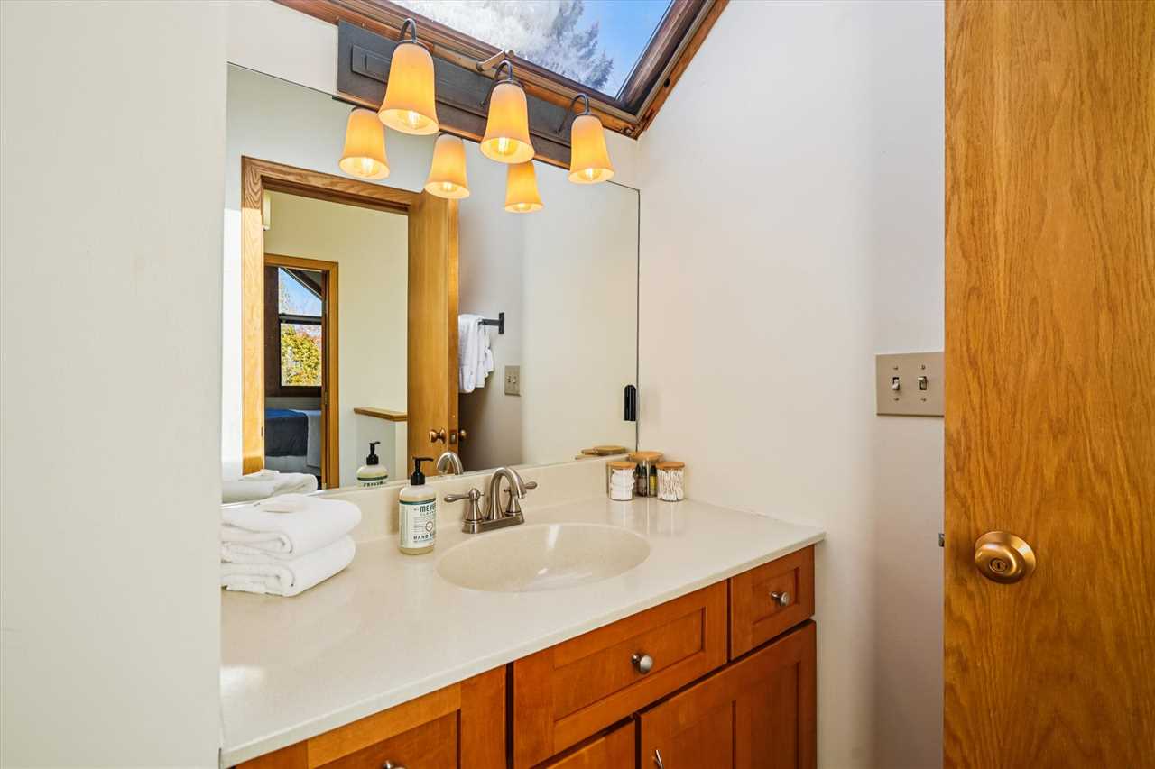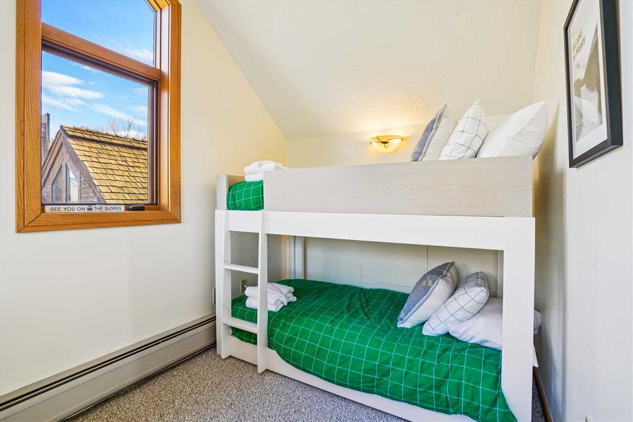 The primary bedroom offers a queen bed, while the second bedroom includes a Queen bed as well. A sleeping nook with twin bunk beds provides additional cozy sleeping space for kids or extra guests. With two and a half bathrooms, there's plenty of room for everyone to get ready and relax.