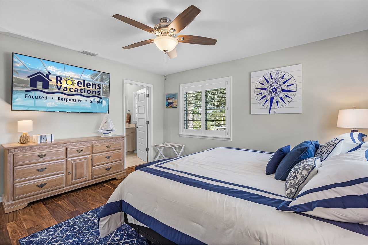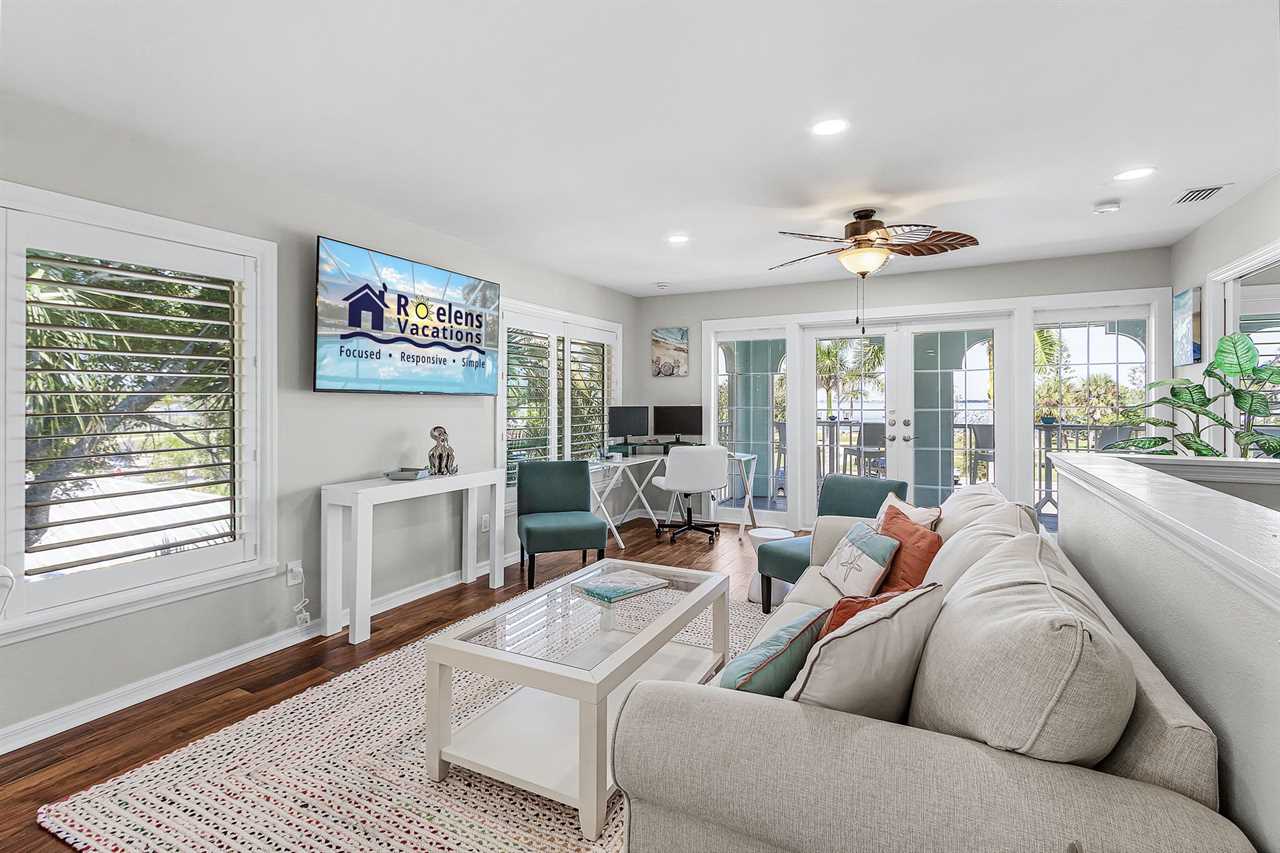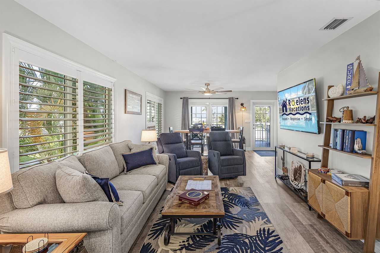 Two Separate Floors with Comfortable Living Spaces and Smart TVs: Unwind in bright, airy lounges on each floor, furnished with plush seating, smart TVs, and coastal-inspired decor—perfect for movie nights or quiet relaxation.