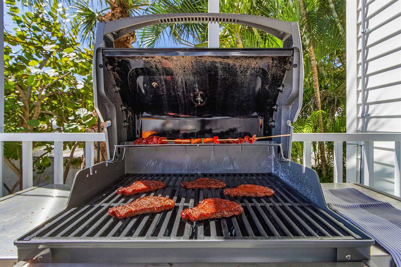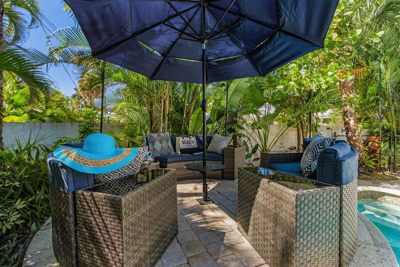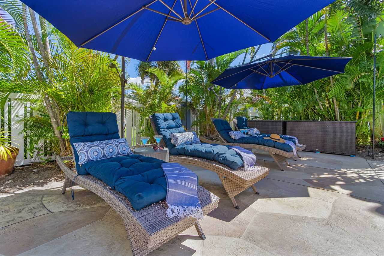 Outdoor Dining & Barbecue Area: Enjoy delicious meals alfresco in the spacious backyard, featuring a dining area and grill—ideal for relaxing barbecues beneath the swaying palms.
