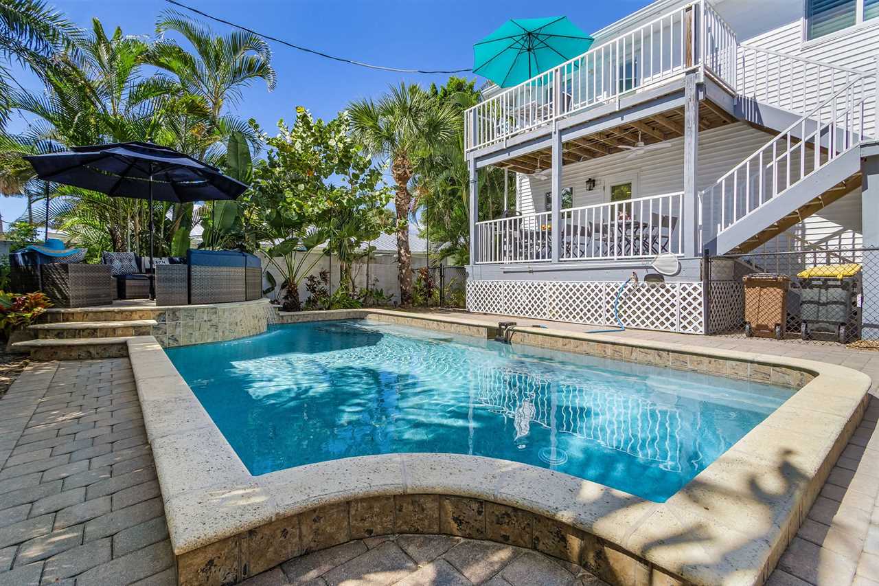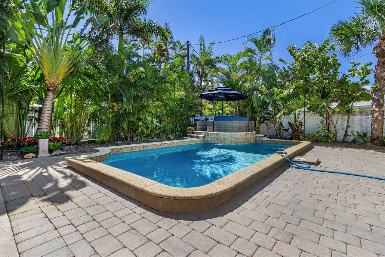 Heated Pool with Tropical Oasis Vibe: Dive into the sparkling heated pool, surrounded by lush palms and tropical landscaping, creating a private sanctuary perfect for swimming, lounging, and soaking up the Florida sunshine.