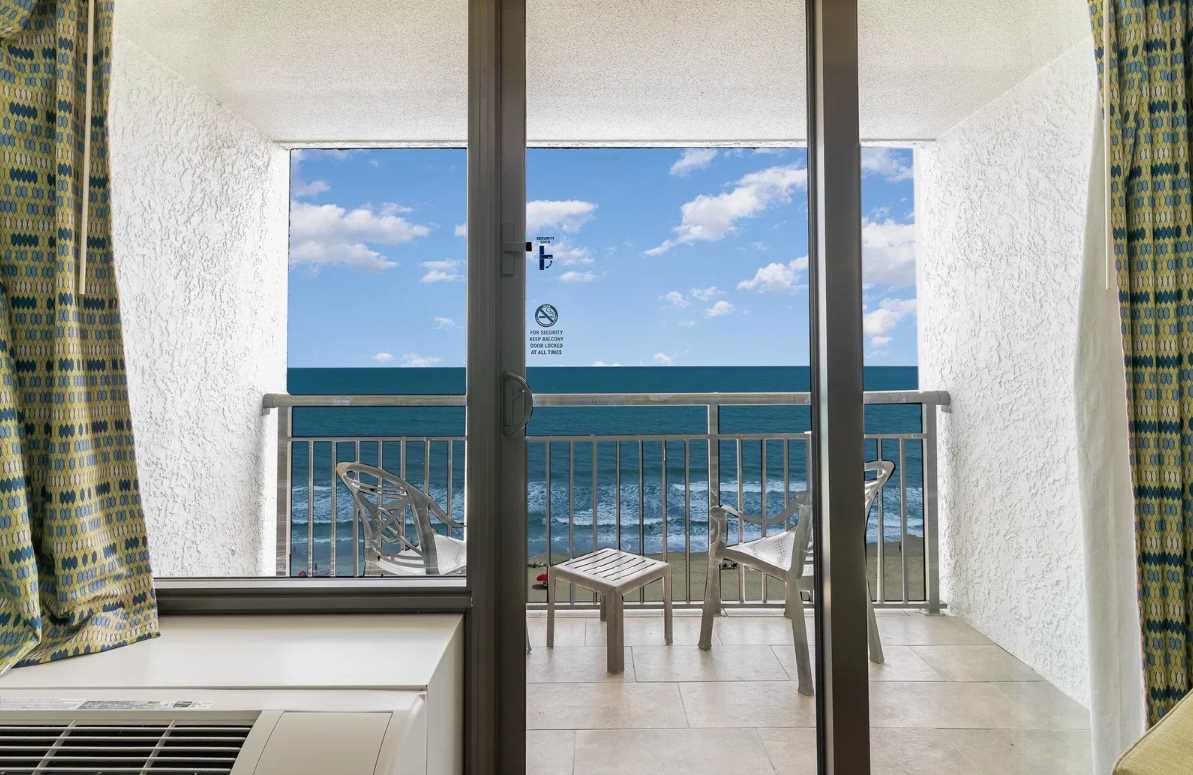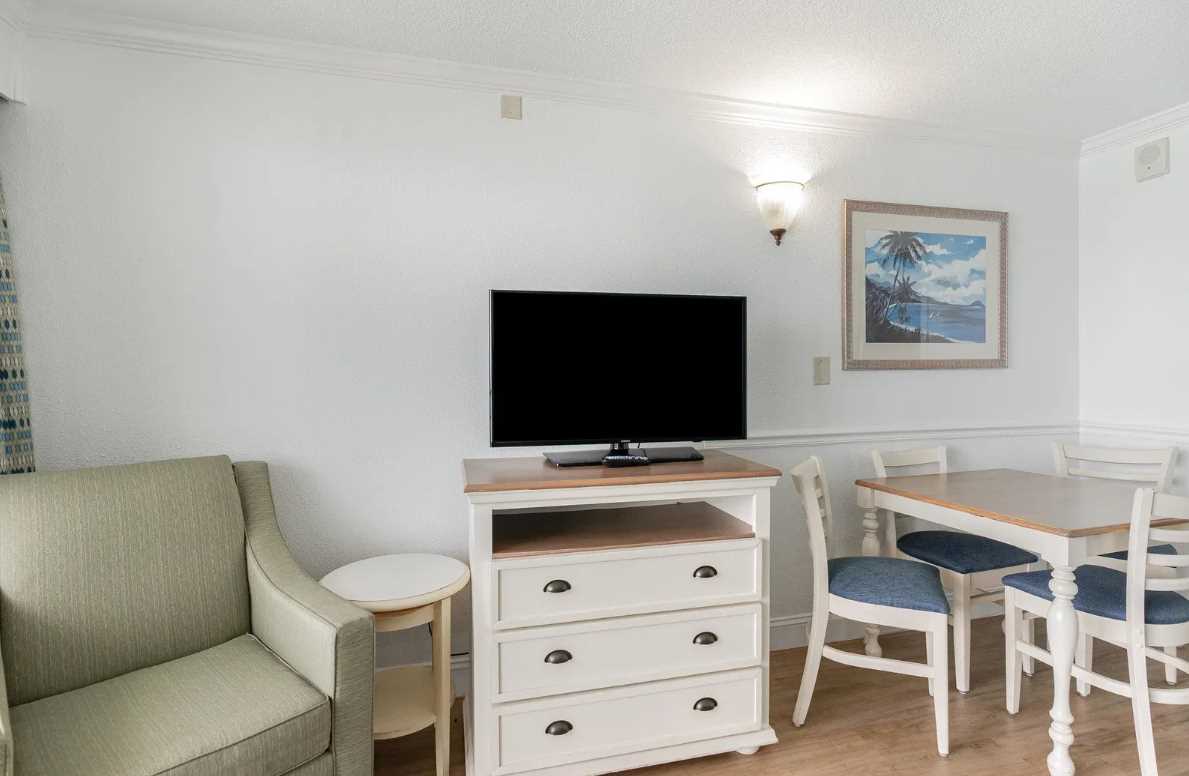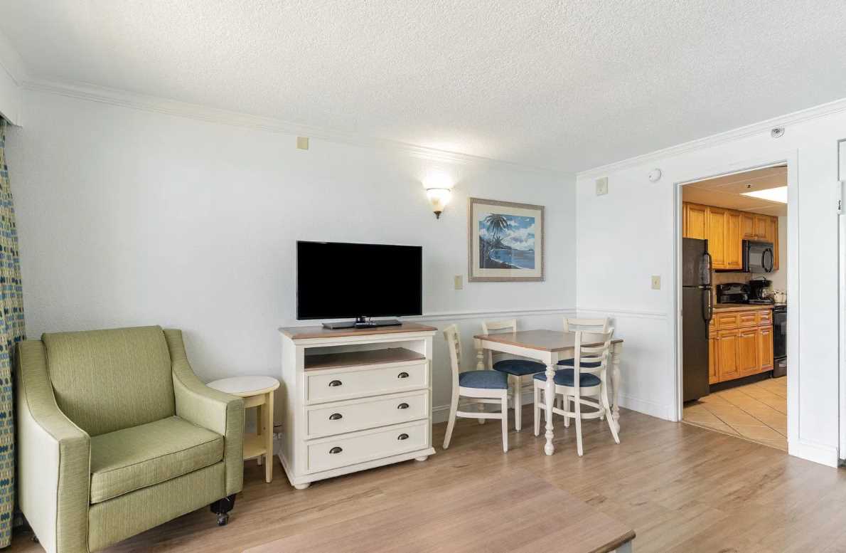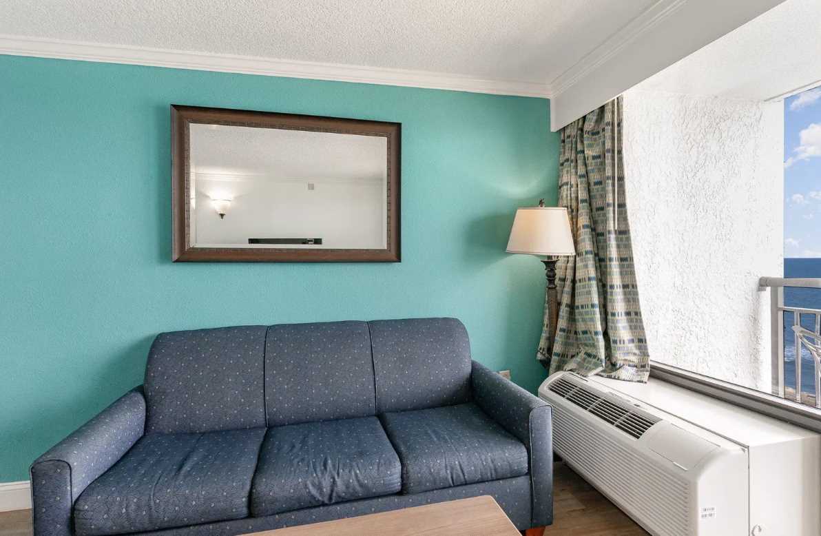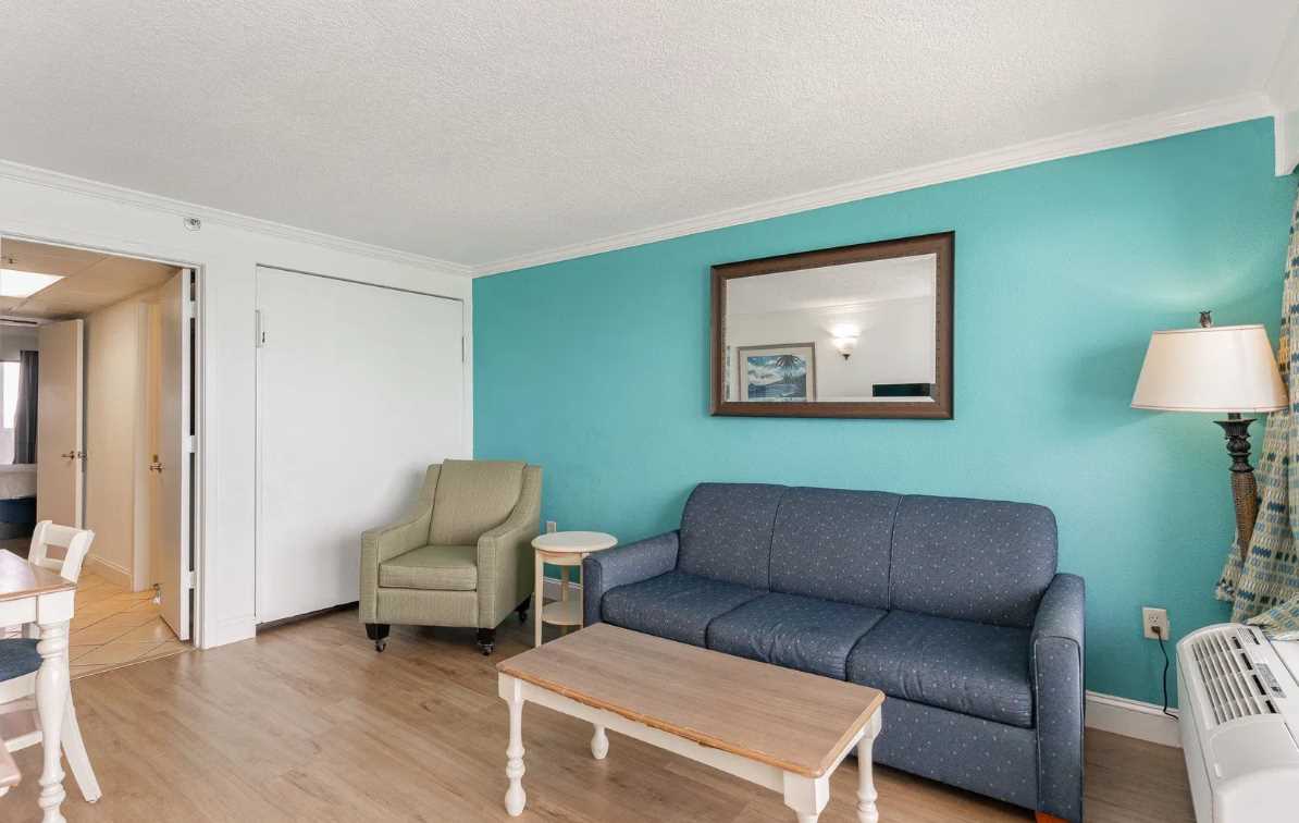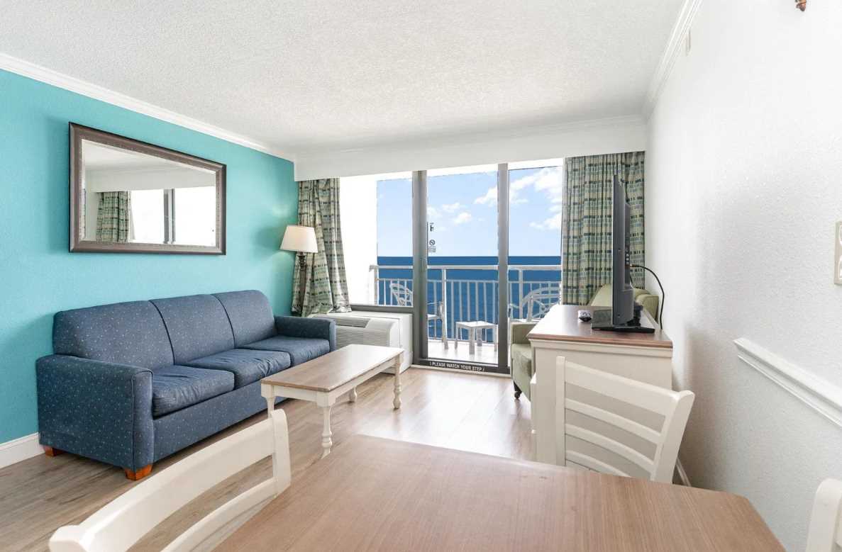The living area is bright, open, and designed for relaxation. It features a comfy couch that converts into a sleeper sofa, a twin-sized murphy bed that tucks away neatly when not in use, an accent chair, coffee table, dresser for additional storage, and a flat screen TV. Large sliding glass doors lead out to your private oceanfront balcony, where you can take in the fresh sea breeze and stunning Atlantic views from the 10th floor. It's the perfect spot for sipping a drink, reading a book, or just enjoying the moment.