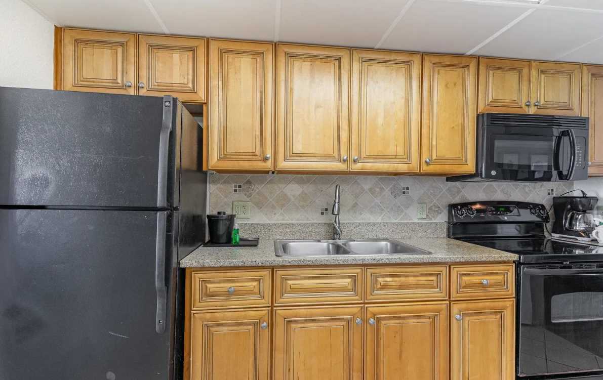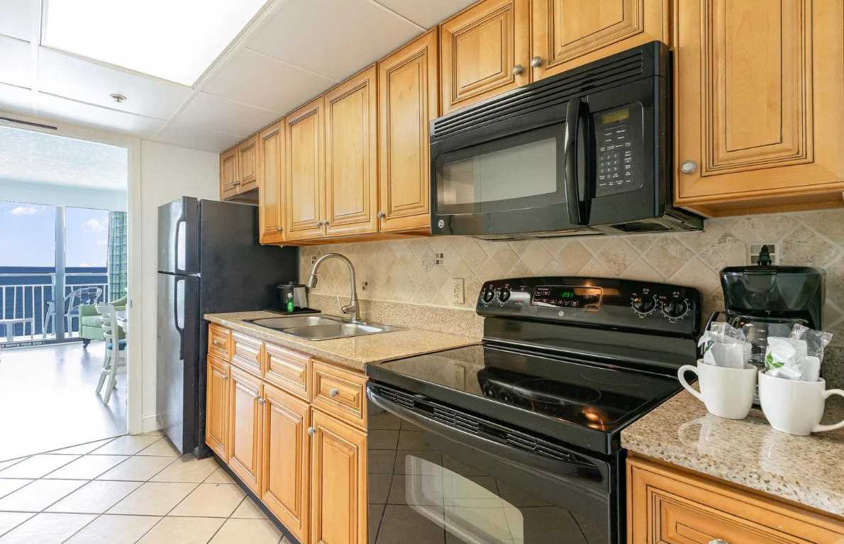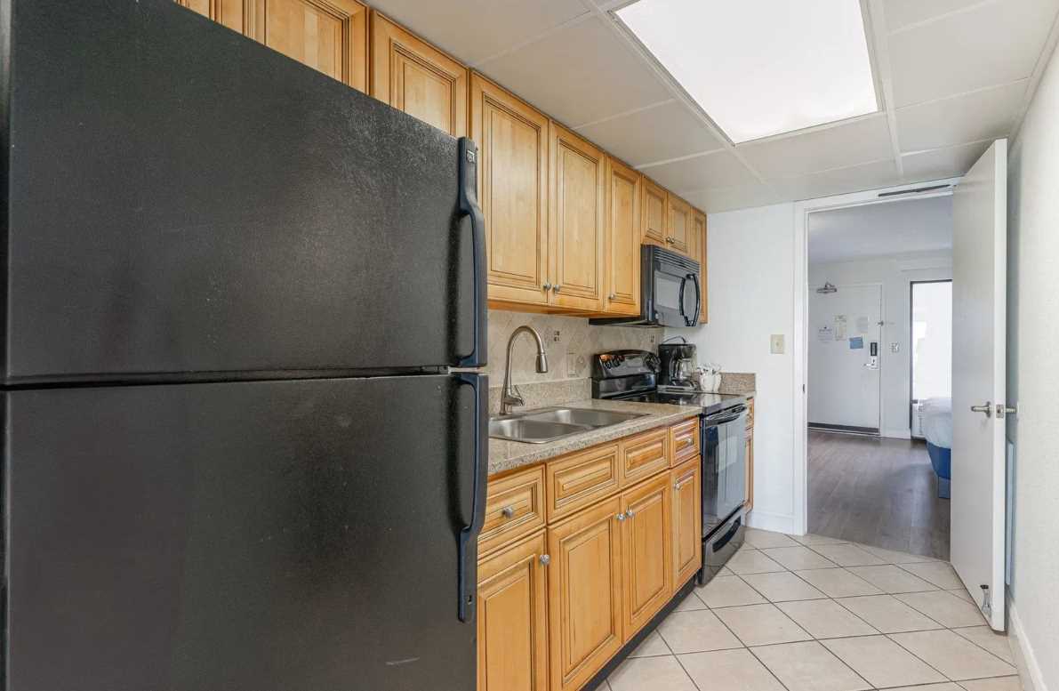 Just beyond the bedroom, guests will find the rest of the living space. The galley-style kitchen is fully equipped with everything you'll need to cook meals during your stay. It features full-size appliances including a refrigerator/freezer, stove and oven, mounted microwave, toaster, and coffee maker. The double sink, ample counter space, and plentiful cabinets make it a practical and efficient space for cooking or quick snacks between beach sessions. We provide all cookware, utensils, plates, glasses, and basic kitchen necessities to keep things simple and convenient. For guests who prefer to dine out, there are several restaurants within a short walk or ride from the Caribbean. In addition, Uber Eats, DoorDash, and Postmates have become very popular food delivery options.