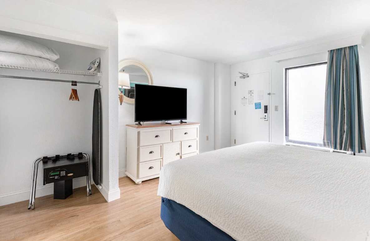 From the moment you walk in, you'll feel right at home. Guests enter the condo directly into the bedroom, where a peaceful and inviting space sets the tone for your stay. This room features a king-sized bed, two nightstands, a large window that lets in beautiful natural light, a spacious closet, a dresser for storage, and a large flat screen TV, everything you need to settle in and unwind after a day on the beach.