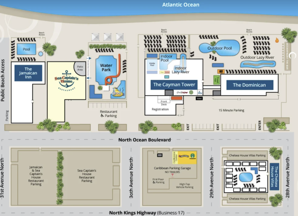 While our guests will have access to the waterpark (located between the resort and Sea Captain's House), oceanfront pool, lazy river, indoor and outdoor hot tubs, indoor pool deck, indoor kiddie pool, fitness center, free parking, and beach access, there are some amenities that our guests cannot access. Our guests are not permitted to use the Tiki Bar, meeting room on the 2nd floor, spa on the 3rd floor, guest laundry and game rooms on the 5th floor, and the pool at the Chelsea House. Many of our guests have stated that they were still able to use the restricted amenities, and they were not declined service. However, we just cannot advertise those amenities. Our rates reflect the restrictions to these amenities, and we apologize for the inconvenience.