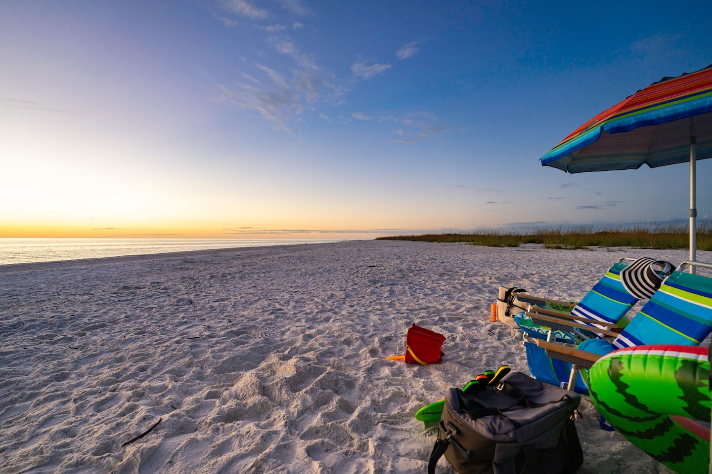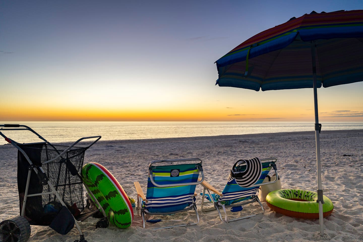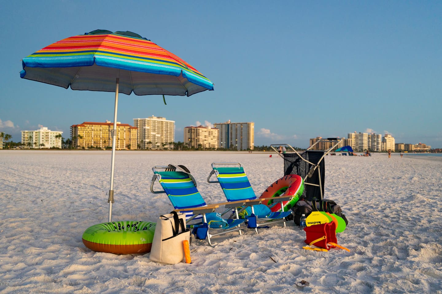 Beach amenities, including beach towels, a beach wagon (with cooler insert), beach chairs, and a beach umbrella