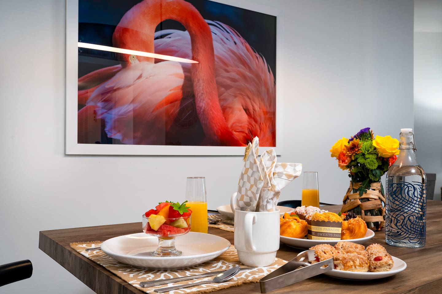 ✔ Living Room: A spacious area with comfortable seating, a flat screen Smart TV, and abundant natural light streaming through large windows, creating a warm and welcoming atmosphere.