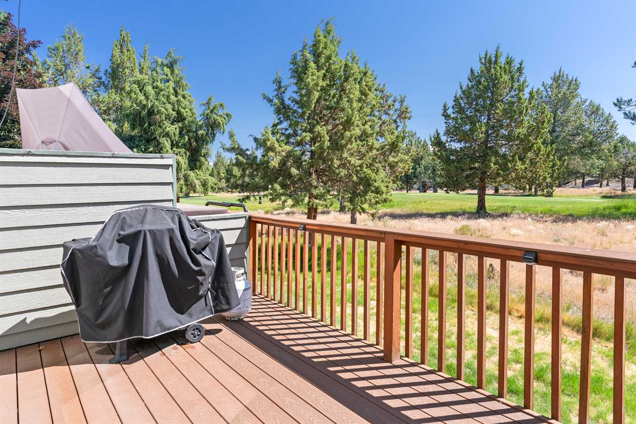 - Deck with grill and patio furniture overlooking Tee 1