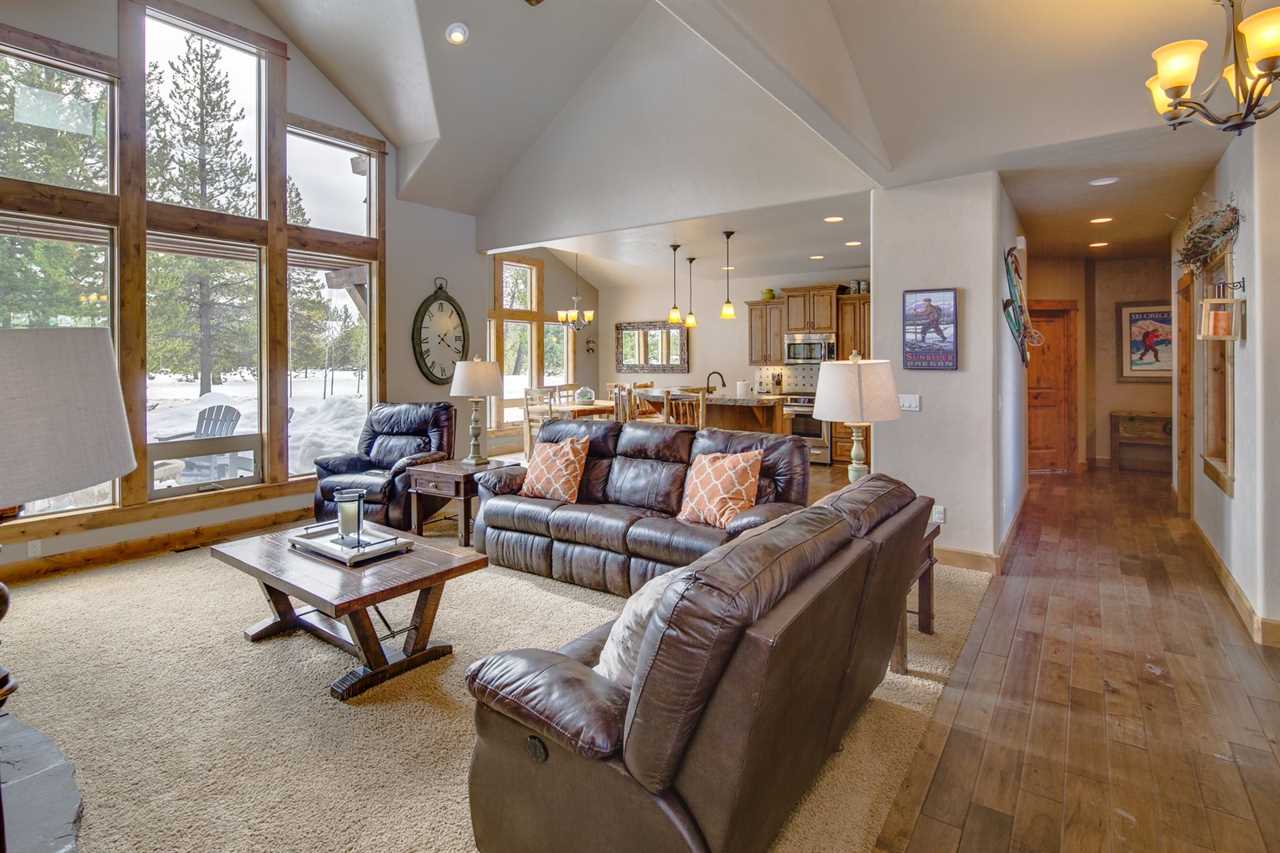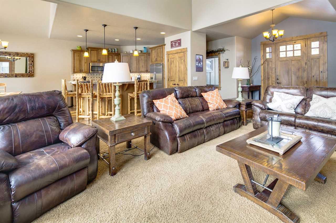 - Spacious living room with leather couches and recliner for family gatherings.