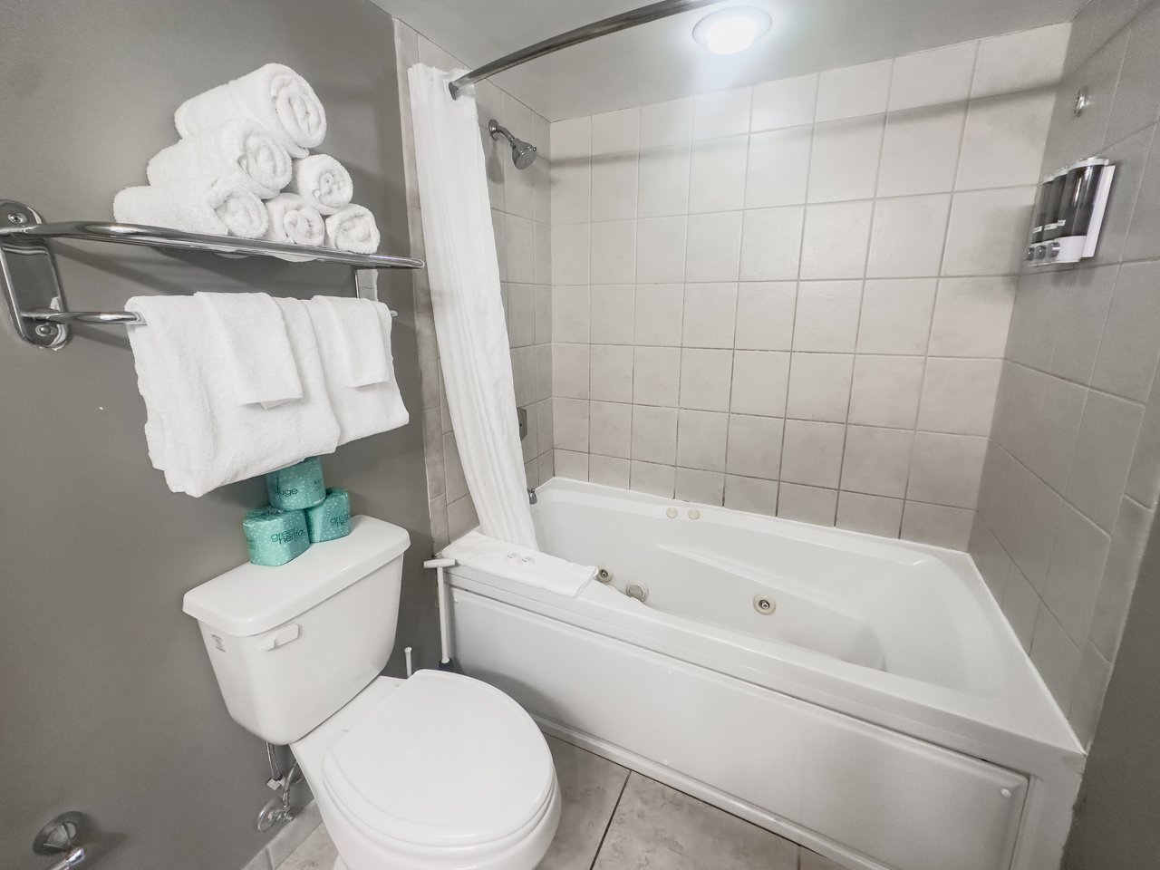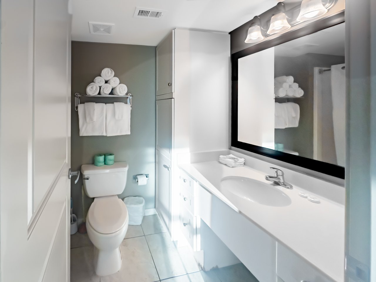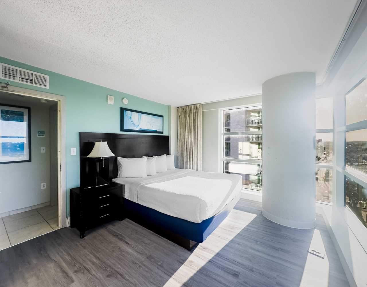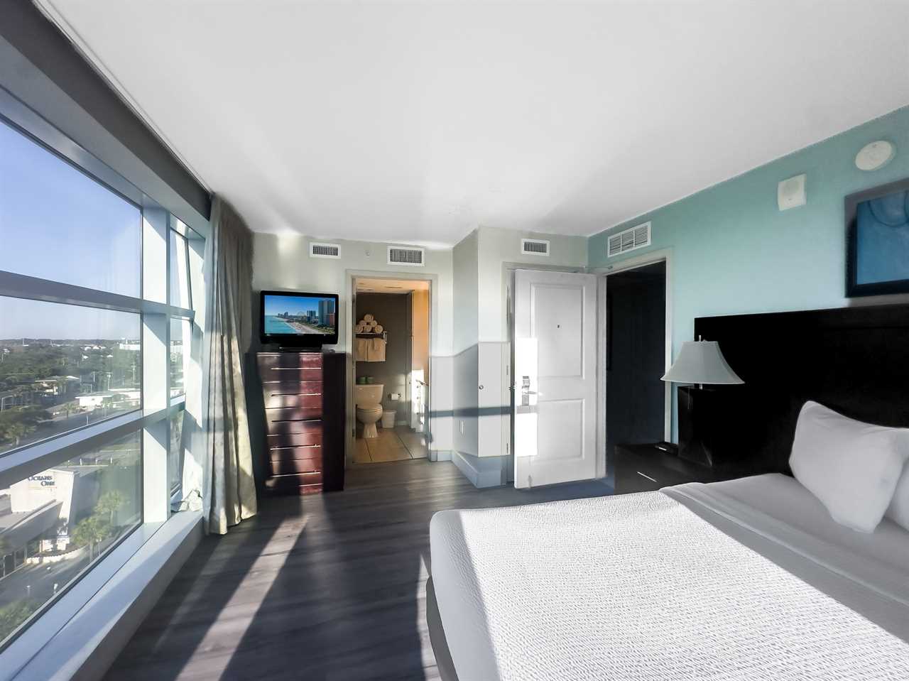Each bedroom offers a serene retreat with its own ensuite bathroom, ensuring privacy and comfort for all guests. The first bedroom features a luxurious king bed, soft lighting, a small dresser, and a TV, with floor-to-ceiling windows framing the endless ocean horizon. The second bedroom is equally inviting, boasting another king bed, dual nightstands, ample storage, and the same sweeping seaside views. Both bathrooms include a combination shower and tub, a wide vanity, mirror, and hair dryer, thoughtfully designed for relaxation and convenience.