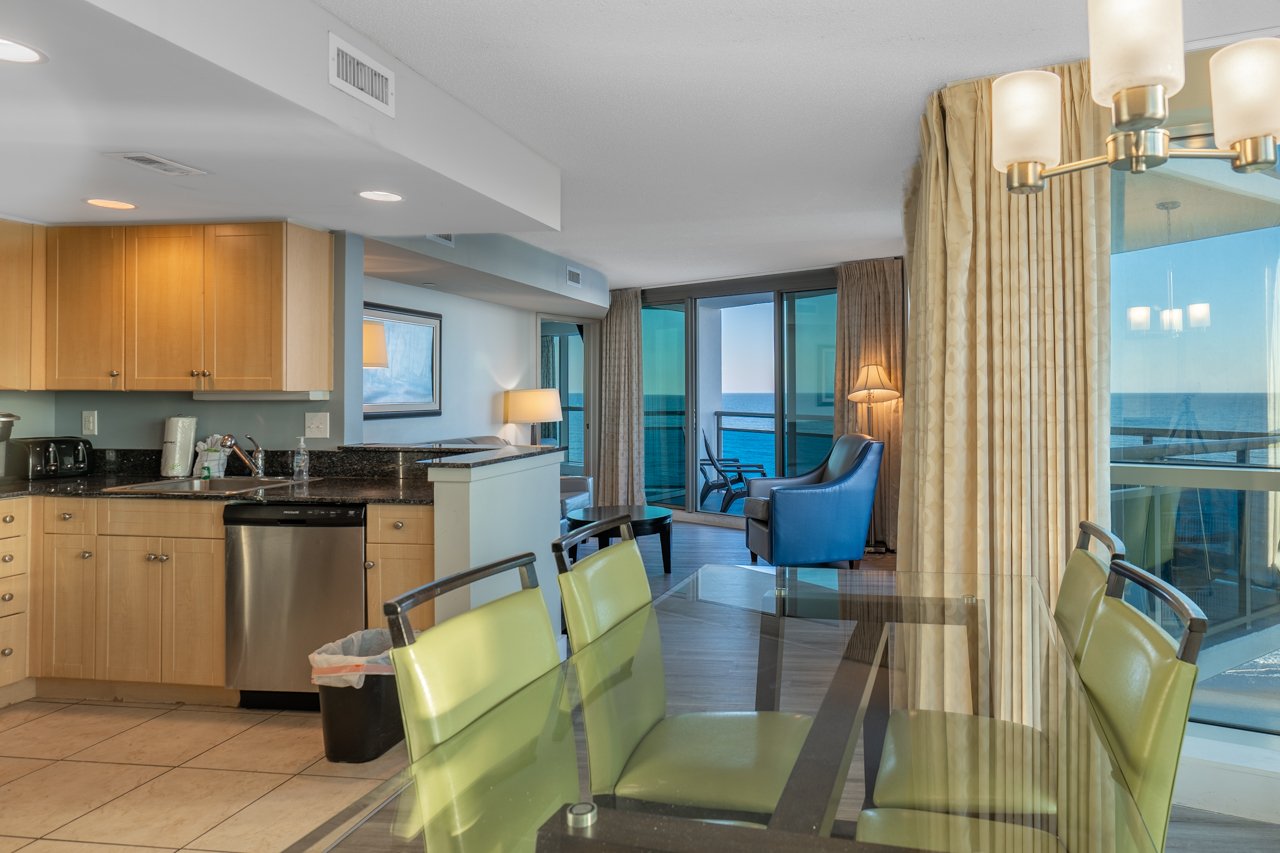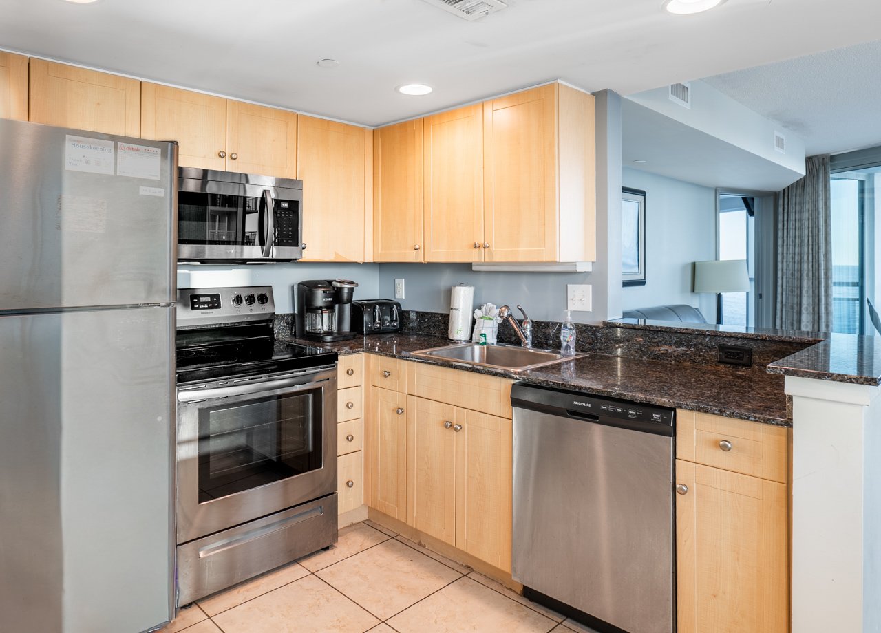 The sleek, modern kitchen makes dining in a pleasure, with stainless steel appliances, including a refrigerator, oven, stove, mounted microwave, and dishwasher, plus a coffee maker and toaster to start your mornings right. Ample granite countertops and fully stocked cabinets provide everything you need to prepare a beachside meal or enjoy local takeout at the spacious glass dining table, which comfortably seats six.