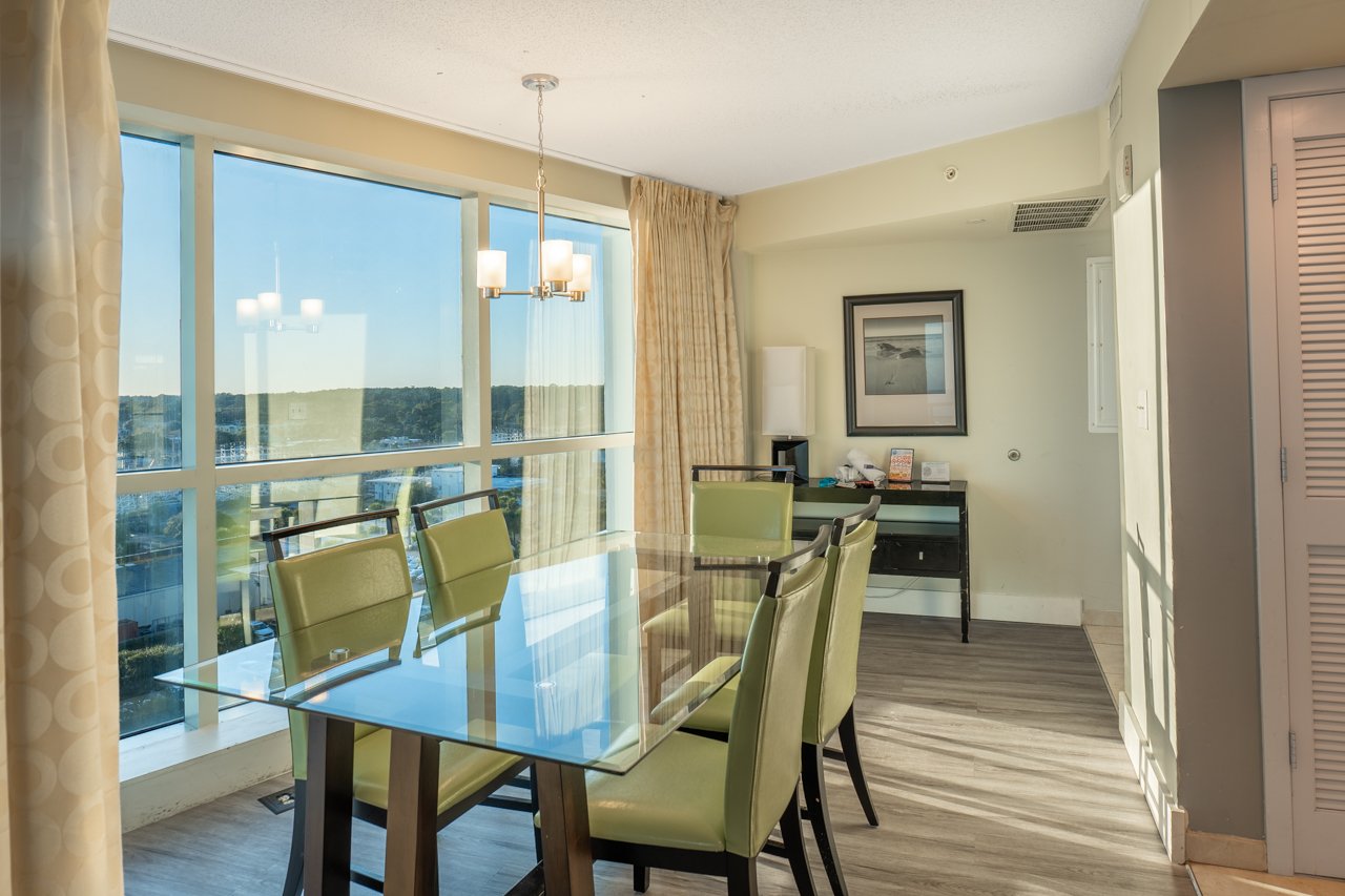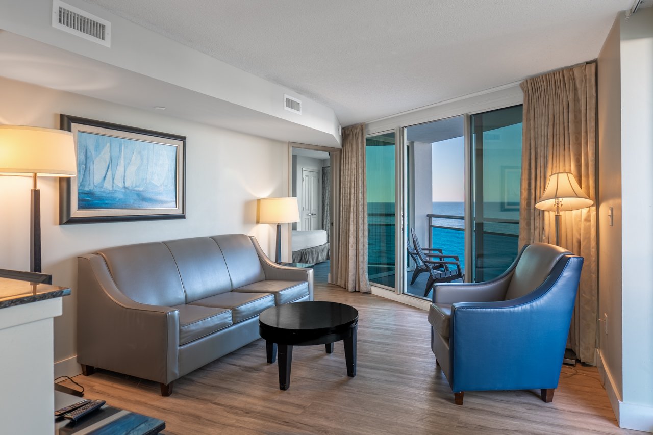 Step inside and feel instantly at ease. The open-concept living and dining area is designed for relaxation and connection, featuring a plush sofa that converts into a queen bed, a cozy accent chair, and a flat-screen TV for movie nights after a day in the sun. Expansive glass walls invite you to soak in panoramic ocean views, while sliding doors lead to a private balcony where you can sip your morning coffee or unwind with the sound of the waves below.
